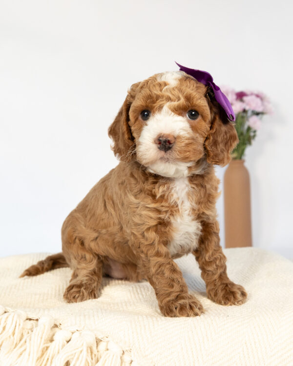 Lady is a multigen mini Cockapoo puppy who will be ready for her fur-ever home around April 20th! Her soft, fluffy coat is hypoallergenic and non-shedding, ensuring endless snuggles without fear of allergic reactions. With a loyal and affectionate temperament, she is the perfect forever friend!