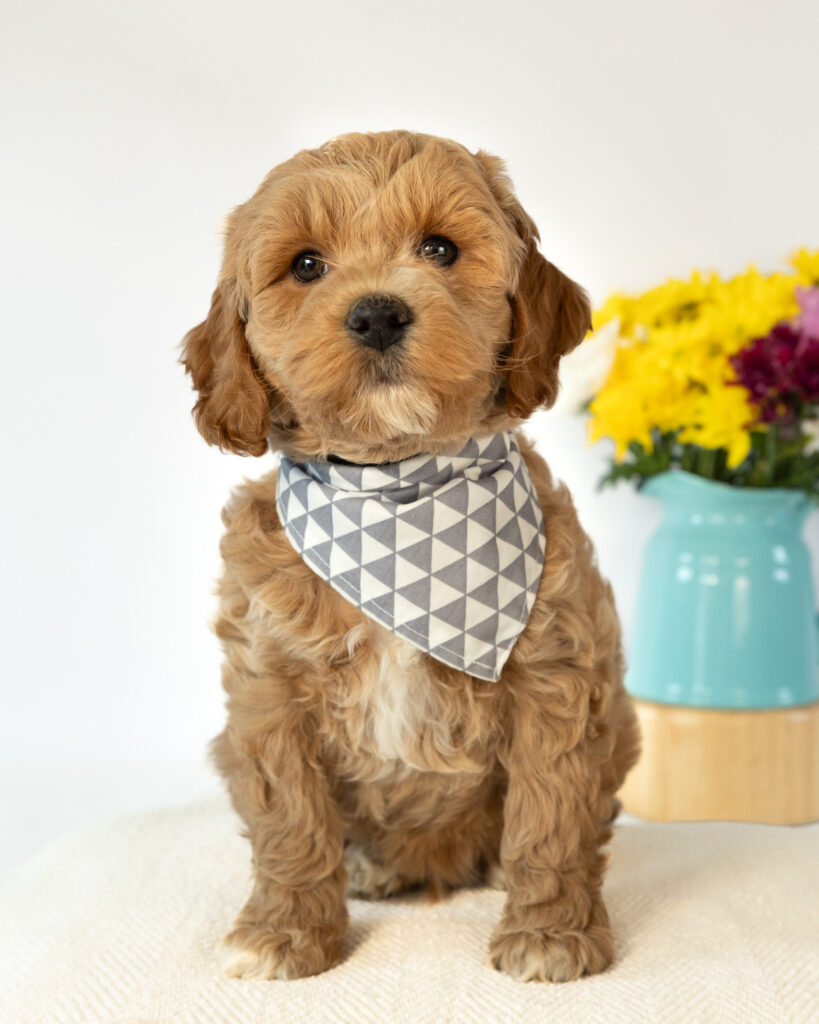 Russell is a multigen mini Cockapoo puppy who will be ready for his fur-ever home around April 20th! His soft, fluffy coat is hypoallergenic and non-shedding, ensuring endless snuggles without fear of allergic reactions. With a loyal and affectionate temperament, he is the perfect forever friend!