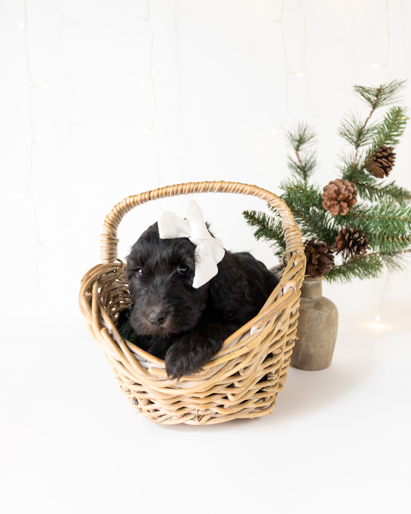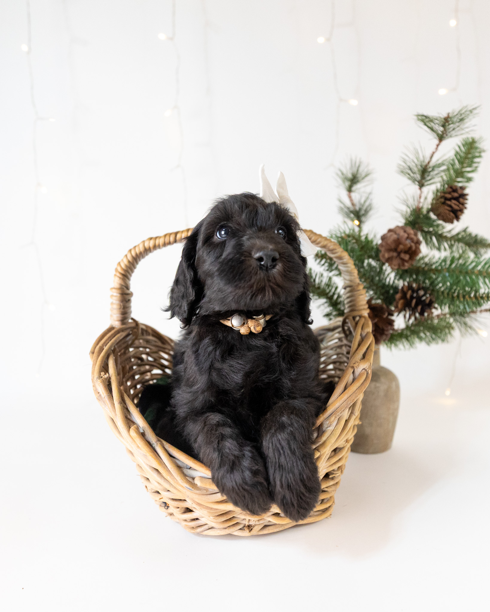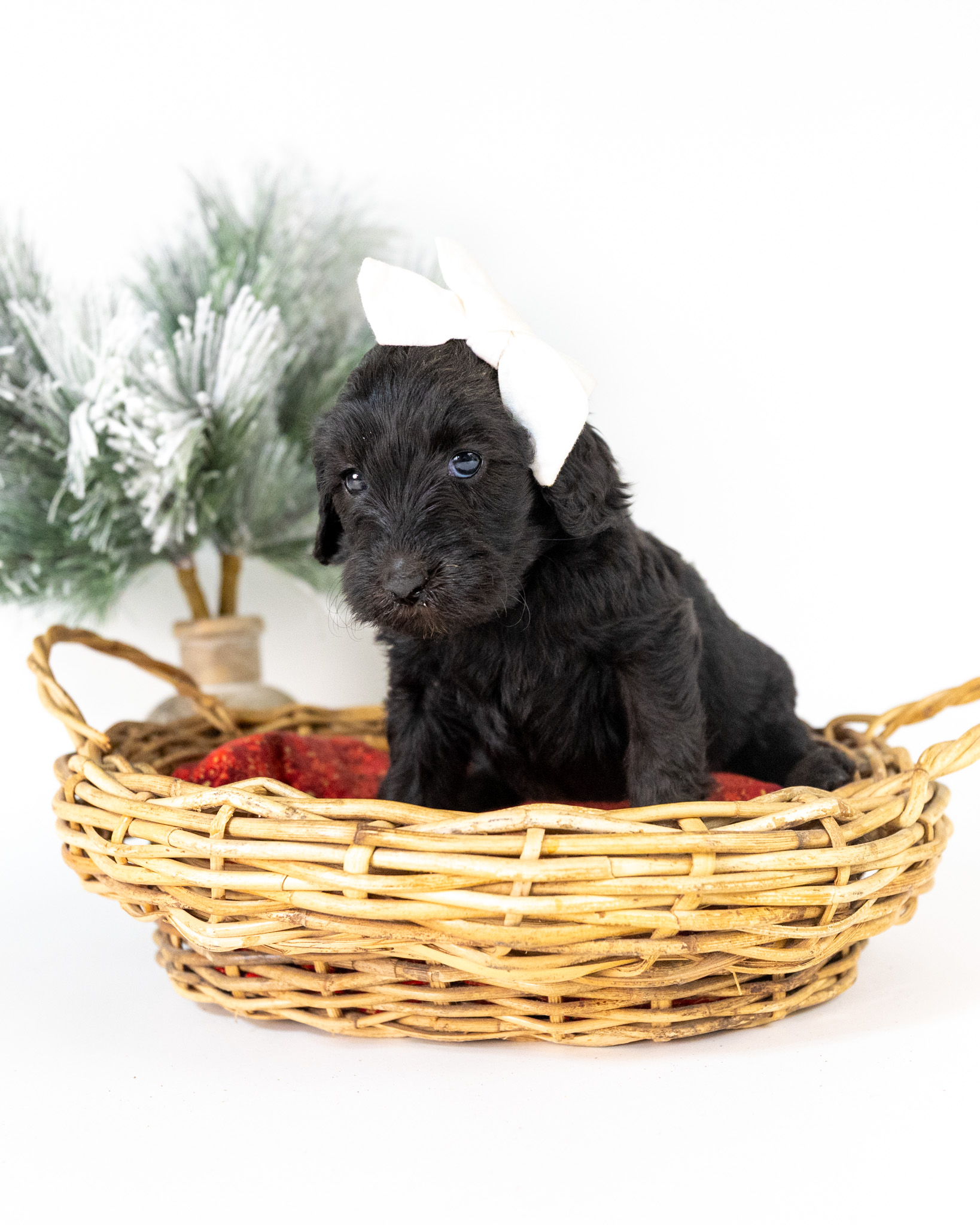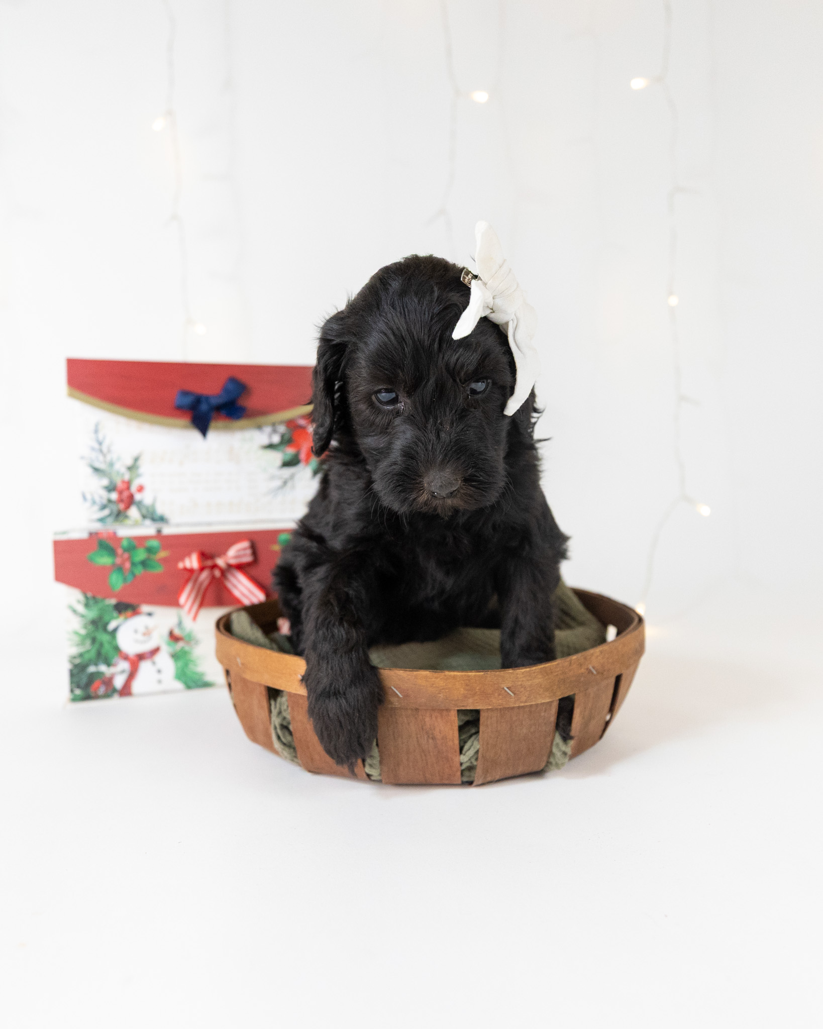 Jazzy is a black  multigen Goldendoodle puppy who will be ready for her fur-ever home around December 16th! Her soft, fluffy coat is hypoallergenic and non-shedding, ensuring endless snuggles without fear of allergic reactions. With a loyal and affectionate temperament, she is the perfect forever friend!