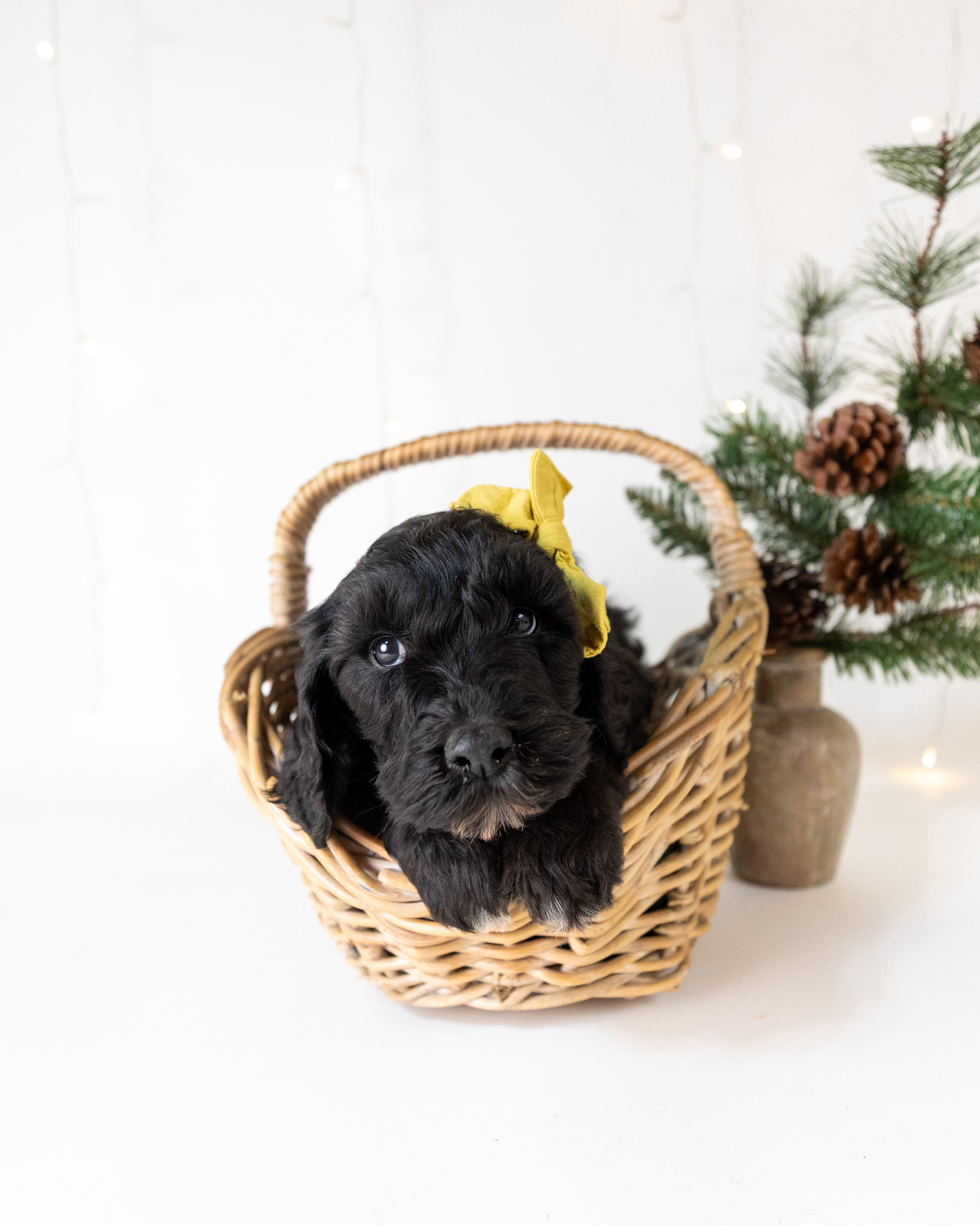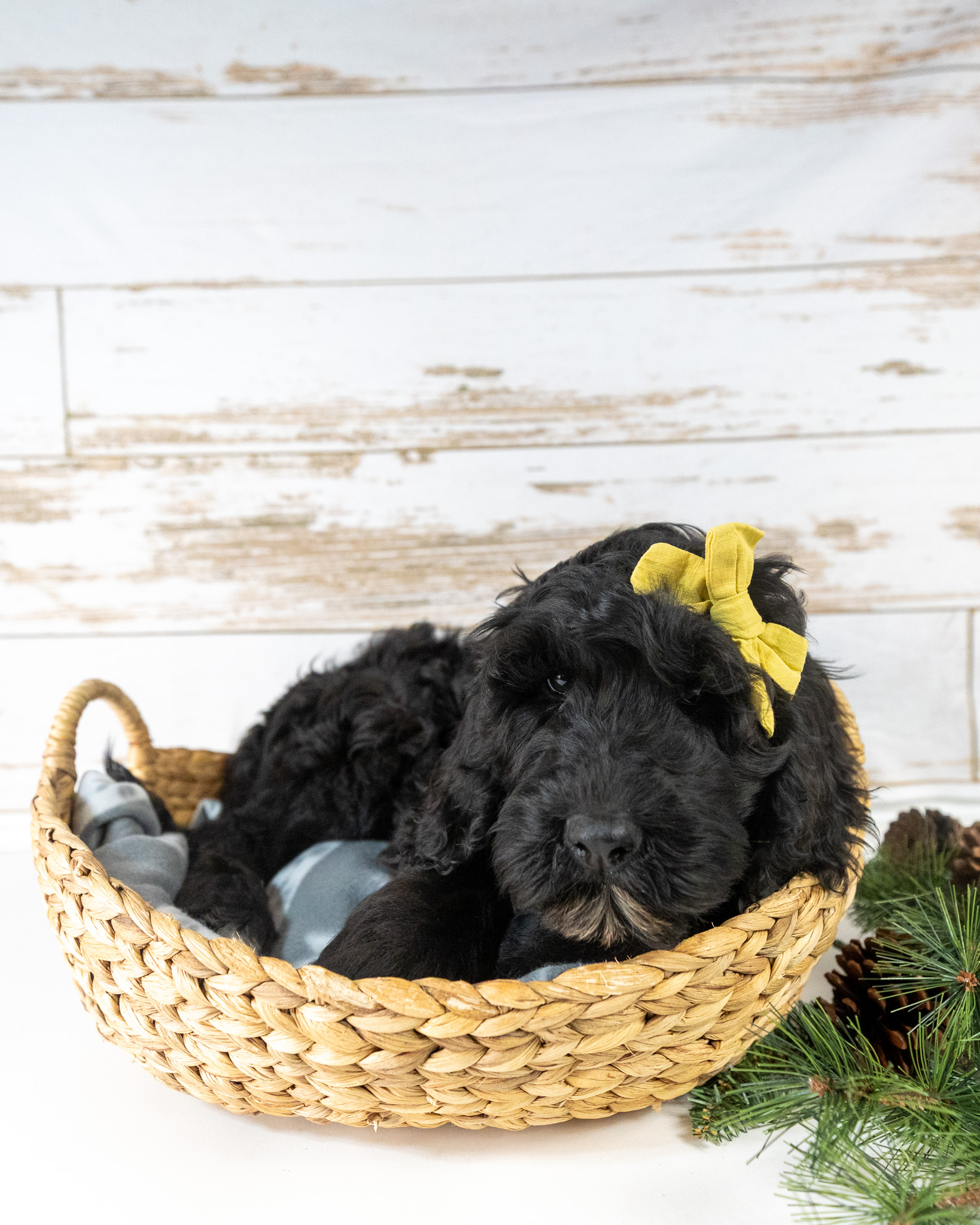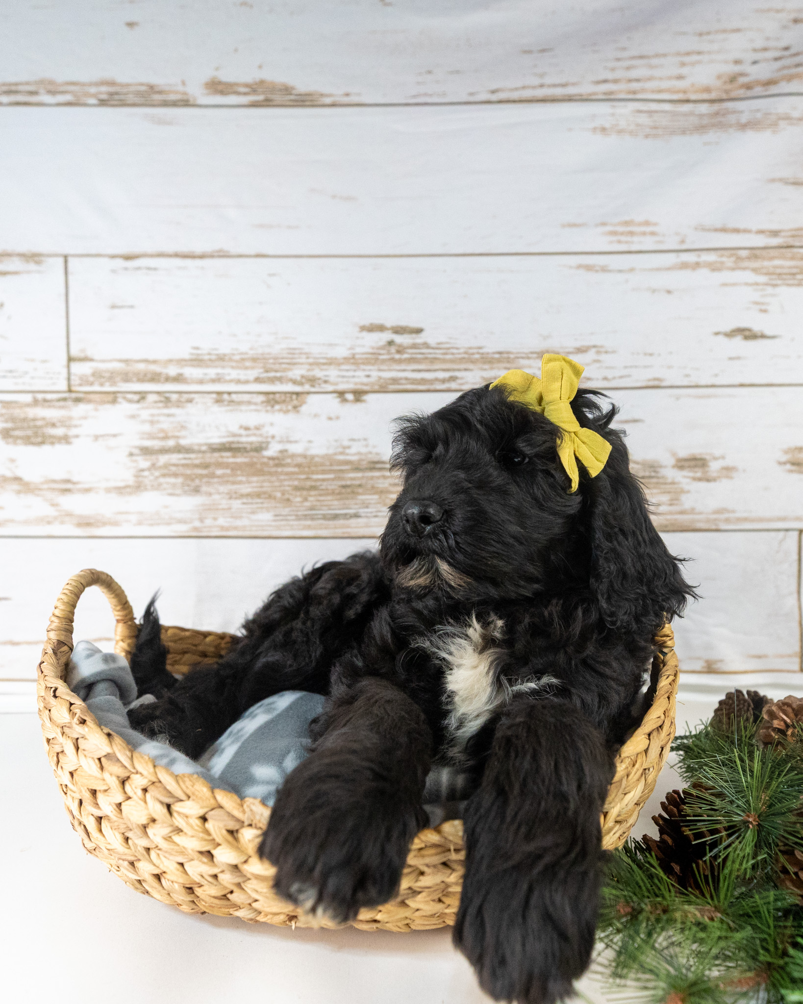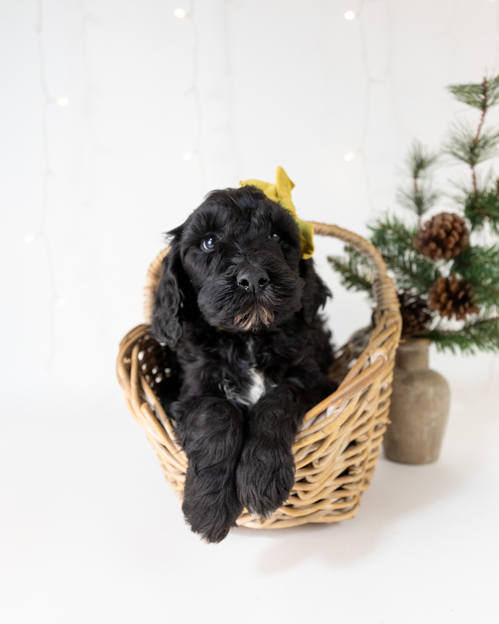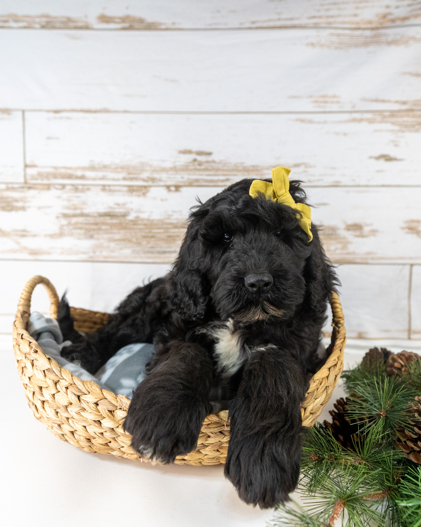 Harmony is a black multigen Goldendoodle puppy who will be ready for her fur-ever home around December 16th! Her soft, fluffy coat is hypoallergenic and non-shedding, ensuring endless snuggles without fear of allergic reactions. With a loyal and affectionate temperament, she is the perfect forever friend!
