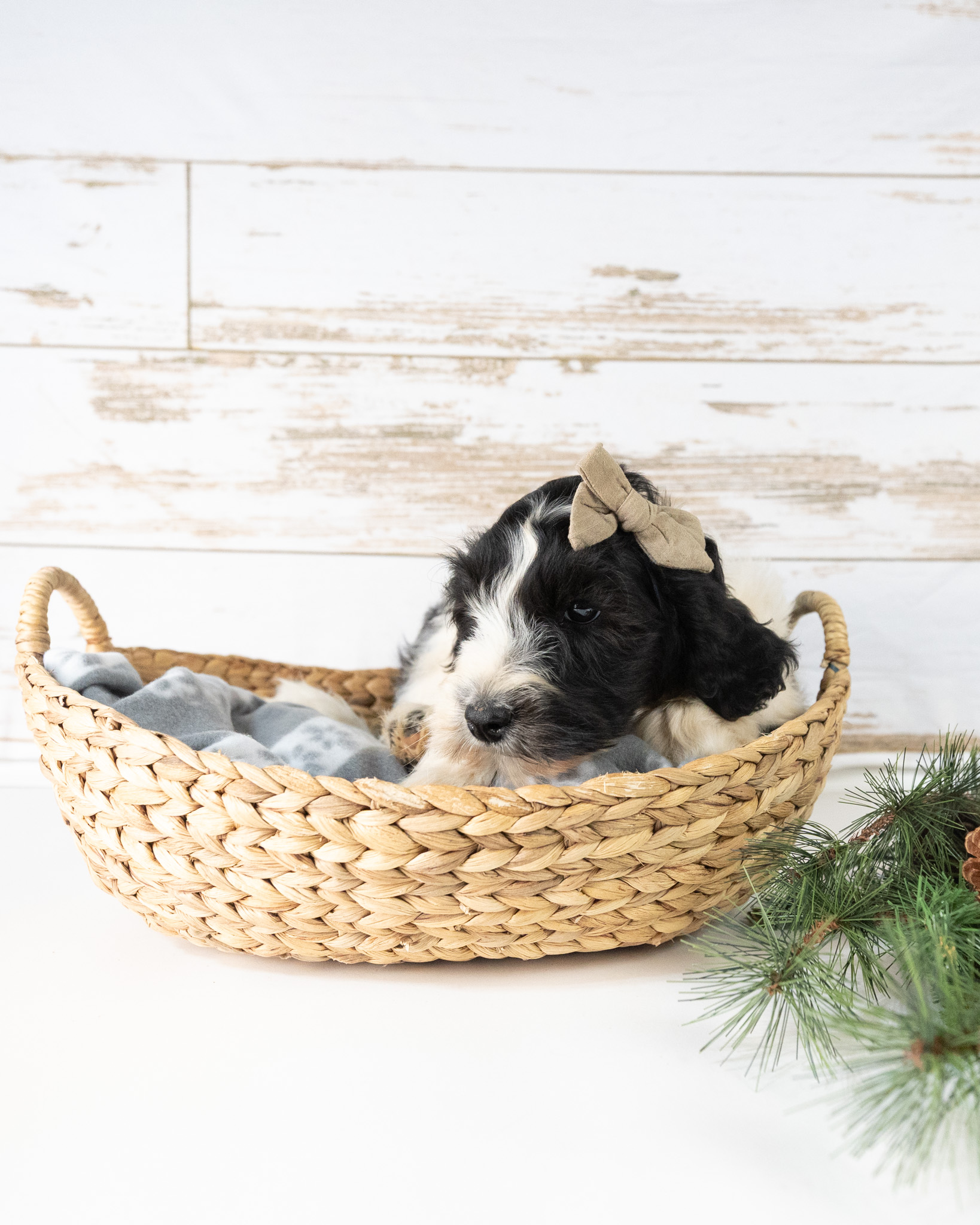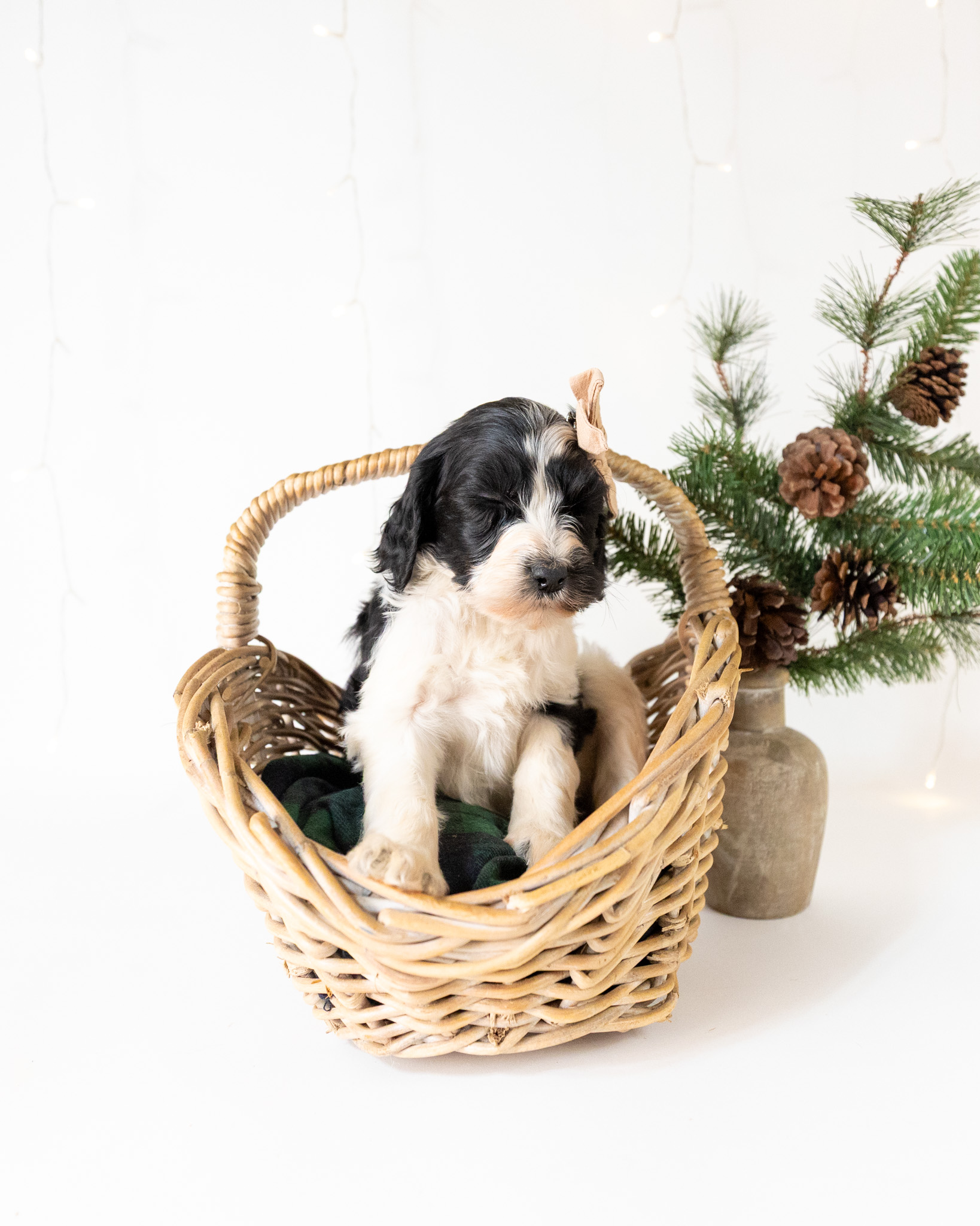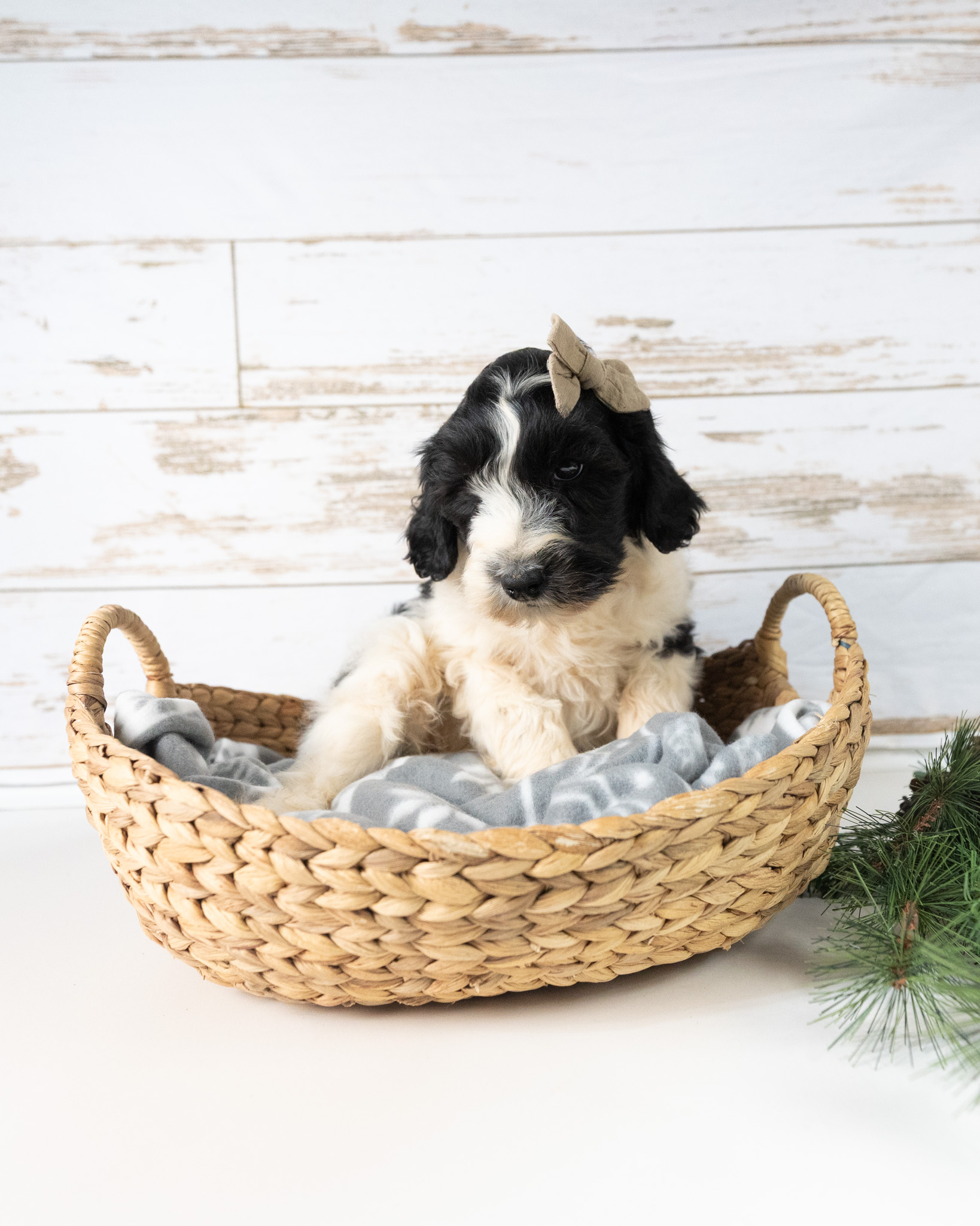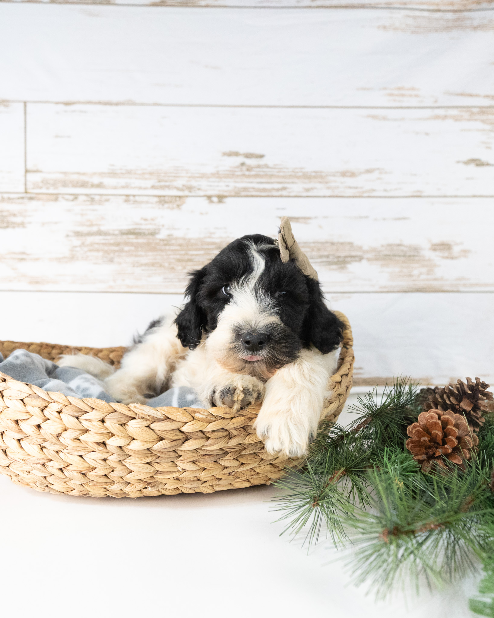 Cadence is a black and white parti multigen Goldendoodle puppy who will be ready for her fur-ever home around December 16th! Her soft, fluffy coat is hypoallergenic and non-shedding, ensuring endless snuggles without fear of allergic reactions. With a loyal and affectionate temperament, she is the perfect forever friend!