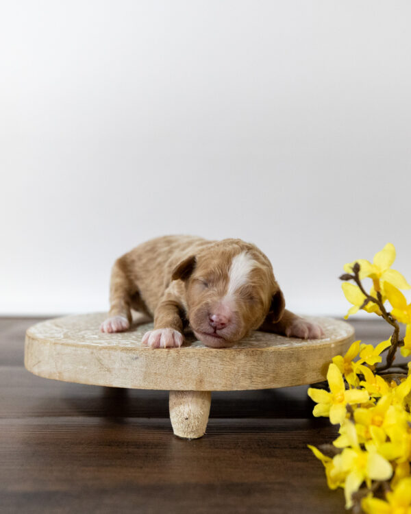 Butterscotch is a male multigen standard Goldendoodle puppy, born from our wonderful Goldendoodle parents Elizabeth and Sebastian. As with all of our Goldendoodles, this puppy’s coat will be hypoallergenic and non-shedding, ensuring endless snuggles without fear of allergic reactions.