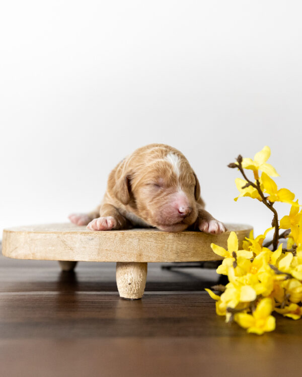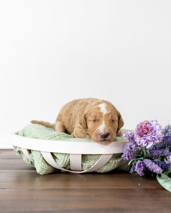 Sherbert is a male multigen standard Goldendoodle puppy, born from our wonderful Goldendoodle parents Elizabeth and Sebastian. As with all of our Goldendoodles, this puppy’s coat will be hypoallergenic and non-shedding, ensuring endless snuggles without fear of allergic reactions.