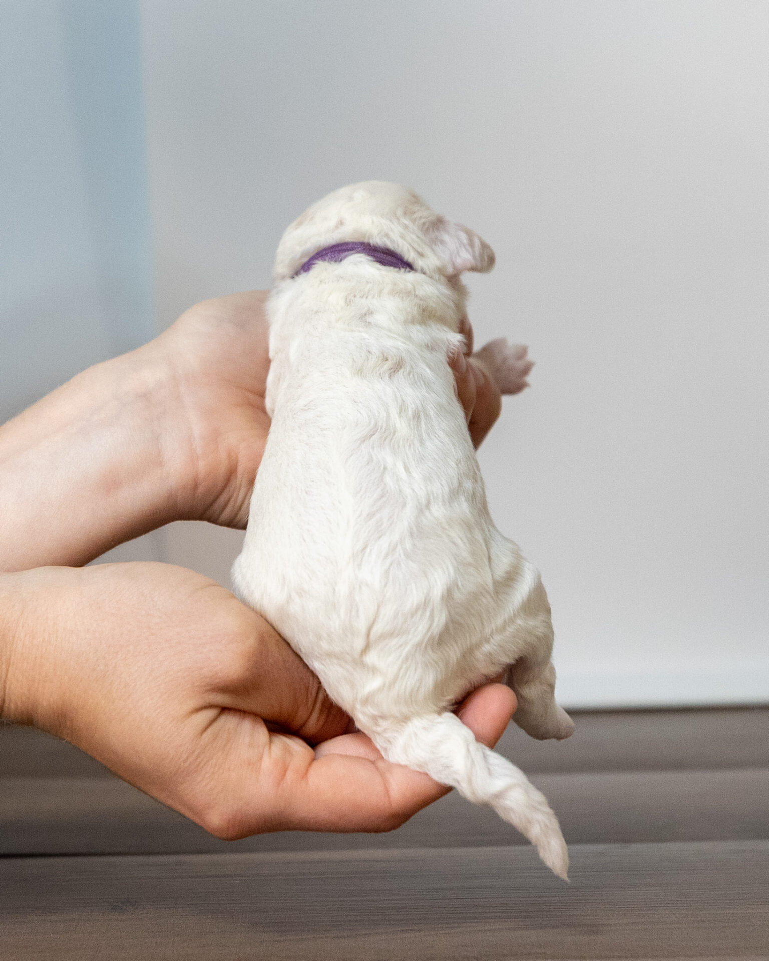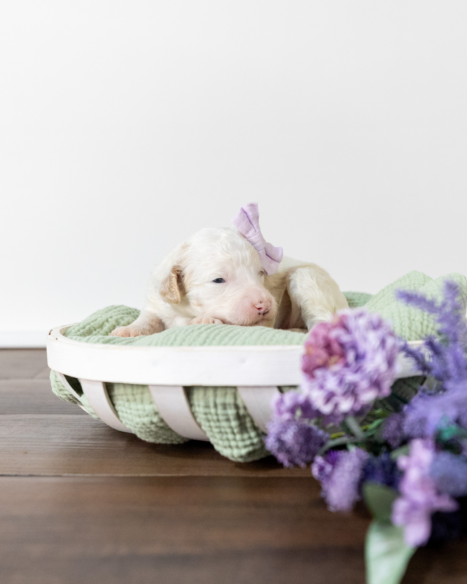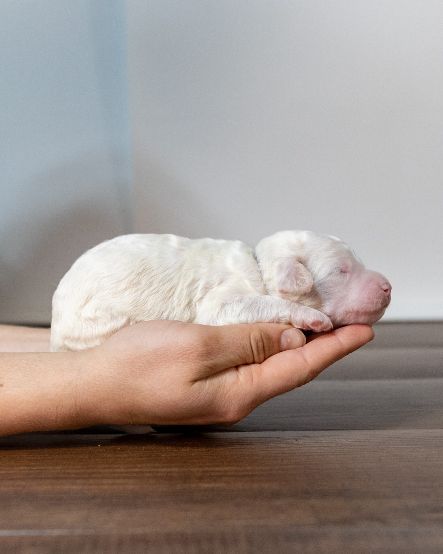 Vanilla is a female multigen standard Goldendoodle puppy, born from our wonderful Goldendoodle parents Elizabeth and Sebastian. As with all of our Goldendoodles, this puppy’s coat will be hypoallergenic and non-shedding, ensuring endless snuggles without fear of allergic reactions.