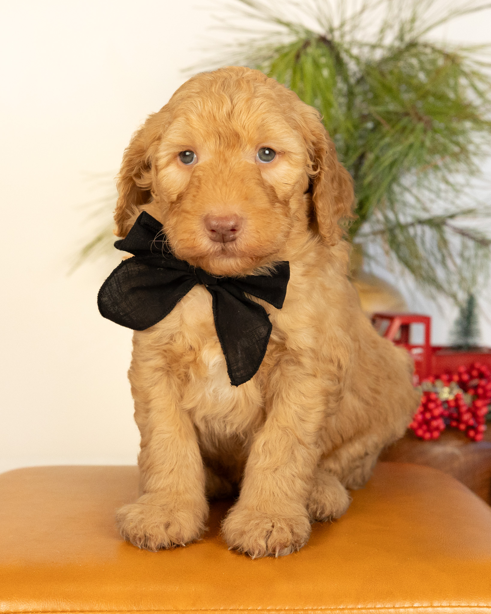 Theo is a multigen standard Goldendoodle puppy who will be ready for his fur-ever home around December 23rd! His soft, fluffy coat is hypoallergenic and non-shedding, ensuring endless snuggles without fear of allergic reactions. With a loyal and affectionate temperament, he is the perfect forever friend!