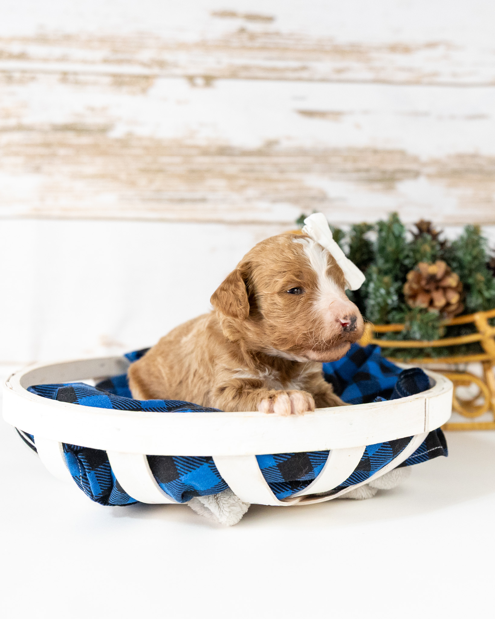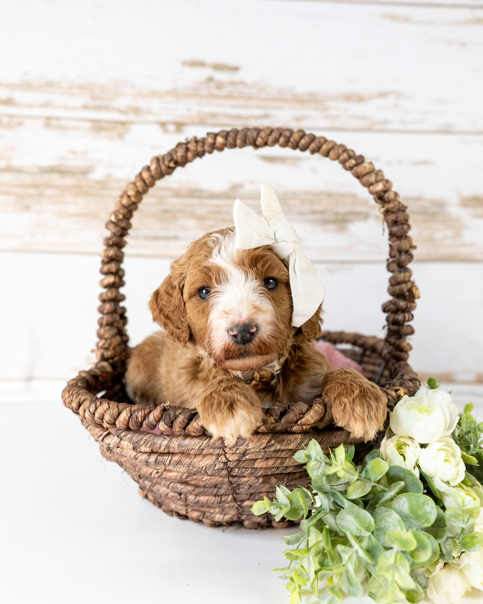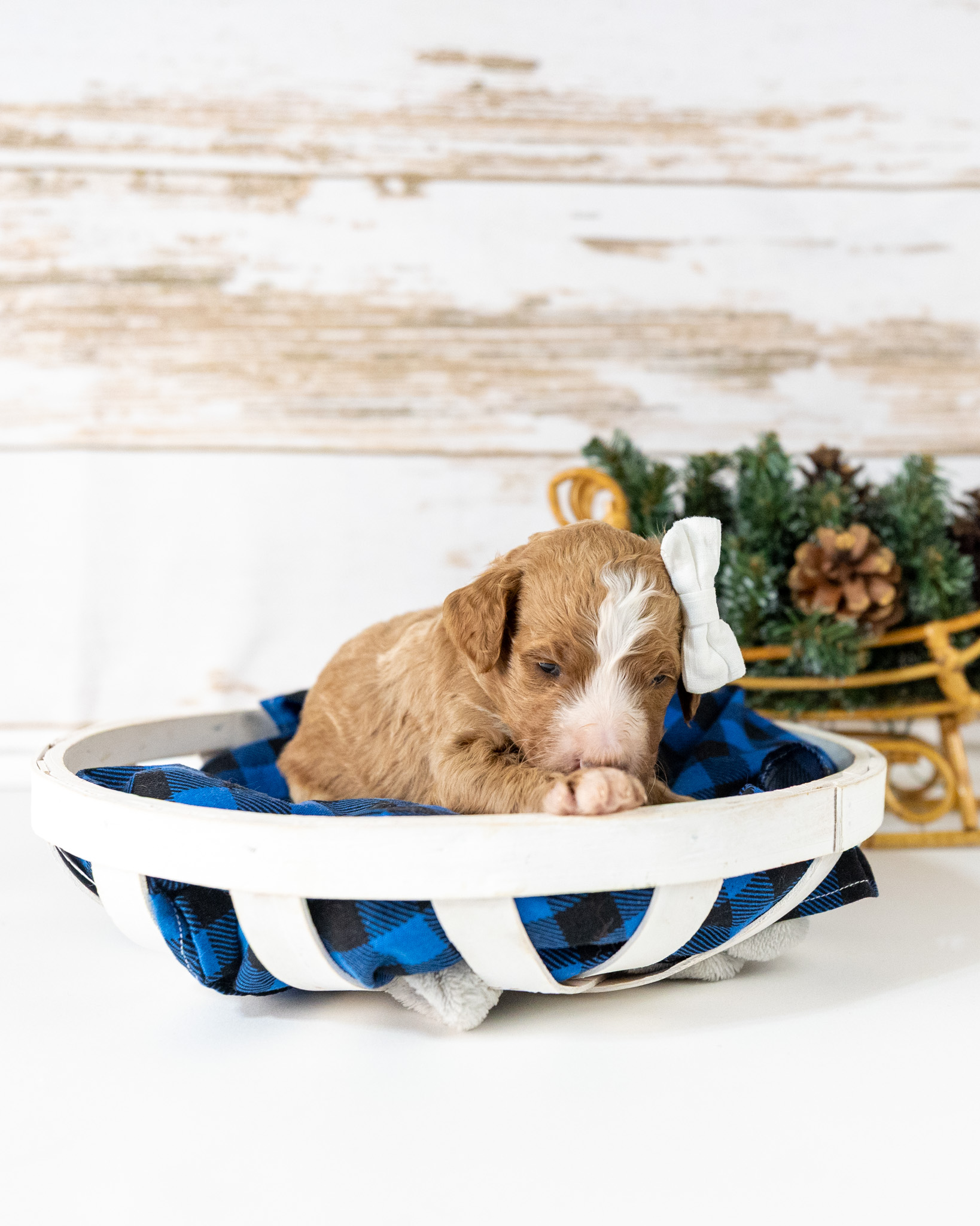 Ivy is a standard multigen Goldendoodle puppy who will be ready for her forever home February 12th! Her soft, fluffy coat is hypoallergenic and non-shedding, ensuring endless snuggles without fear of allergic reactions.