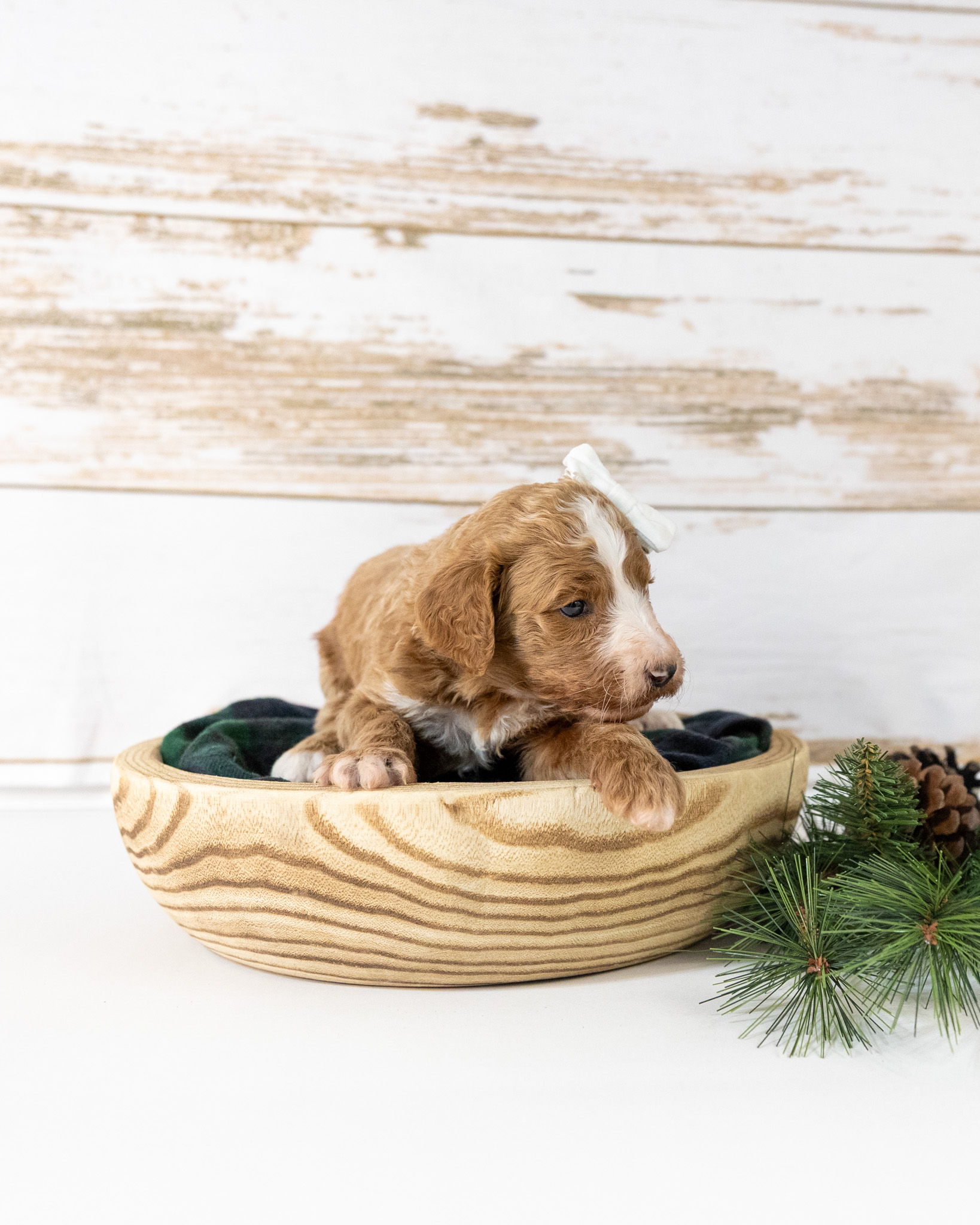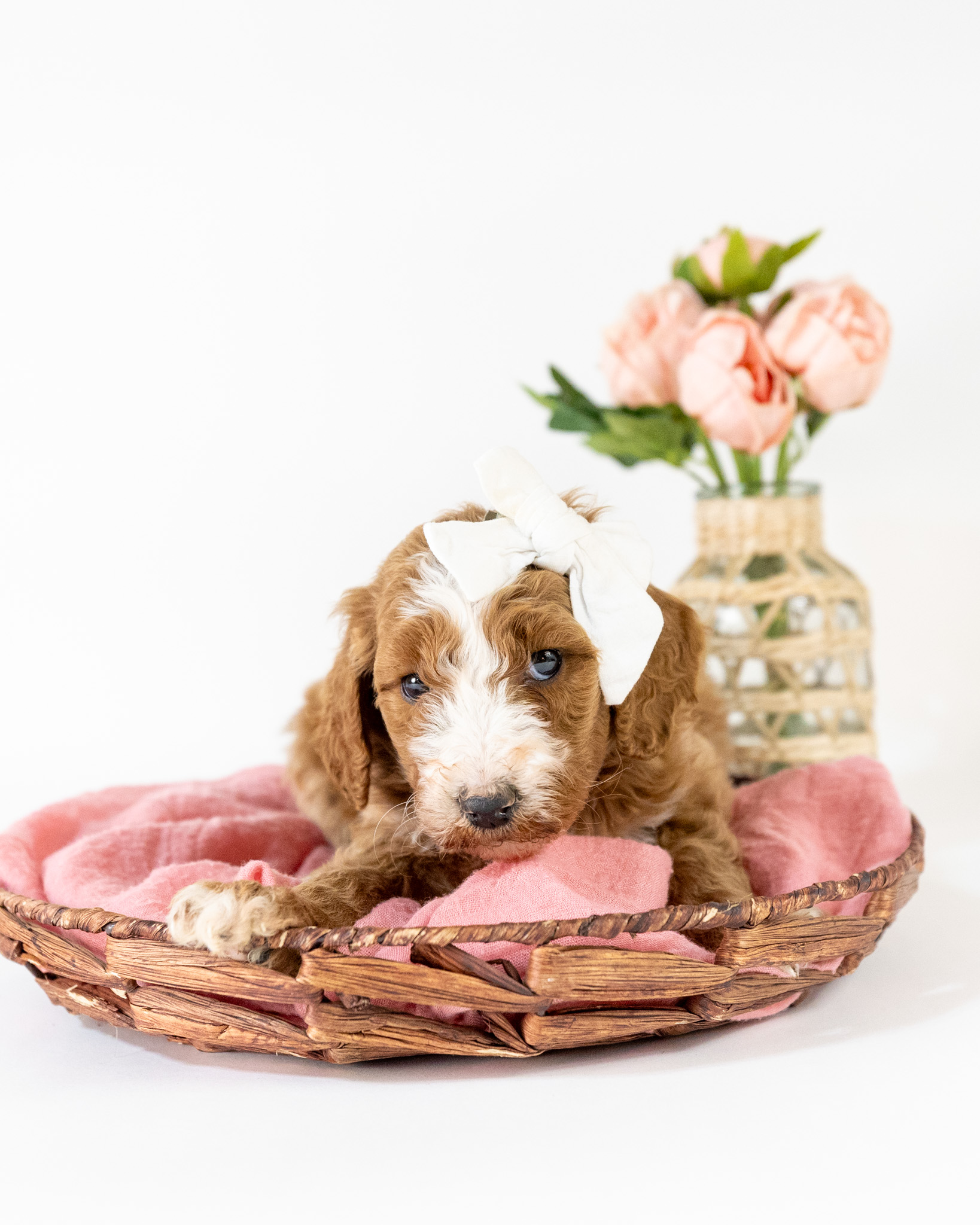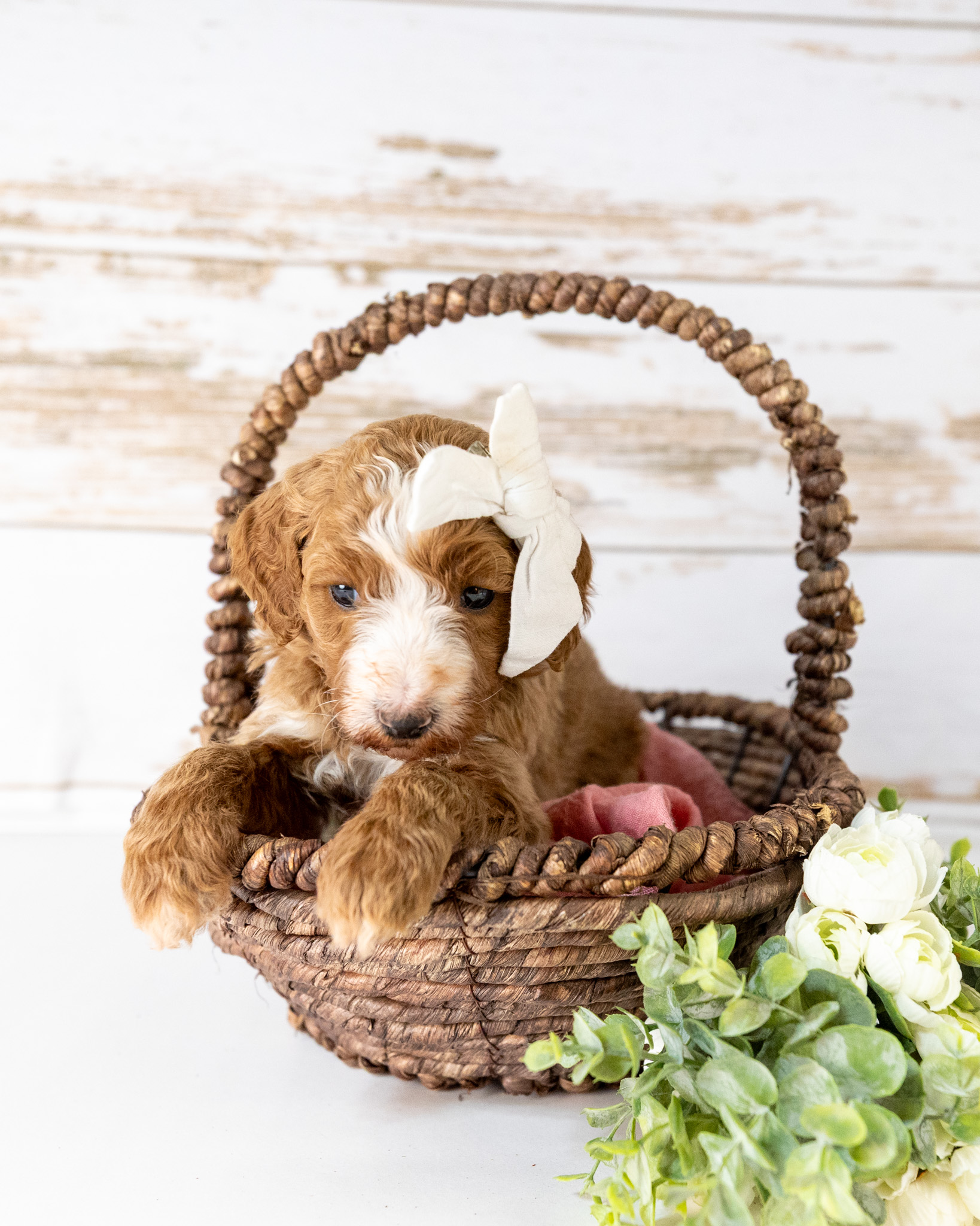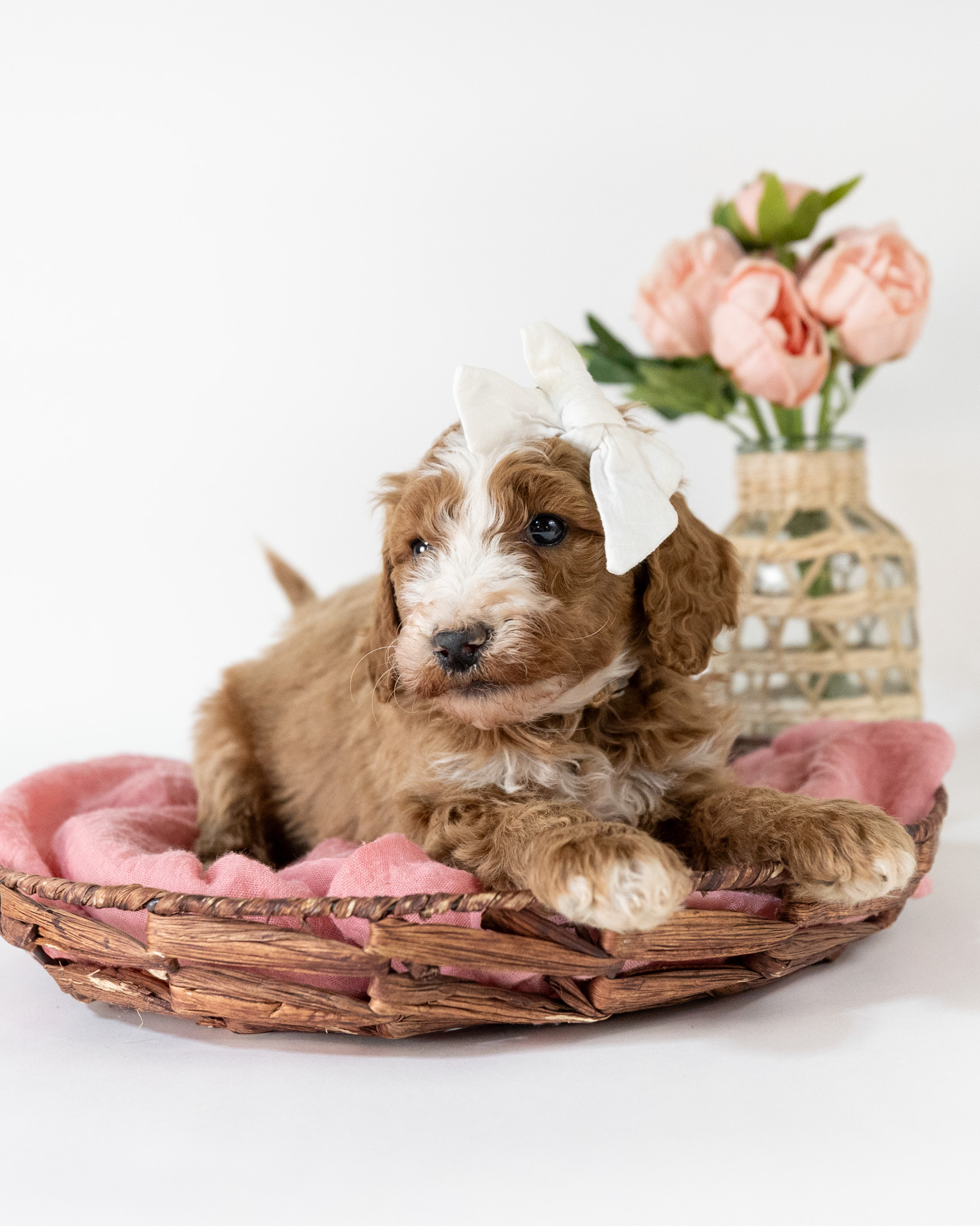 Ivy is a standard multigen Goldendoodle puppy who will be ready for her forever home February 12th! Her soft, fluffy coat is hypoallergenic and non-shedding, ensuring endless snuggles without fear of allergic reactions.