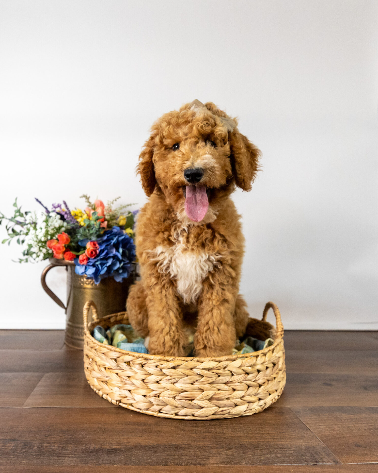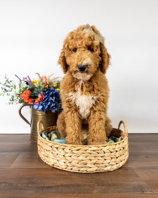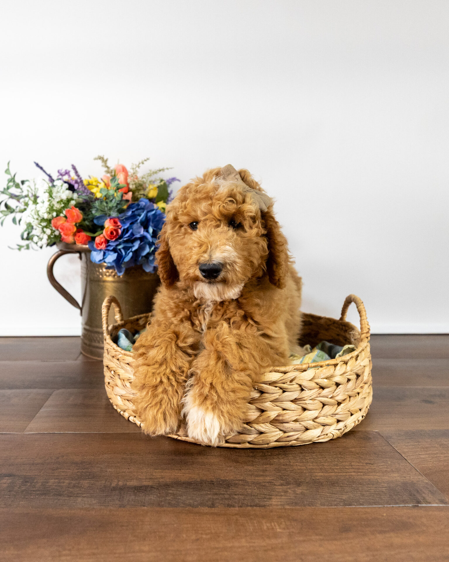 Merry is a standard multigen Goldendoodle puppy who will be ready for her forever home February 12th! Her soft, fluffy coat is hypoallergenic and non-shedding, ensuring endless snuggles without fear of allergic reactions.