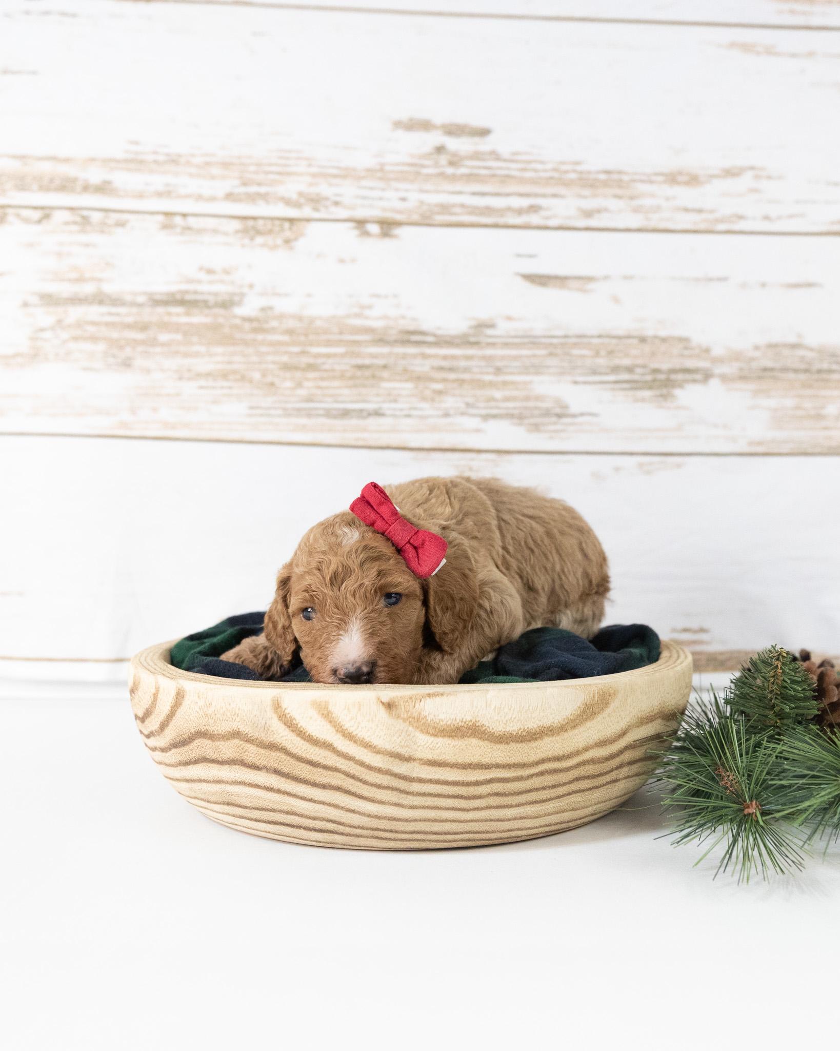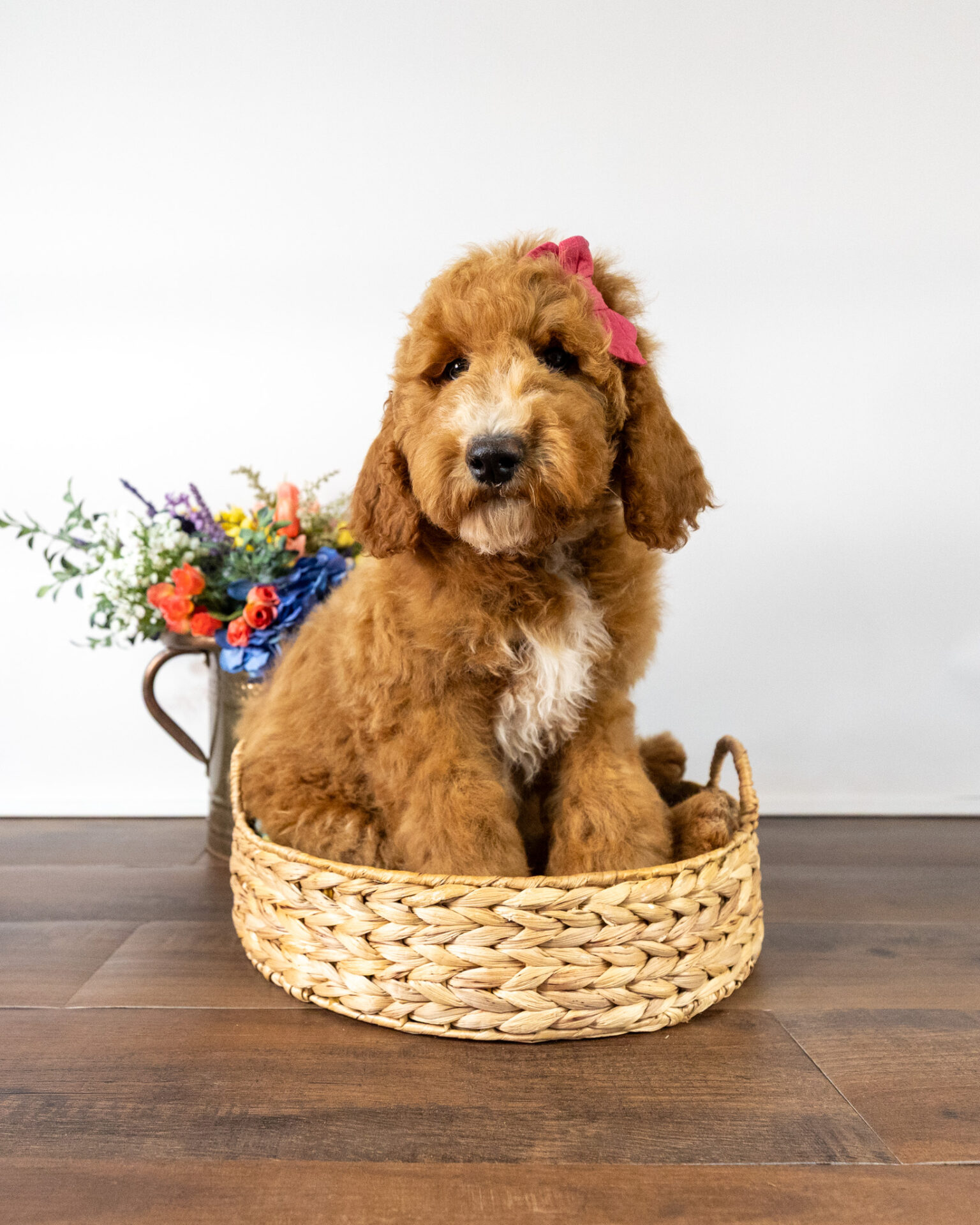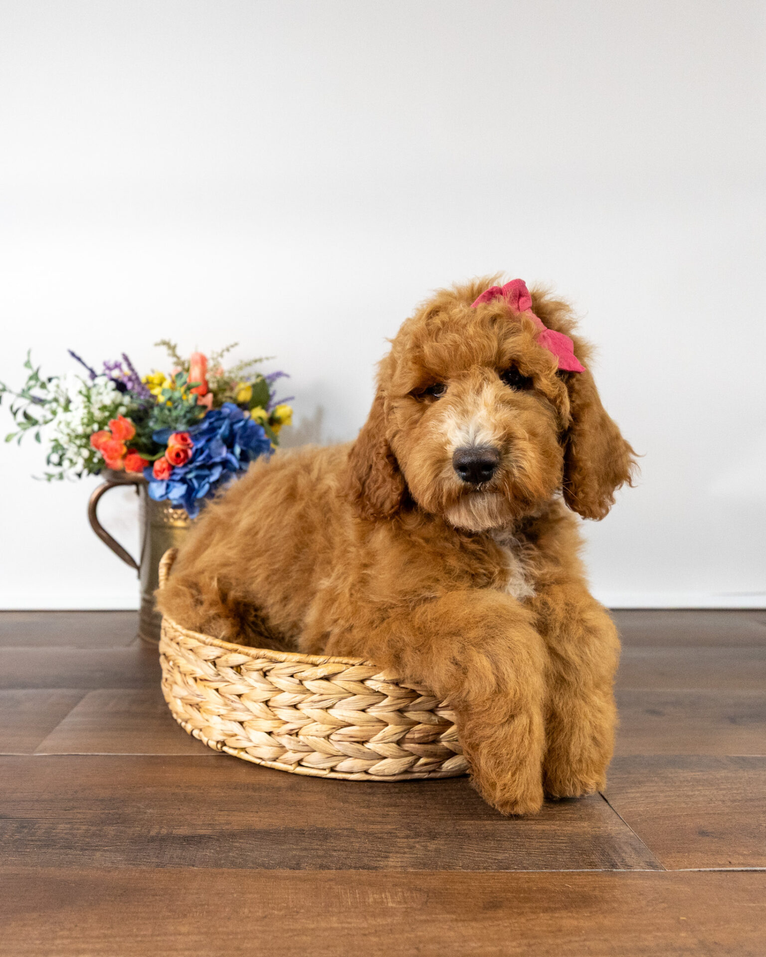 Sugar is a standard multigen Goldendoodle puppy who will be ready for her forever home February 12th! Her soft, fluffy coat is hypoallergenic and non-shedding, ensuring endless snuggles without fear of allergic reactions.