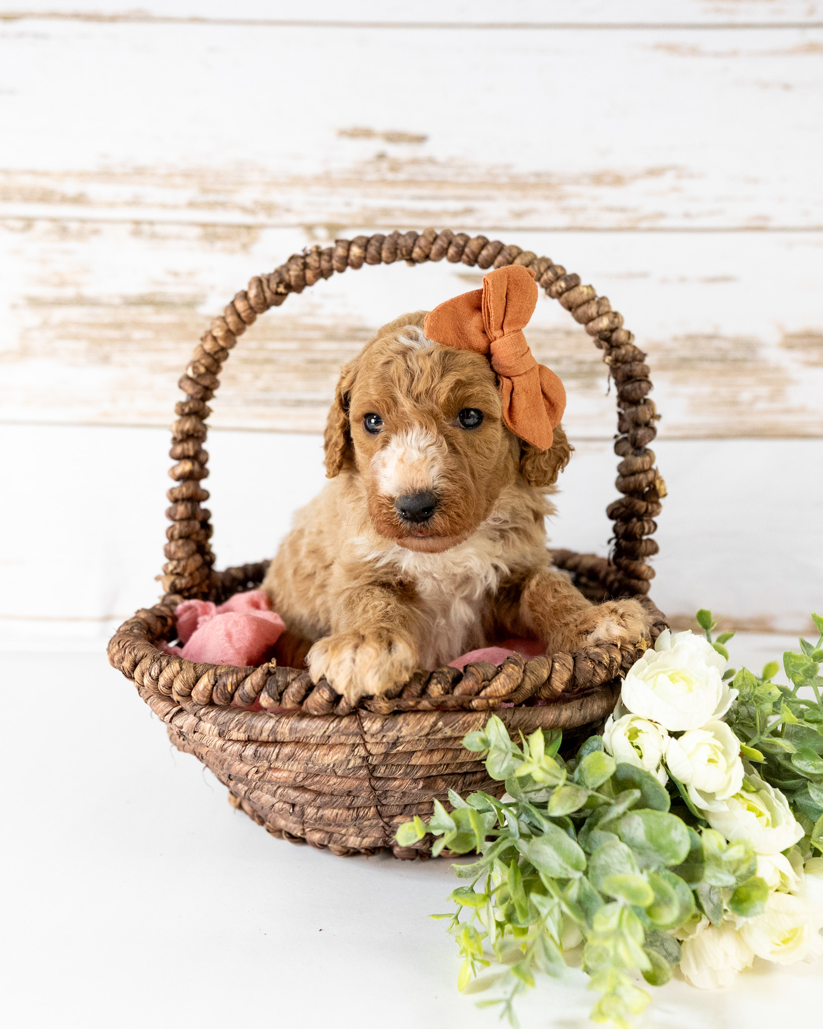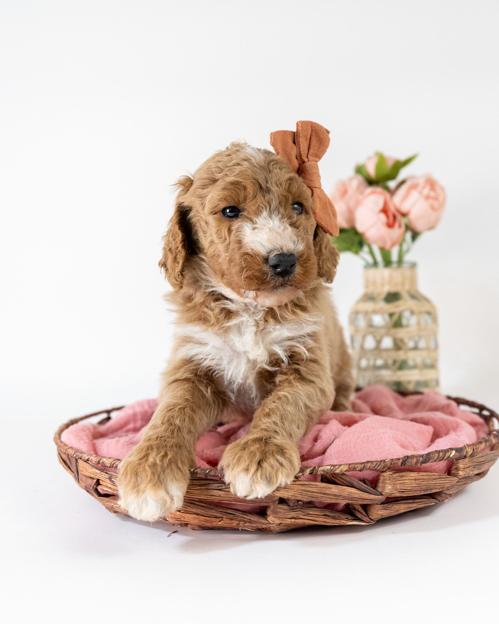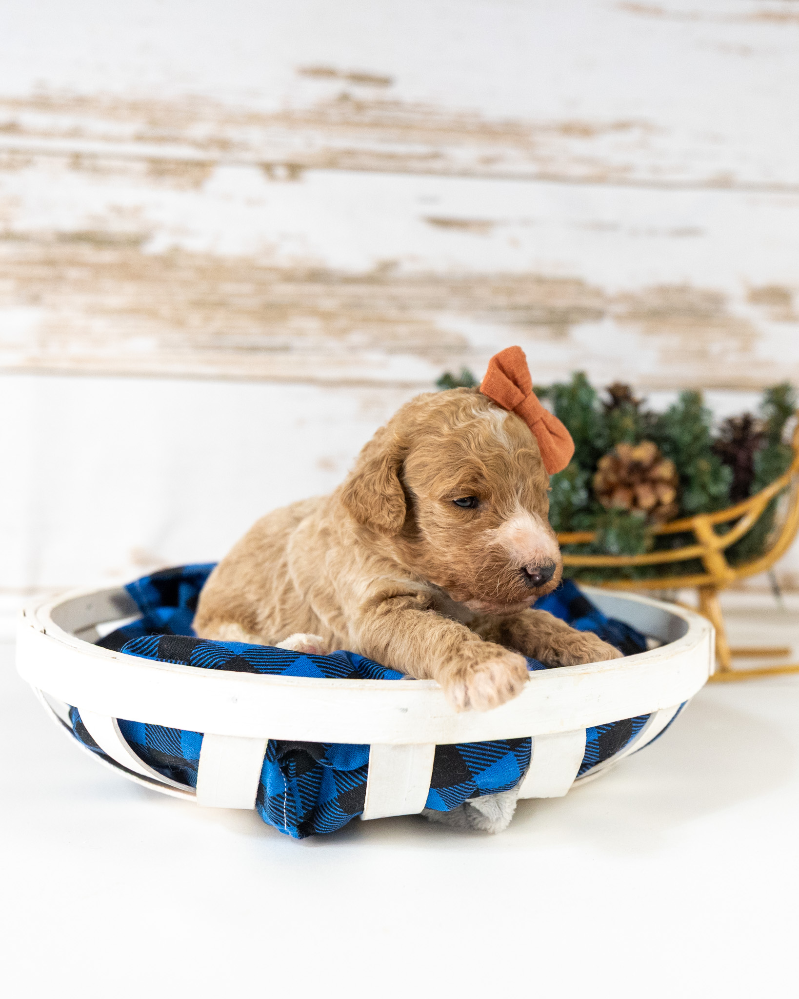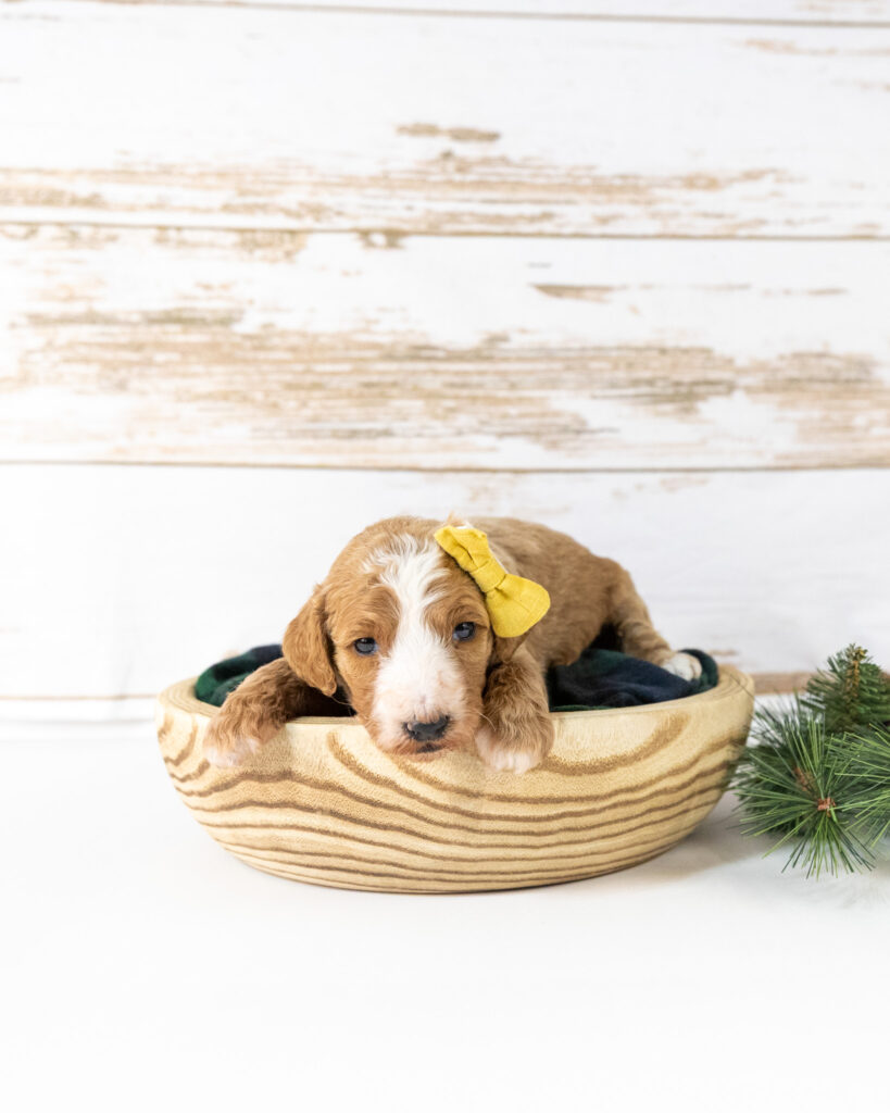 Twinkle is a standard multigen Goldendoodle puppy who will be ready for her forever home February 12th! Her soft, fluffy coat is hypoallergenic and non-shedding, ensuring endless snuggles without fear of allergic reactions.
