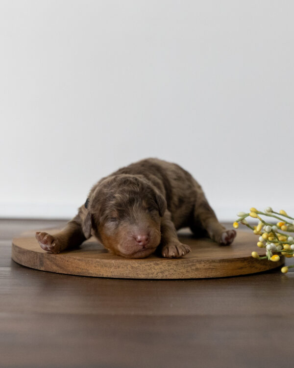 Oscar is a male multigen standard Goldendoodle puppy, born from our wonderful Goldendoodle parents Lady Lavinia and Sir Walter. As with all of our Goldendoodles, this puppy’s coat will be hypoallergenic and non-shedding, ensuring endless snuggles without fear of allergic reactions.
