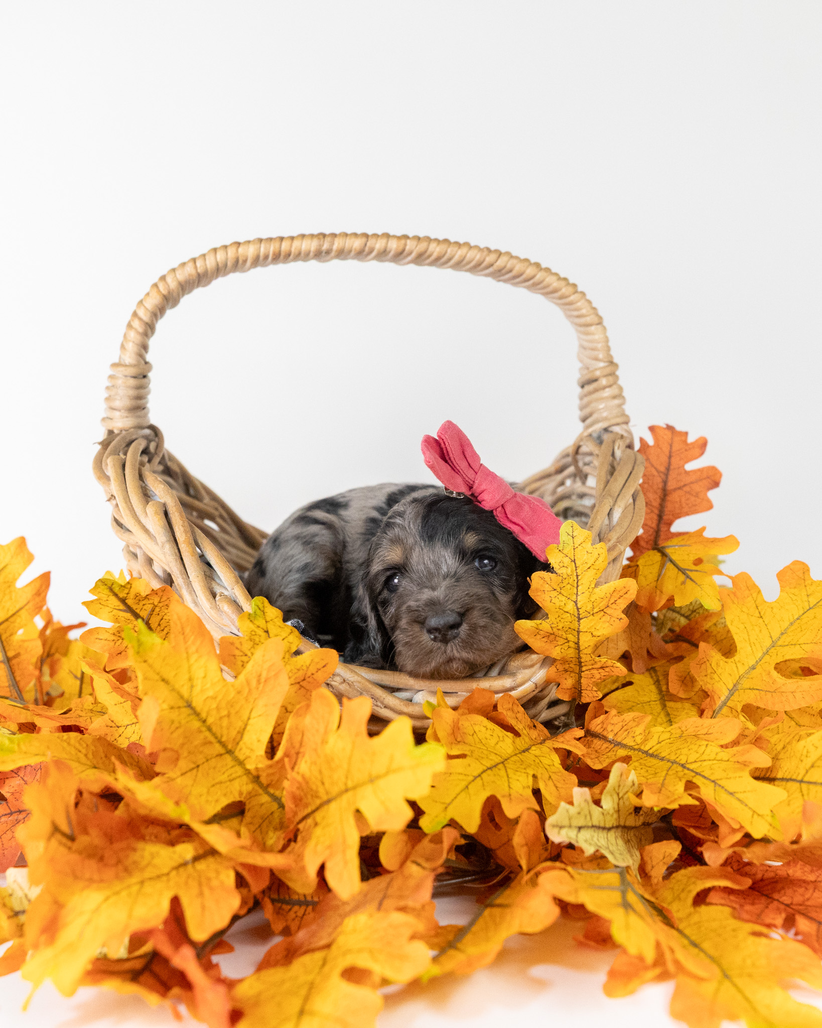 Rumcake is a multigen Goldendoodle puppy who will be ready for her fur-ever home around December 8th! Her soft, fluffy coat is hypoallergenic and non-shedding, ensuring endless snuggles without fear of allergic reactions. With a loyal and affectionate temperament, she is the perfect forever friend!