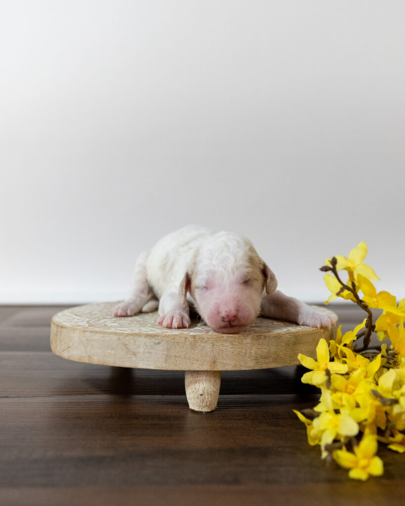Milkshake is a light gold parti male multigen standard Goldendoodle puppy who will be ready to go home May 26th!