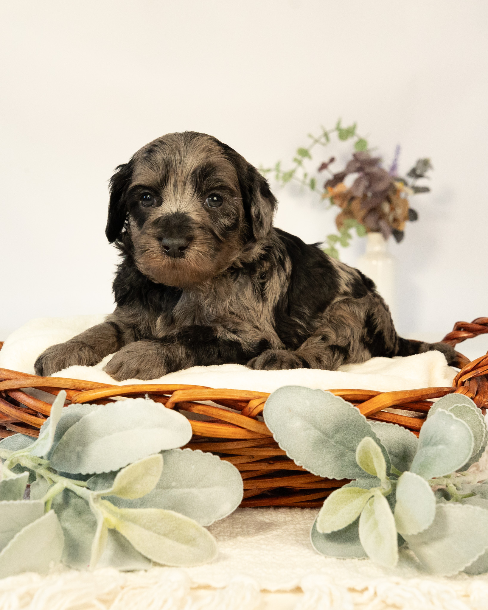 Caspian is a merle colored multigen medium Goldendoodle puppy who will be ready for his fur-ever home around March 18th! His soft, fluffy coat is hypoallergenic and non-shedding, ensuring endless snuggles without fear of allergic reactions. With a loyal and affectionate temperament, he is the perfect forever friend!