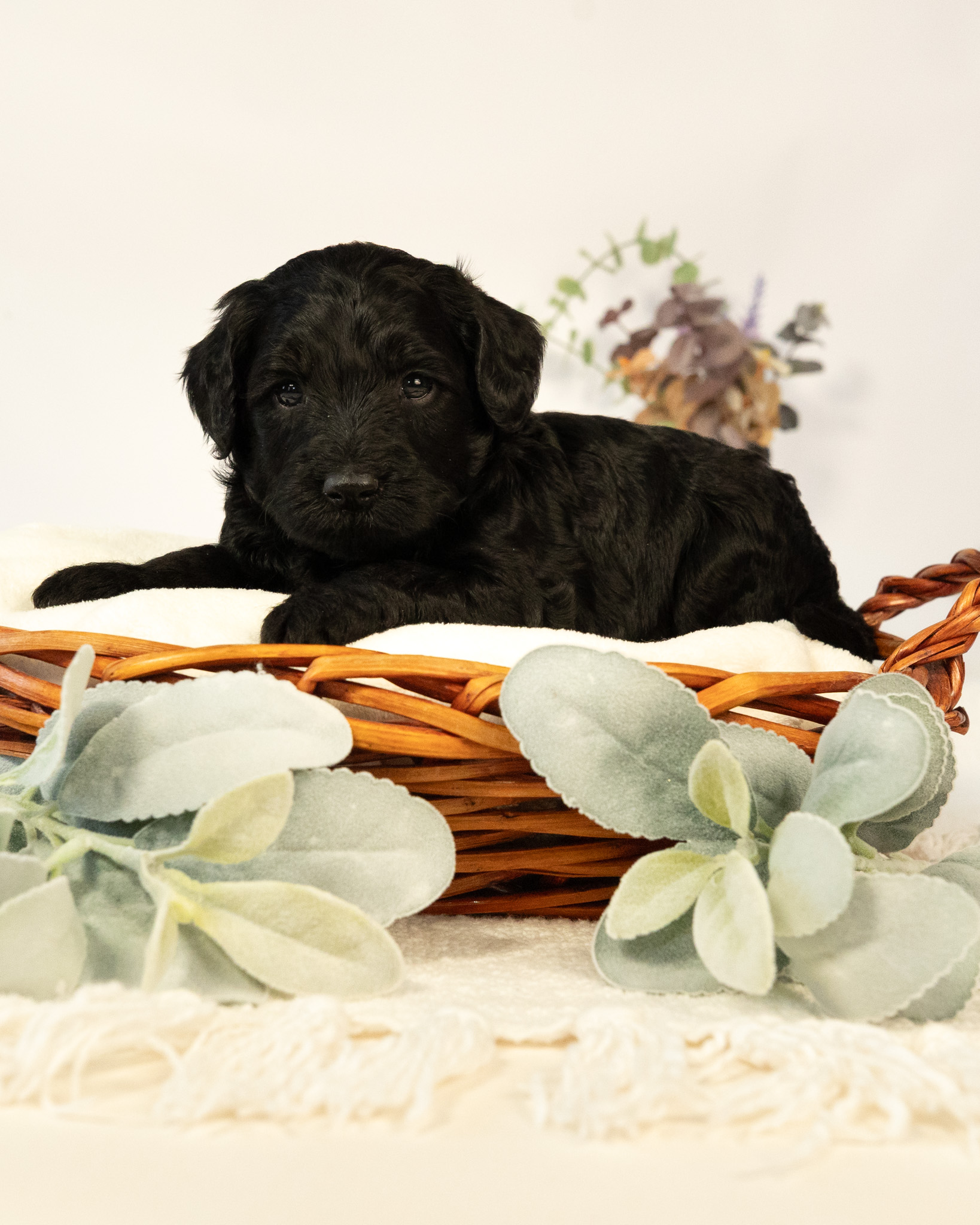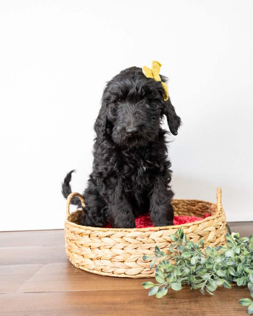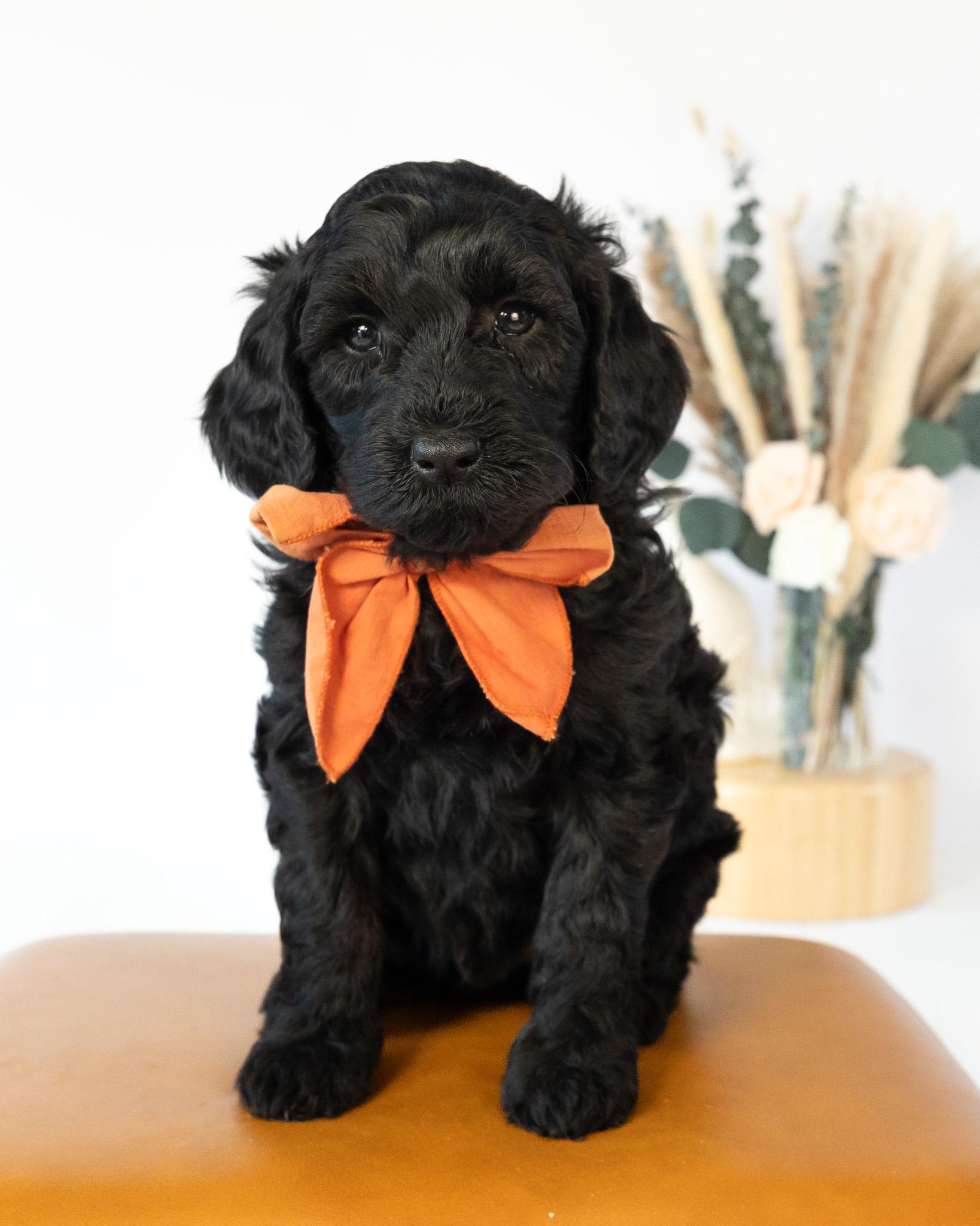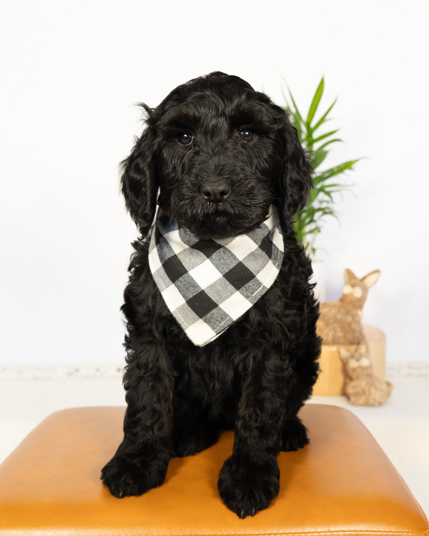Diggory is a black multigen medium Goldendoodle puppy who will be ready for his fur-ever home around March 18th! His soft, fluffy coat is hypoallergenic and non-shedding, ensuring endless snuggles without fear of allergic reactions. With a loyal and affectionate temperament, he is the perfect forever friend!