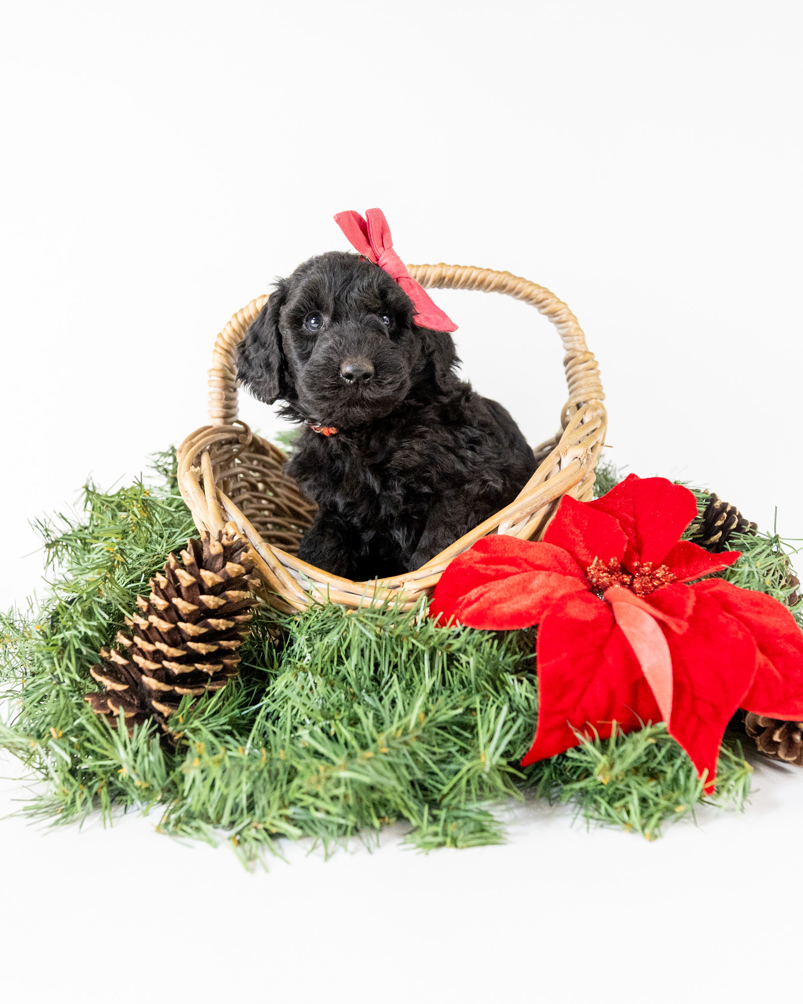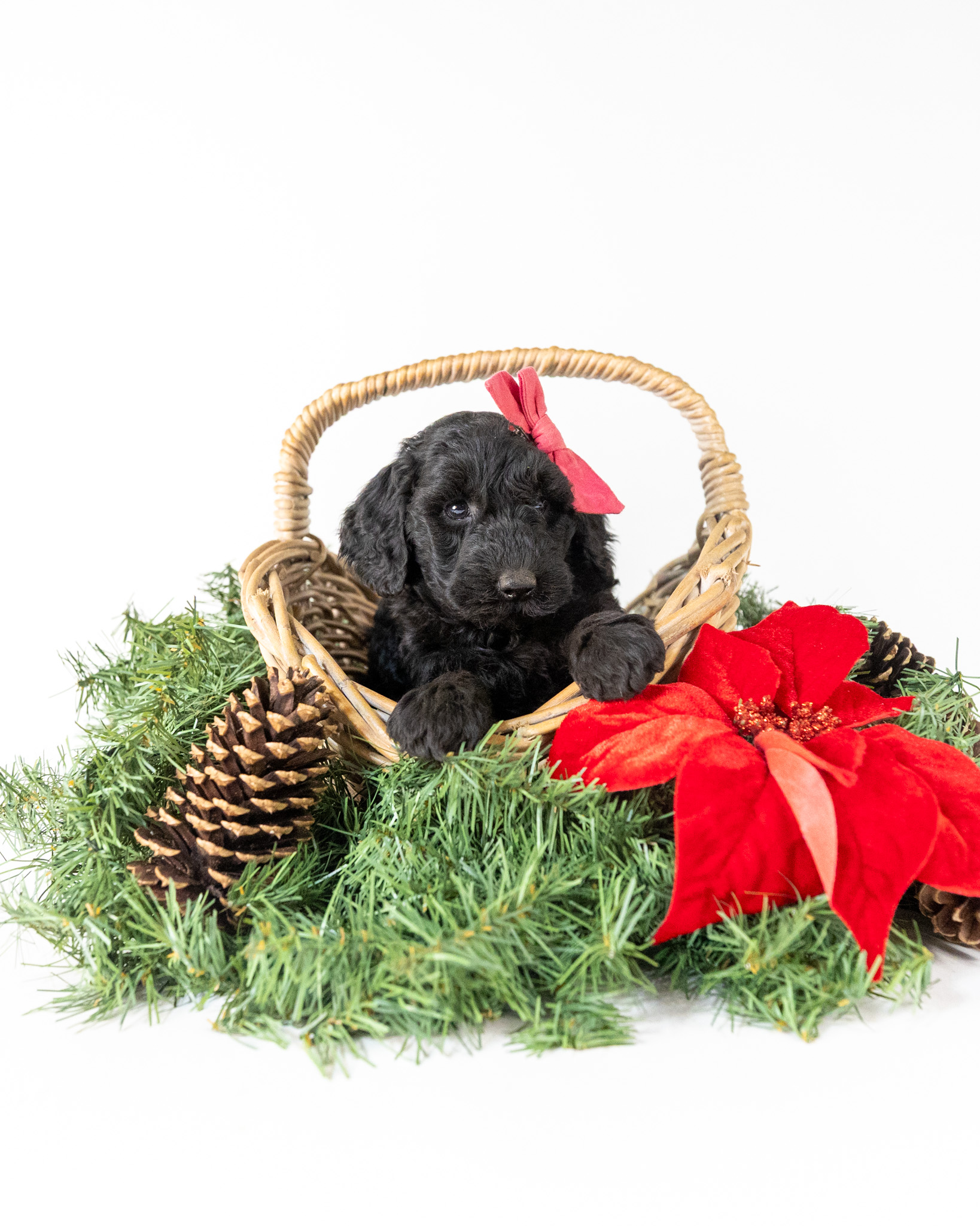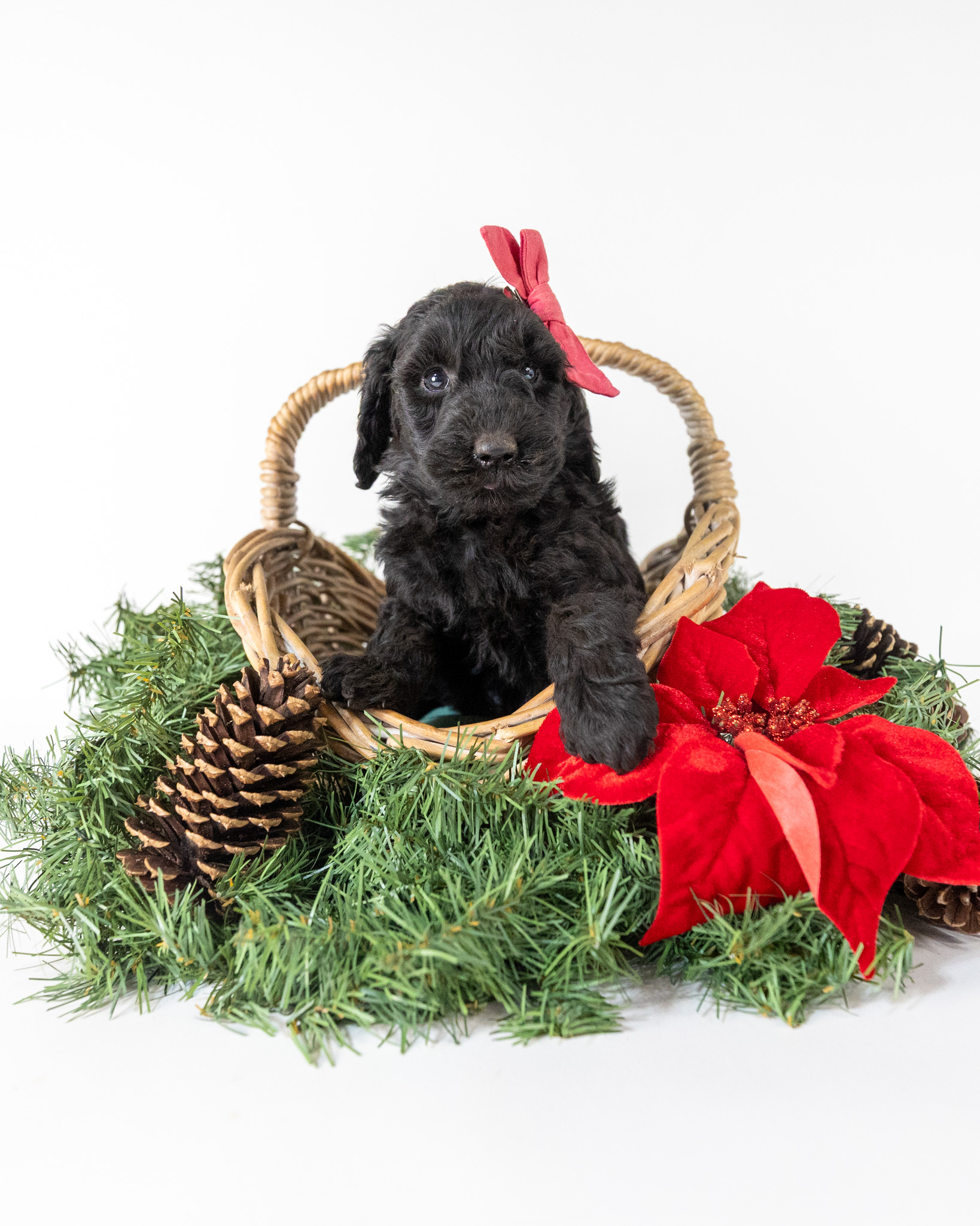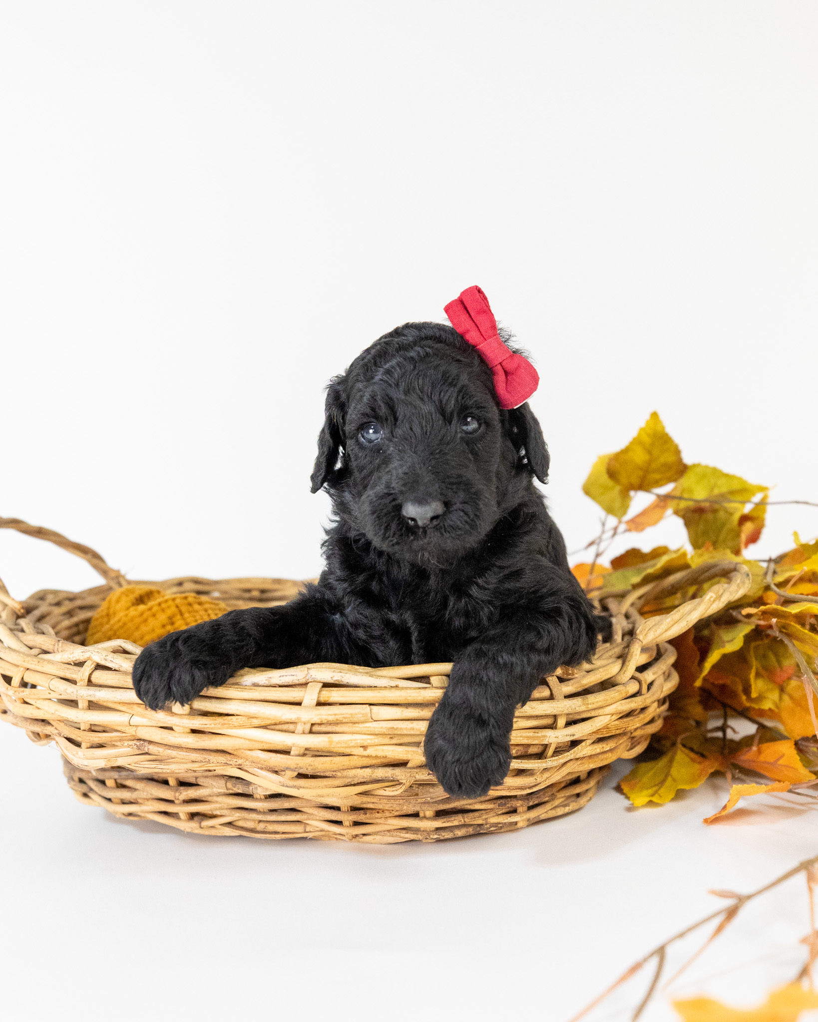 Ribbon is a multigen Goldendoodle puppy who will be ready for her fur-ever home around December 11th! Her soft, fluffy coat is hypoallergenic and non-shedding, ensuring endless snuggles without fear of allergic reactions. With a loyal and affectionate temperament, she is the perfect forever friend!