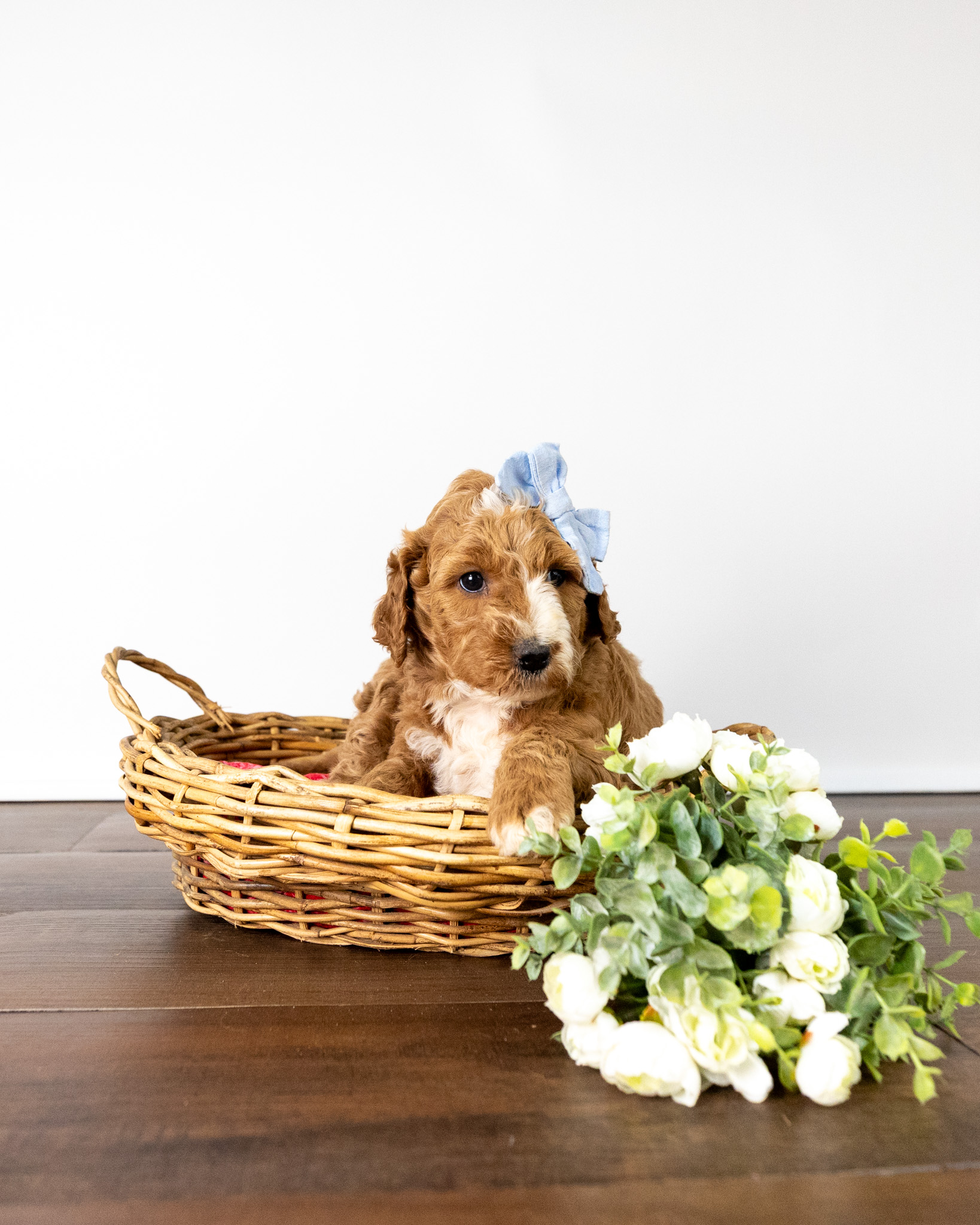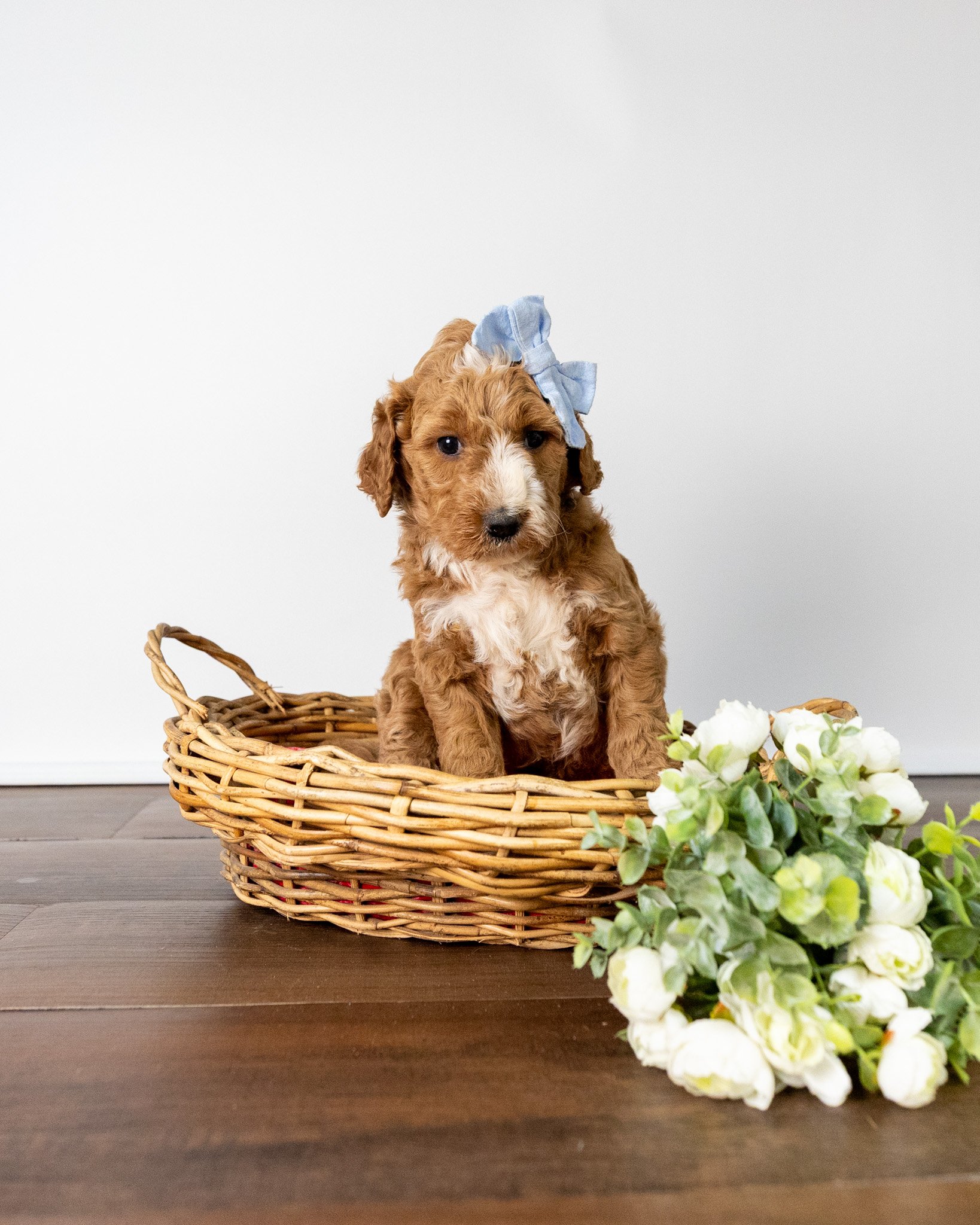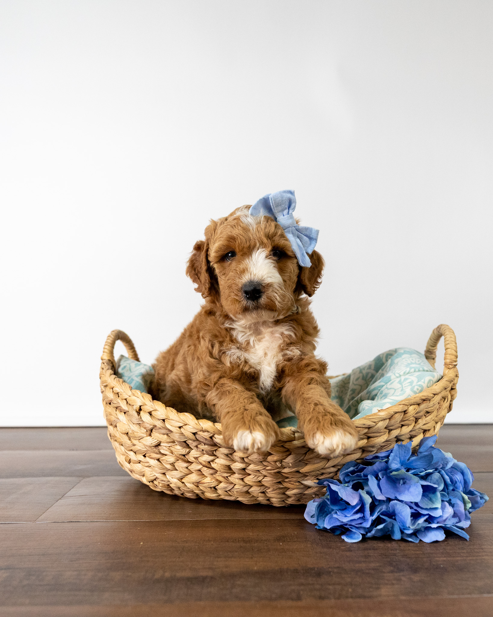 Asiago is a standard multigen Goldendoodle puppy with a stunning red coat with forehead, chest, throat, toes, and tail tip markings. She will be ready for her forever home April 28th! Her soft, fluffy coat is hypoallergenic and non-shedding, ensuring endless snuggles without fear of allergic reactions.