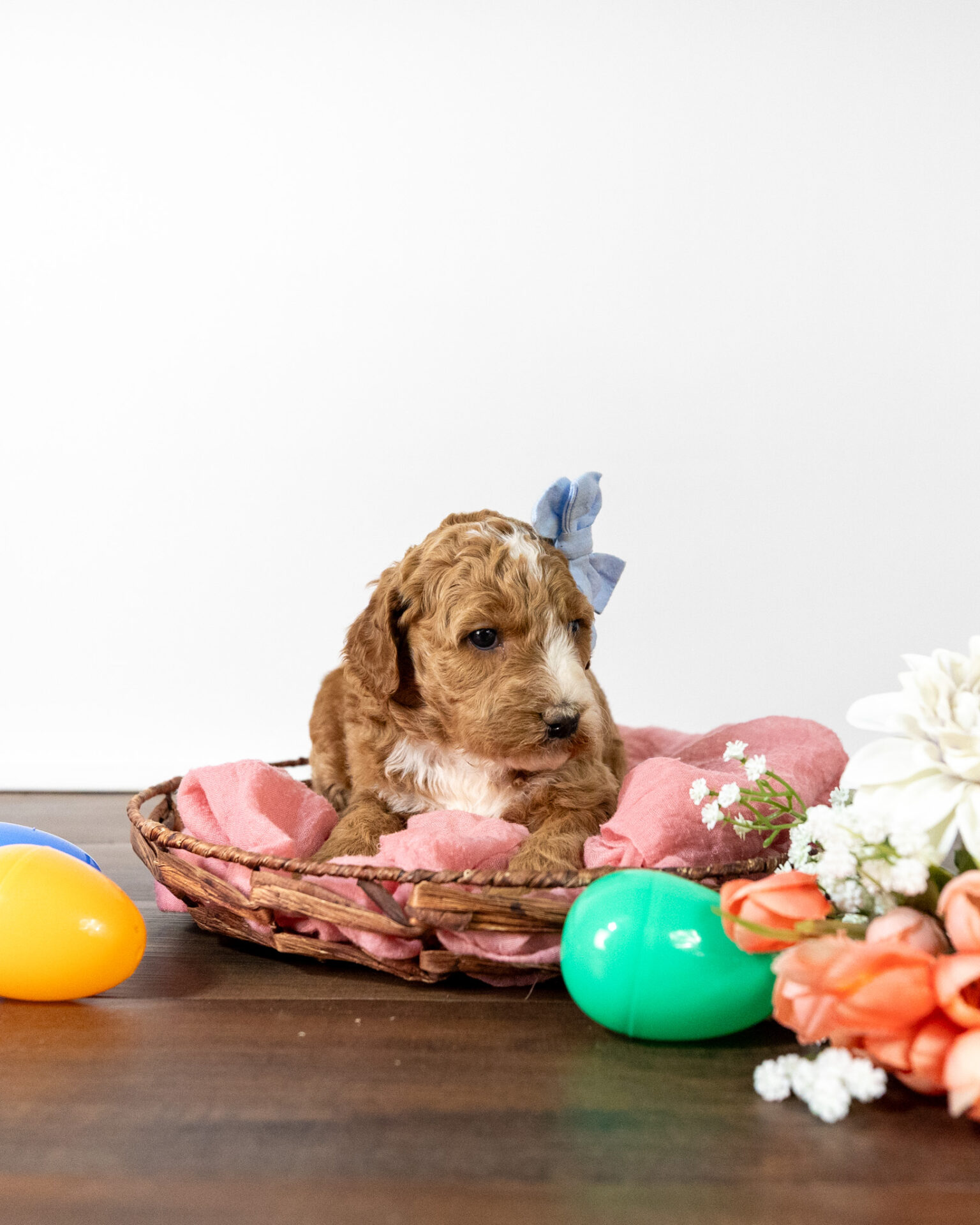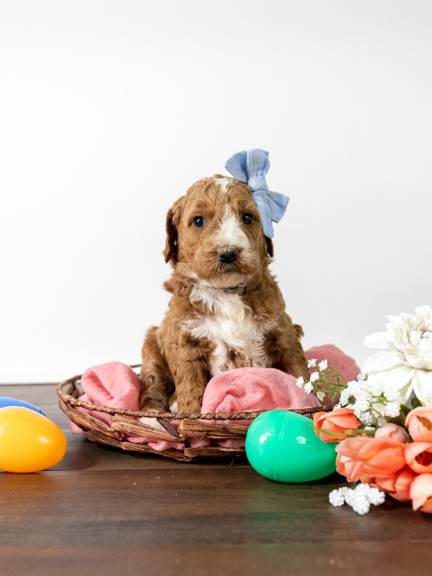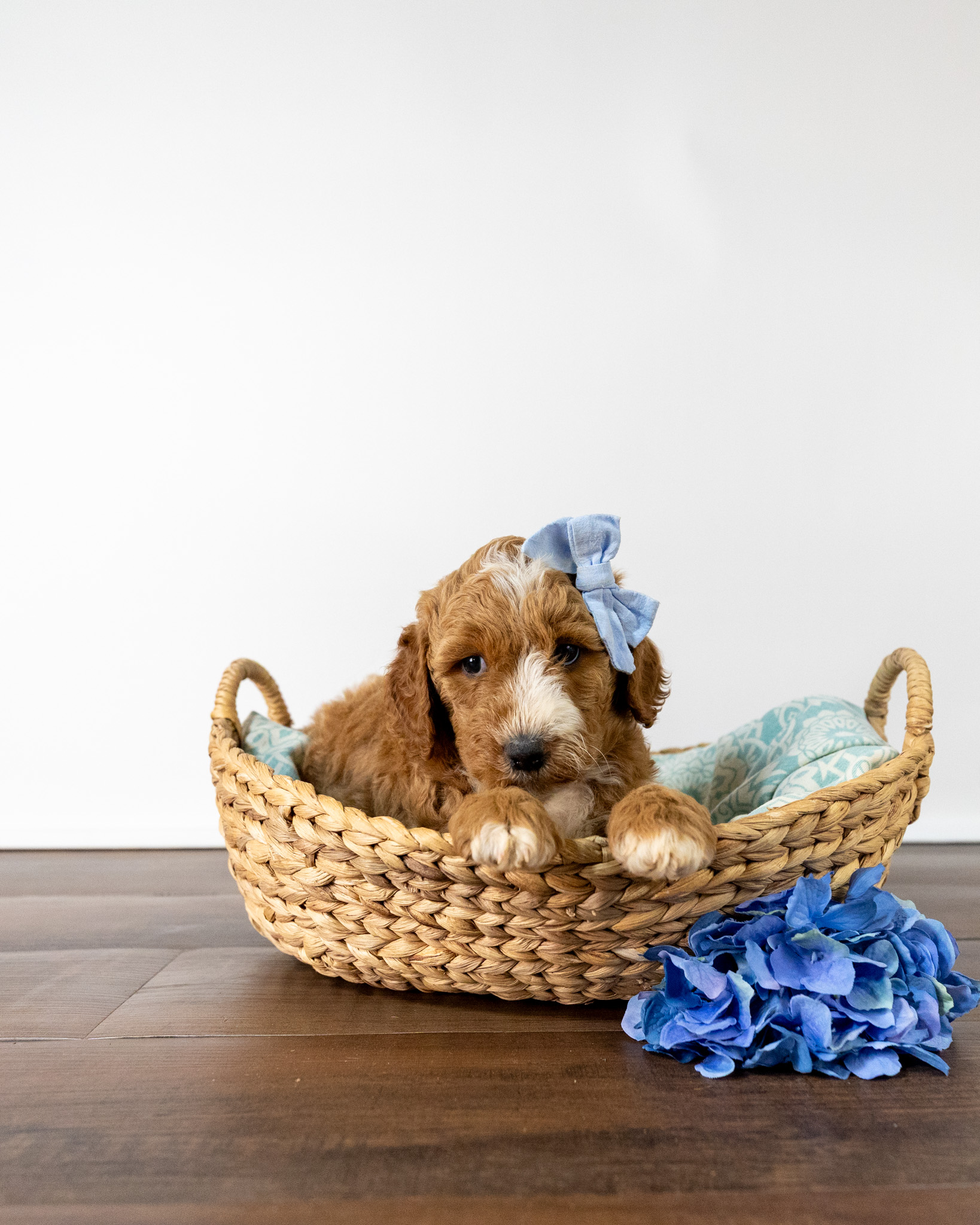 Asiago is a standard multigen Goldendoodle puppy with a stunning red coat with forehead, chest, throat, toes, and tail tip markings. She will be ready for her forever home April 28th! Her soft, fluffy coat is hypoallergenic and non-shedding, ensuring endless snuggles without fear of allergic reactions.