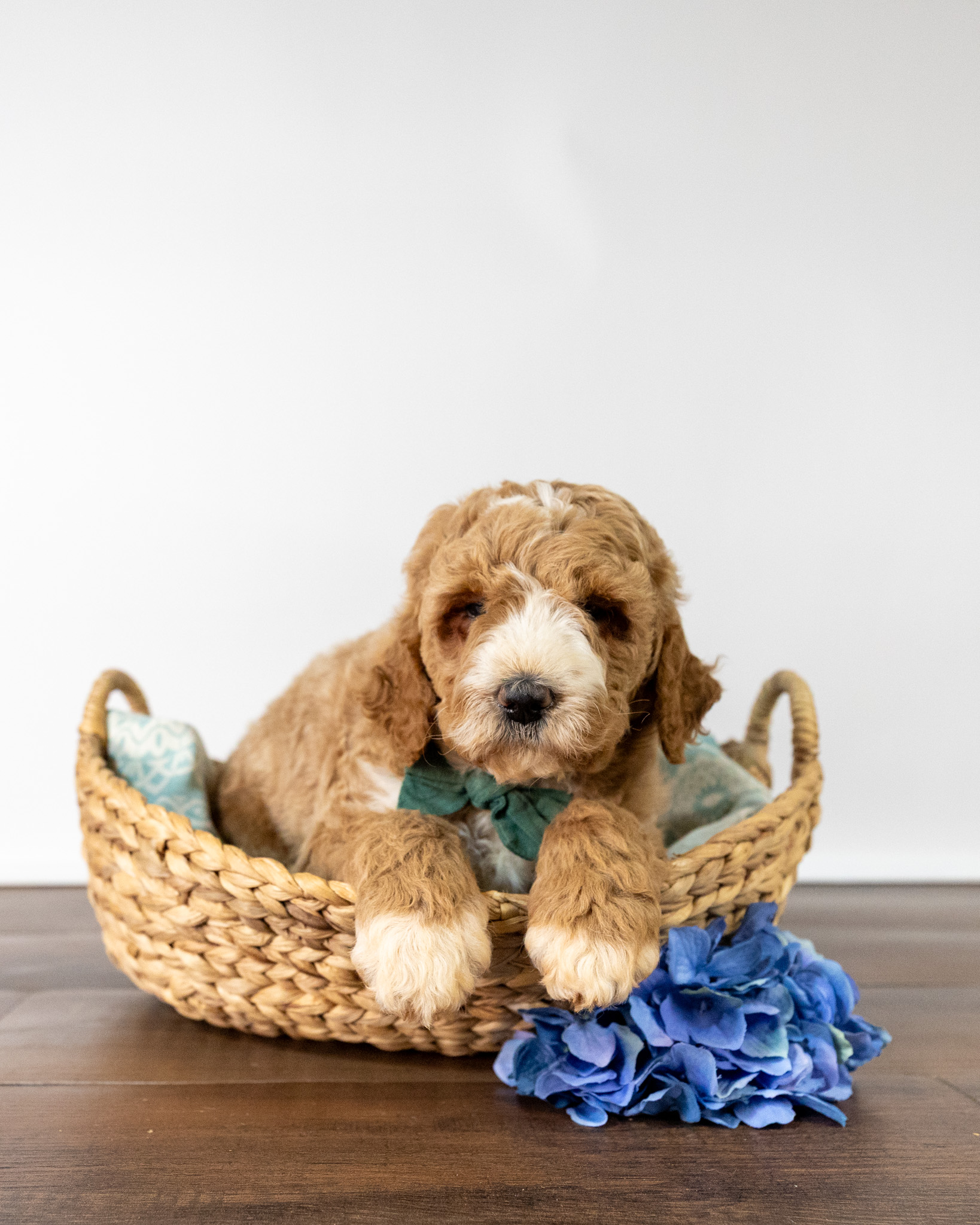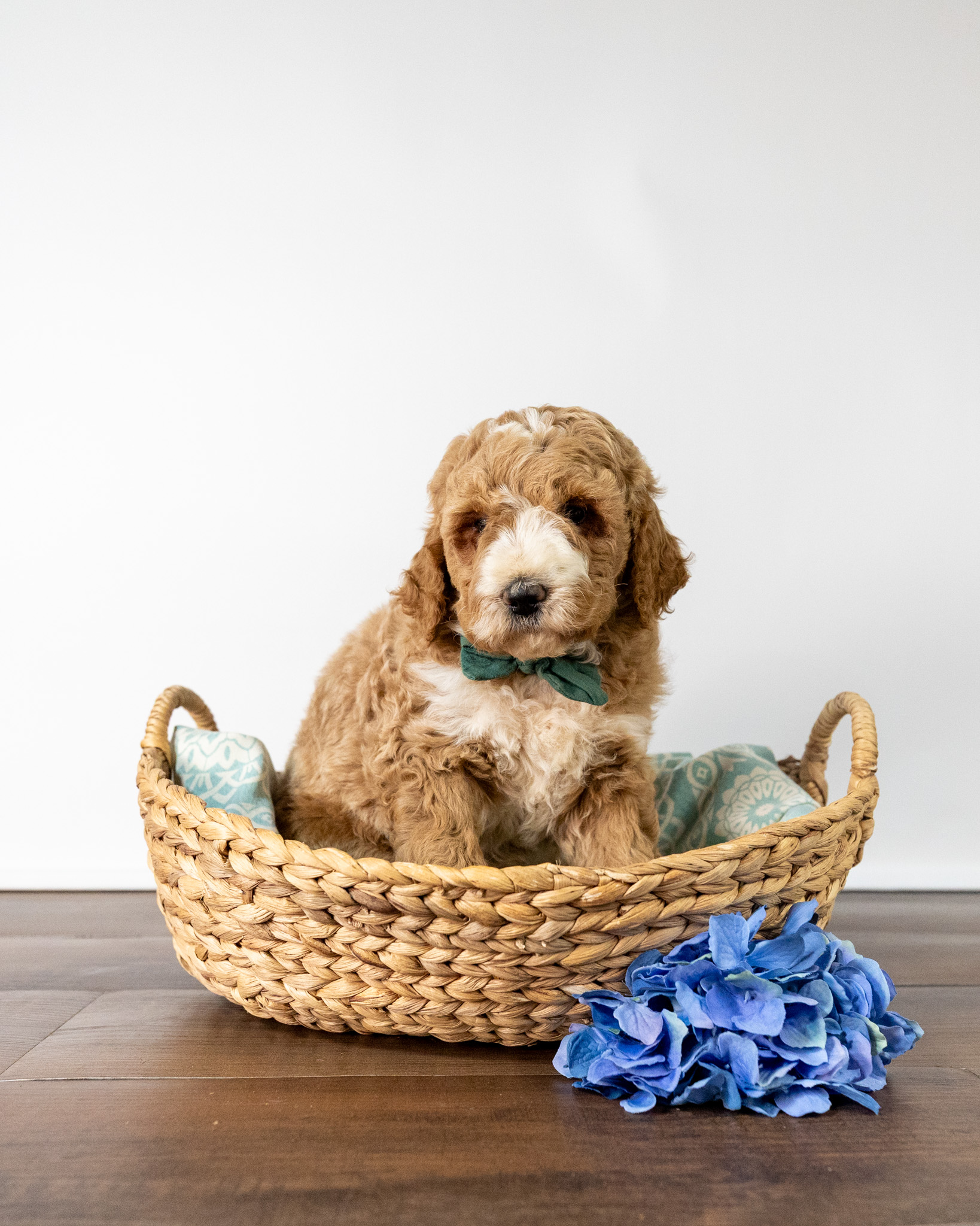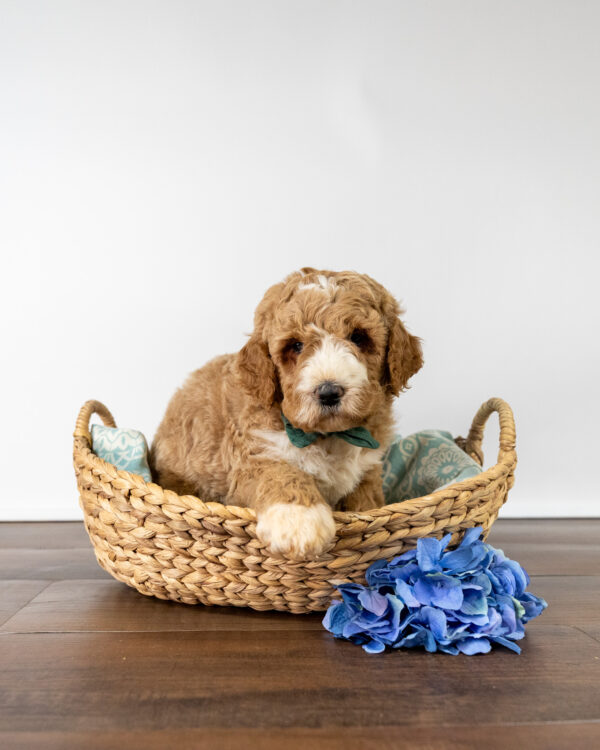 Feta is a standard multigen Goldendoodle puppy with a stunning light red coat with forehead, chest, throat, toes, and tail tip markings. He will be ready for her forever home April 25th! His soft, fluffy coat is hypoallergenic and non-shedding, ensuring endless snuggles without fear of allergic reactions.
