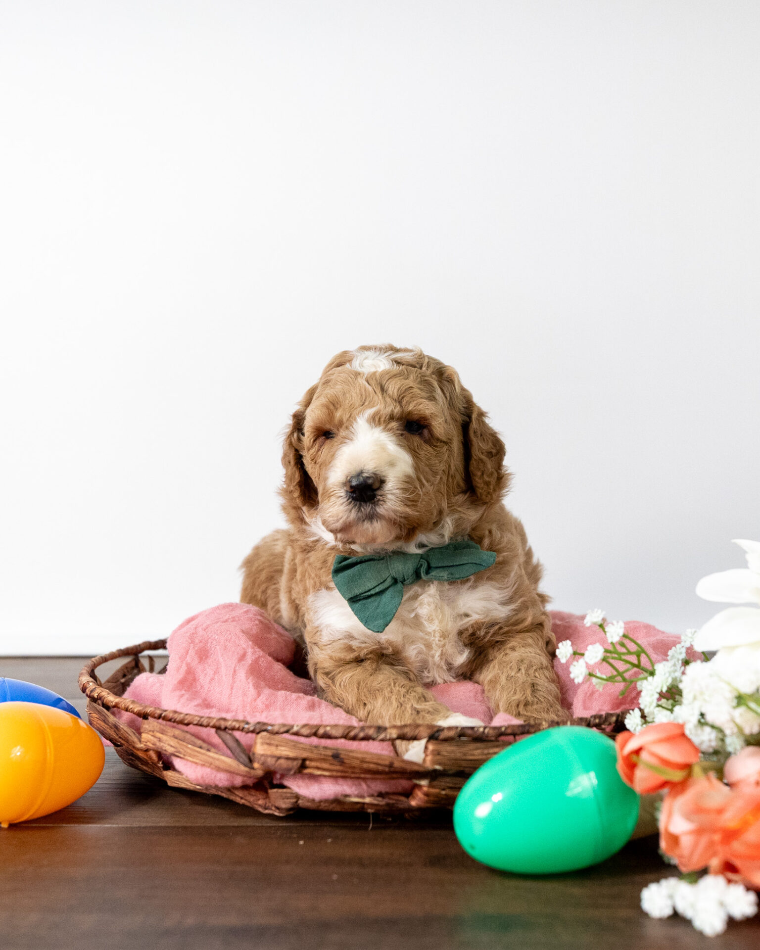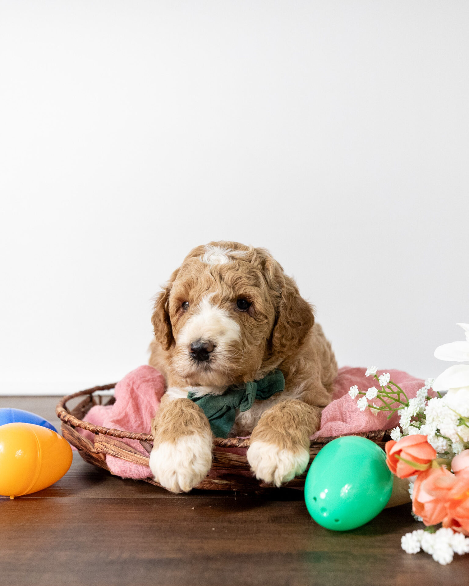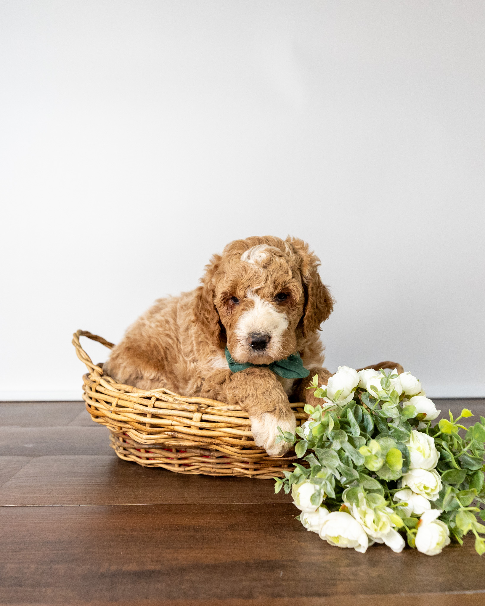 Feta is a standard multigen Goldendoodle puppy with a stunning light red coat with forehead, chest, throat, toes, and tail tip markings. He will be ready for her forever home April 25th! His soft, fluffy coat is hypoallergenic and non-shedding, ensuring endless snuggles without fear of allergic reactions.