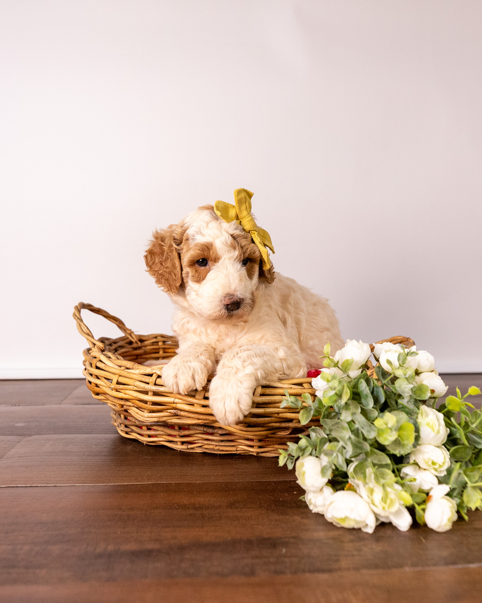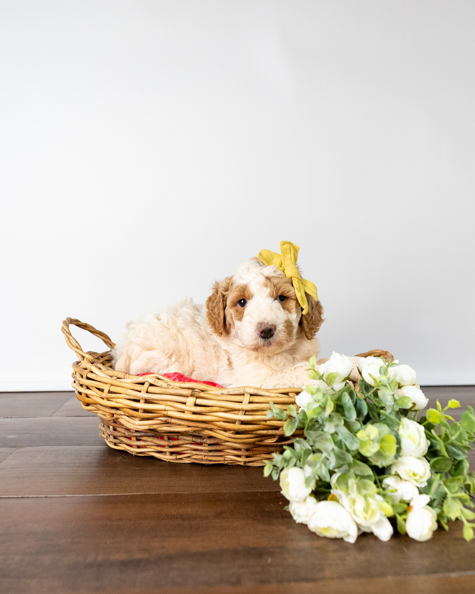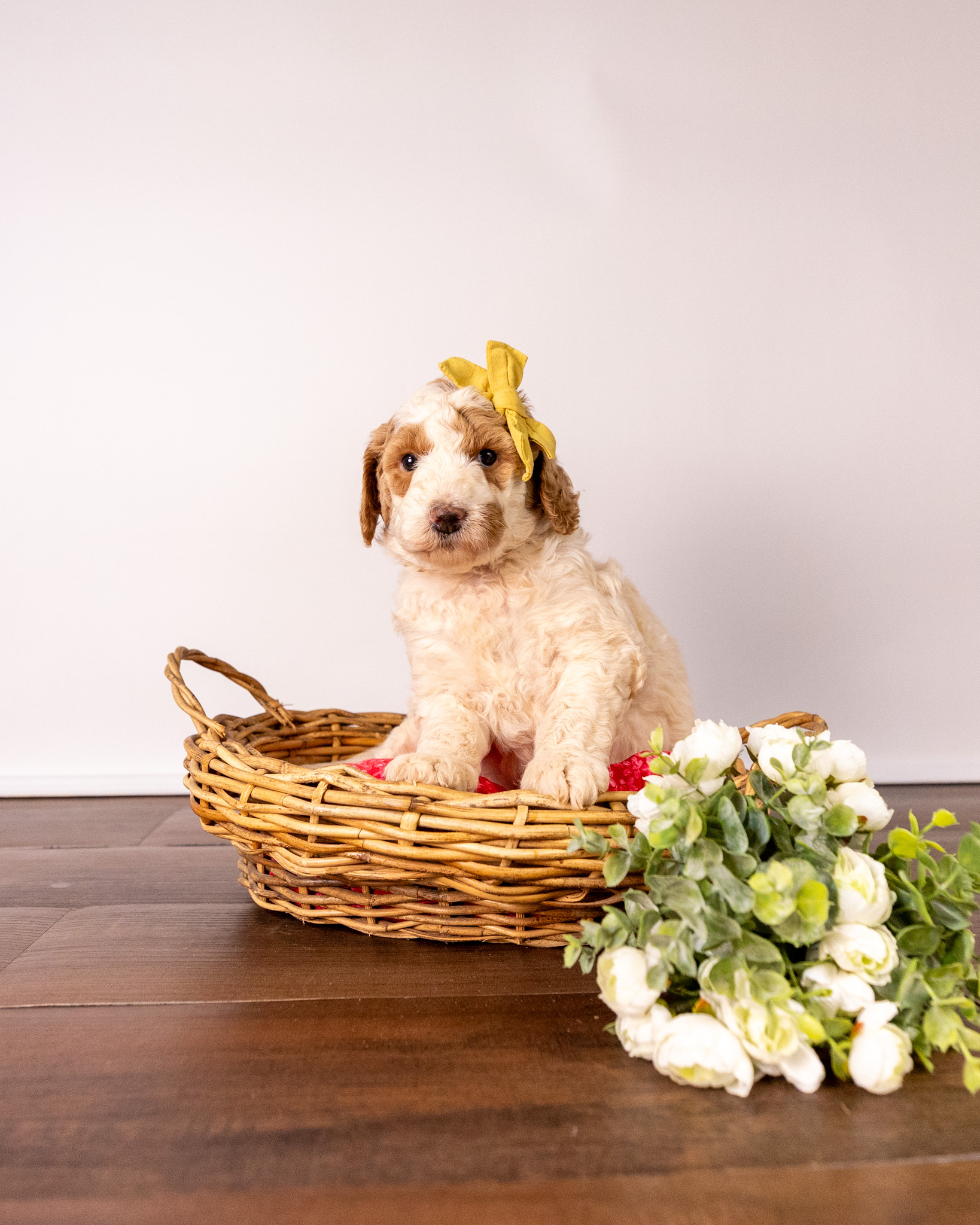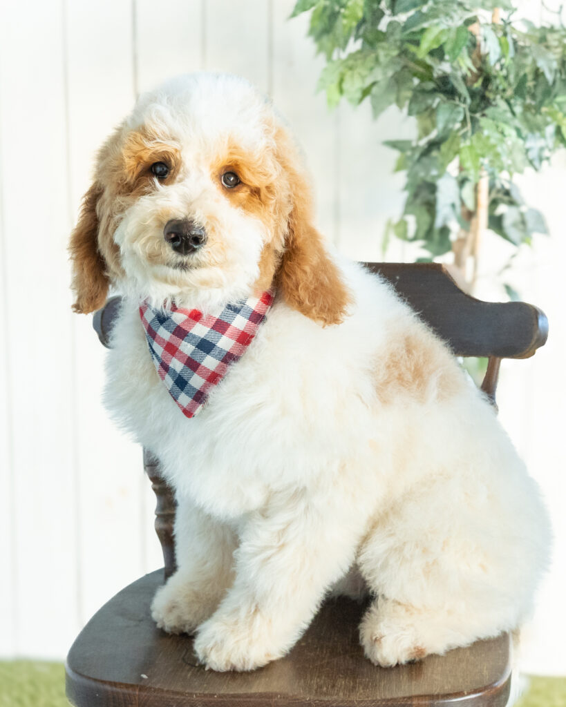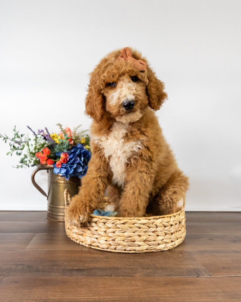 Gouda is a standard multigen Goldendoodle puppy with a stunning red & white coat – parti. She will be ready for her forever home April 28th! Her soft, fluffy coat is hypoallergenic and non-shedding, ensuring endless snuggles without fear of allergic reactions.