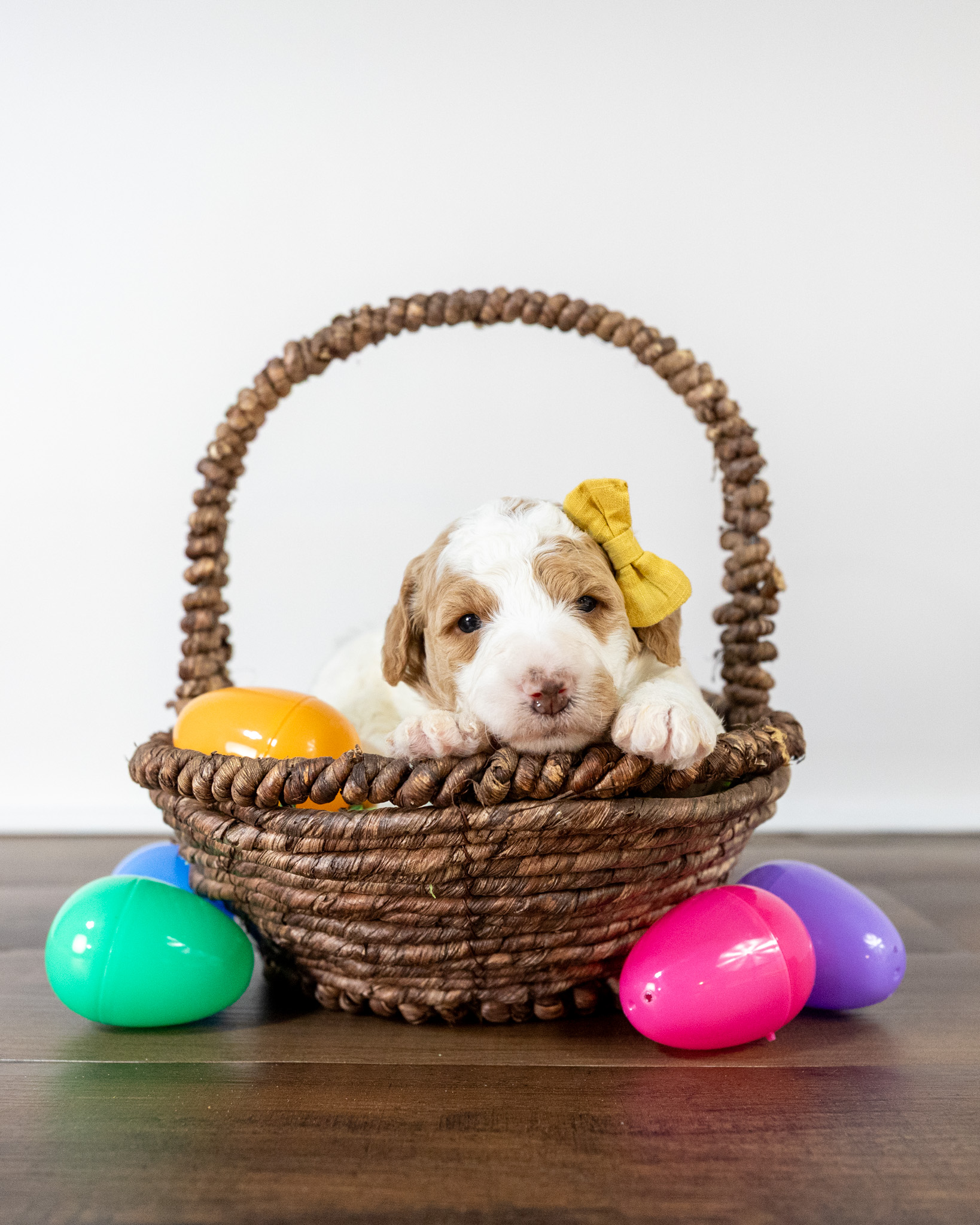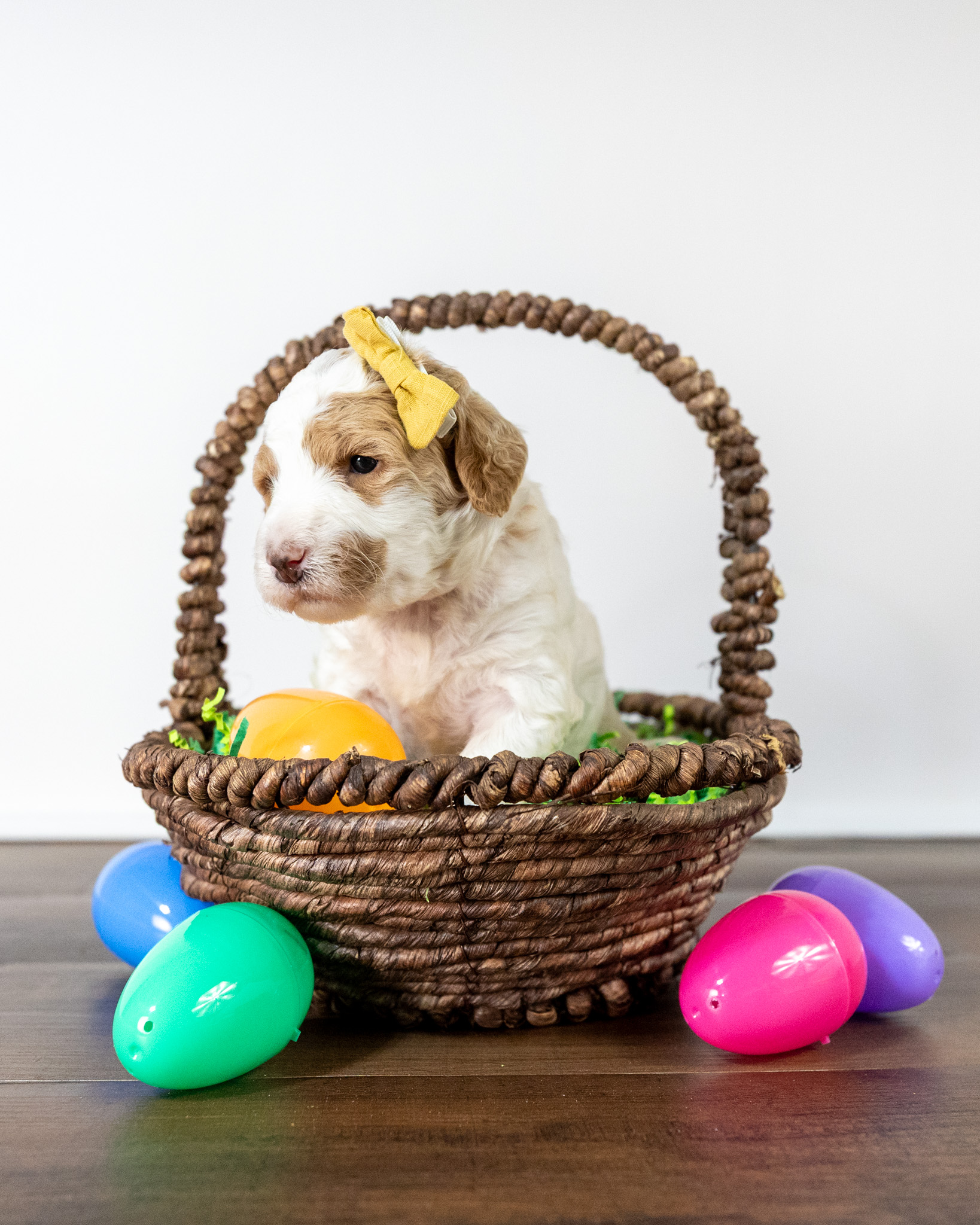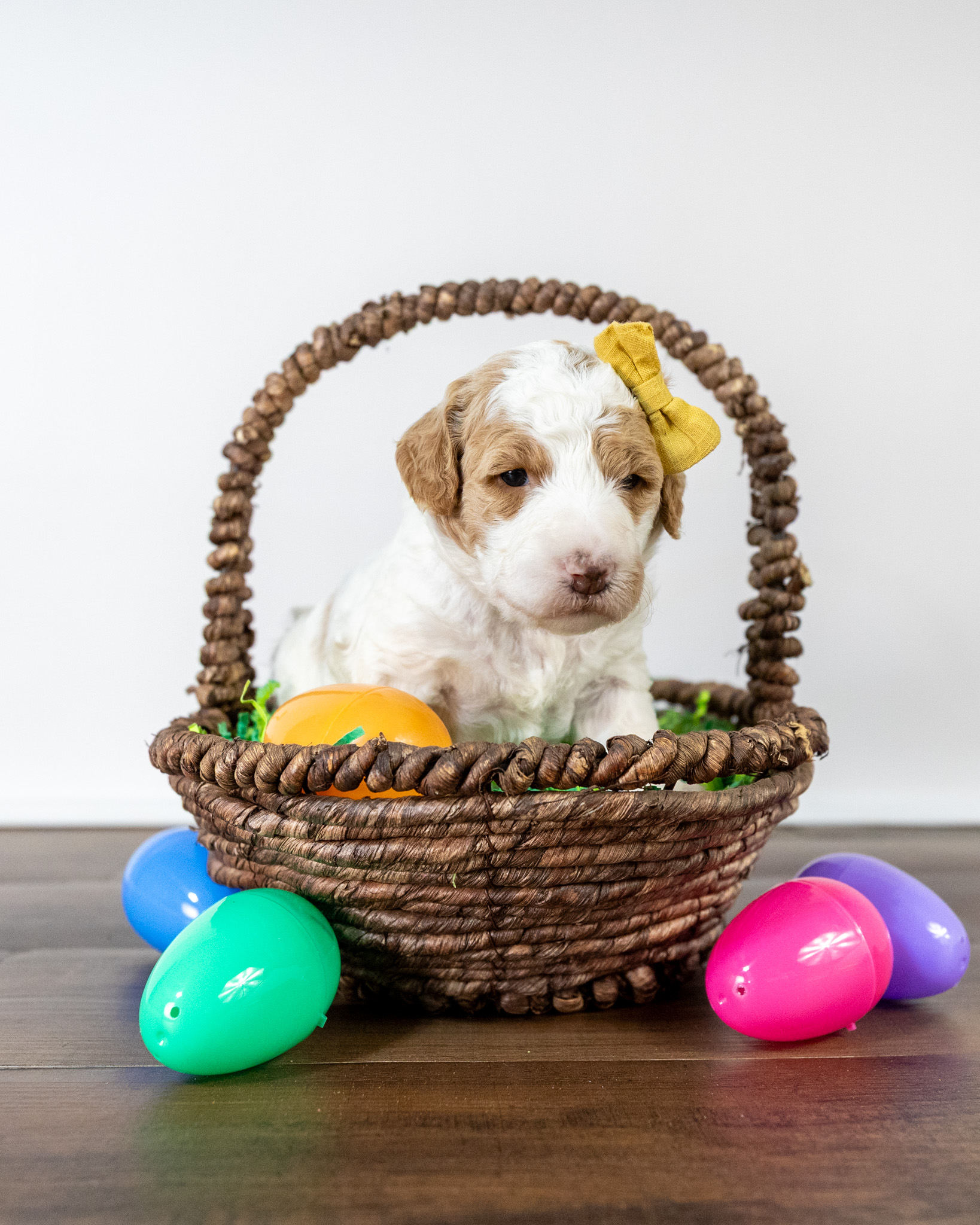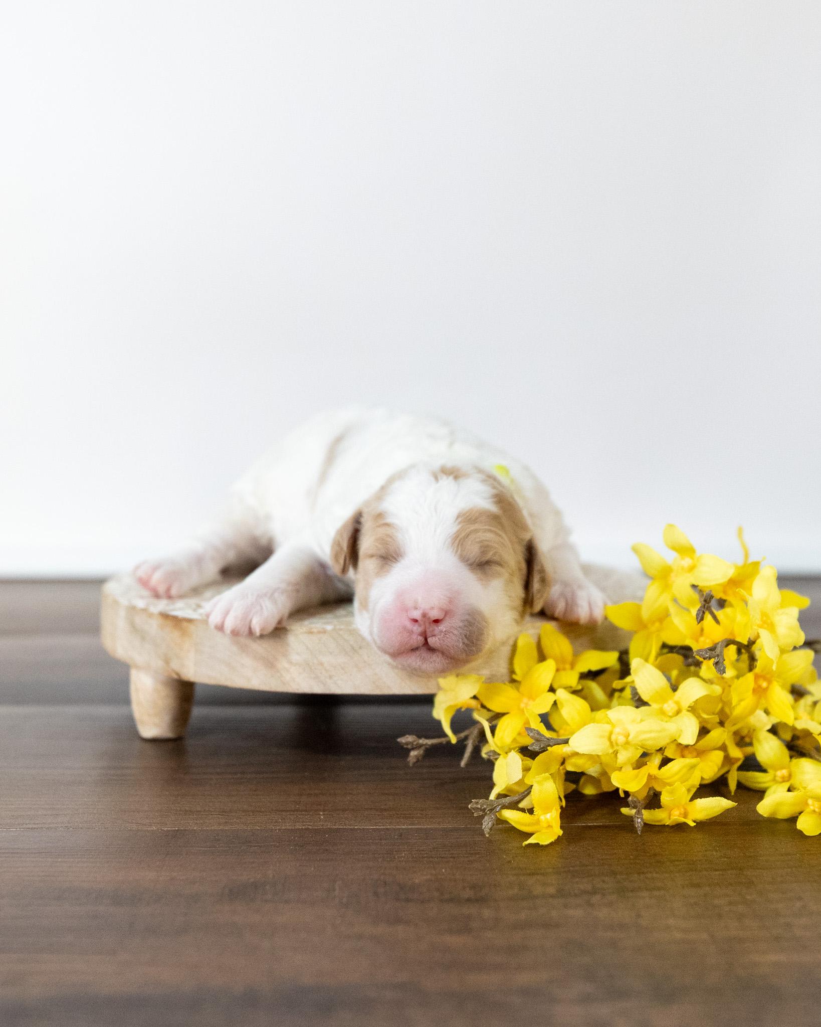 Gouda is a standard multigen Goldendoodle puppy with a stunning red & white coat – parti. She will be ready for her forever home April 28th! Her soft, fluffy coat is hypoallergenic and non-shedding, ensuring endless snuggles without fear of allergic reactions.