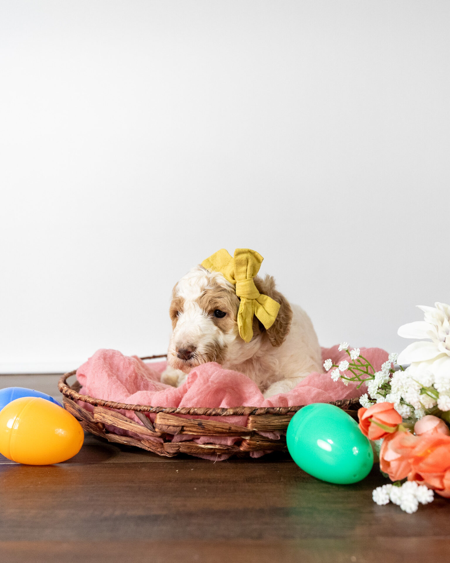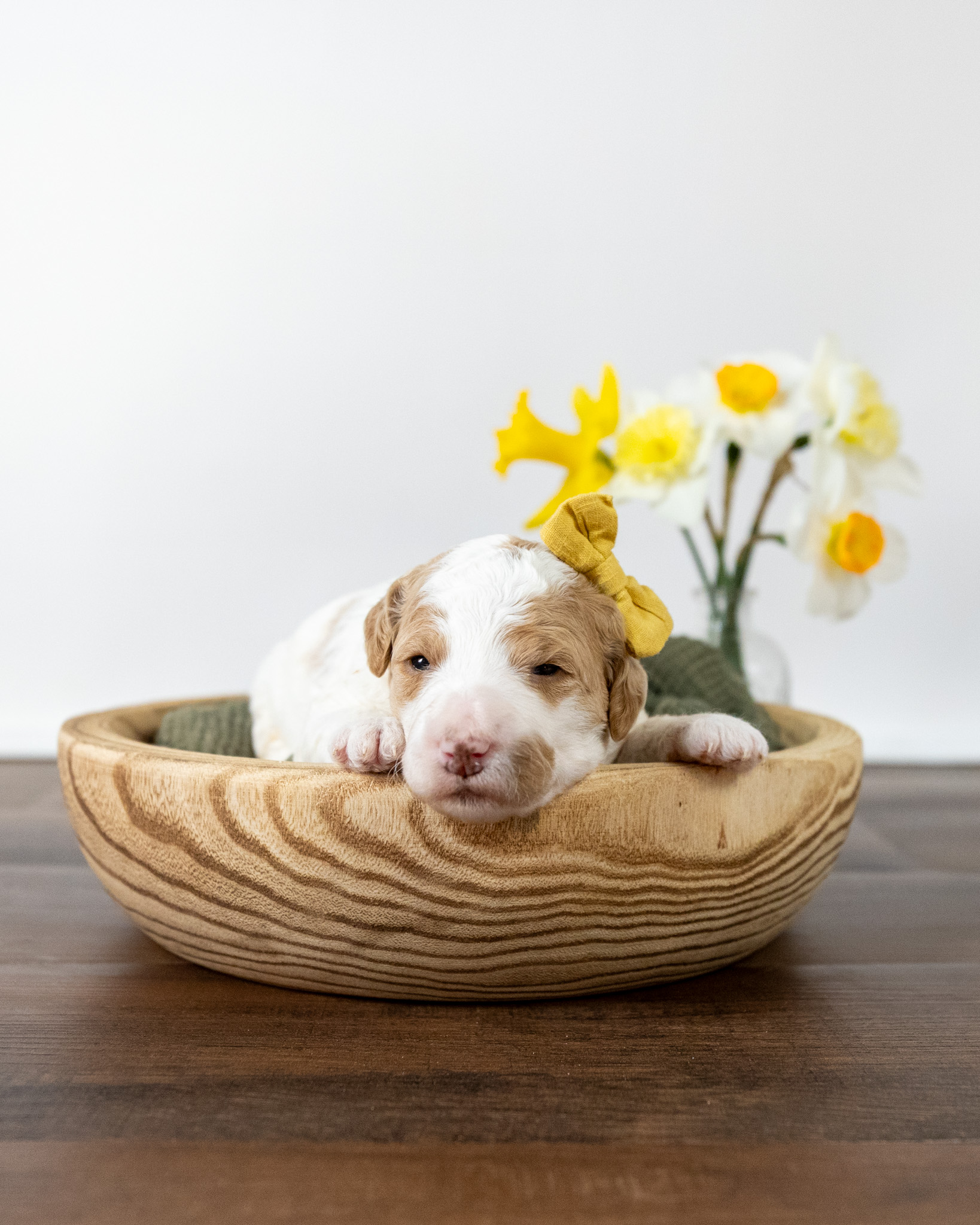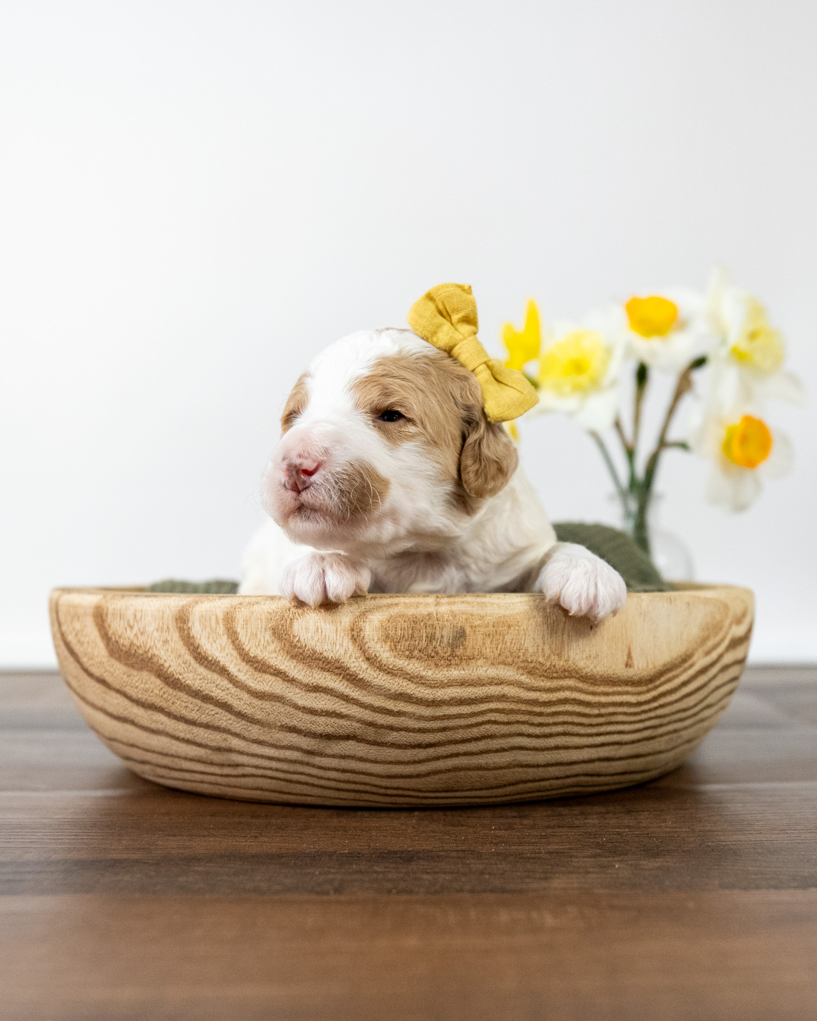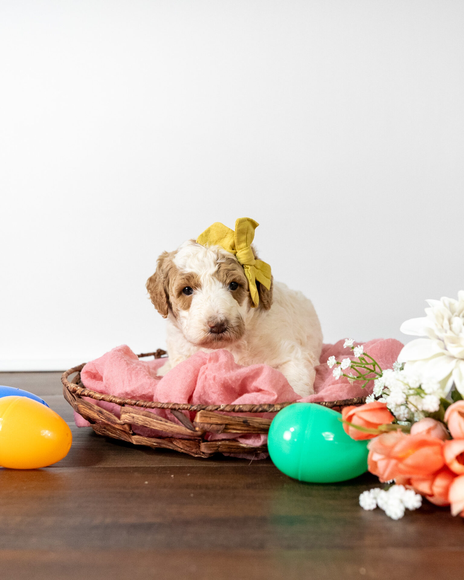 Gouda is a standard multigen Goldendoodle puppy with a stunning red & white coat – parti. She will be ready for her forever home April 28th! Her soft, fluffy coat is hypoallergenic and non-shedding, ensuring endless snuggles without fear of allergic reactions.