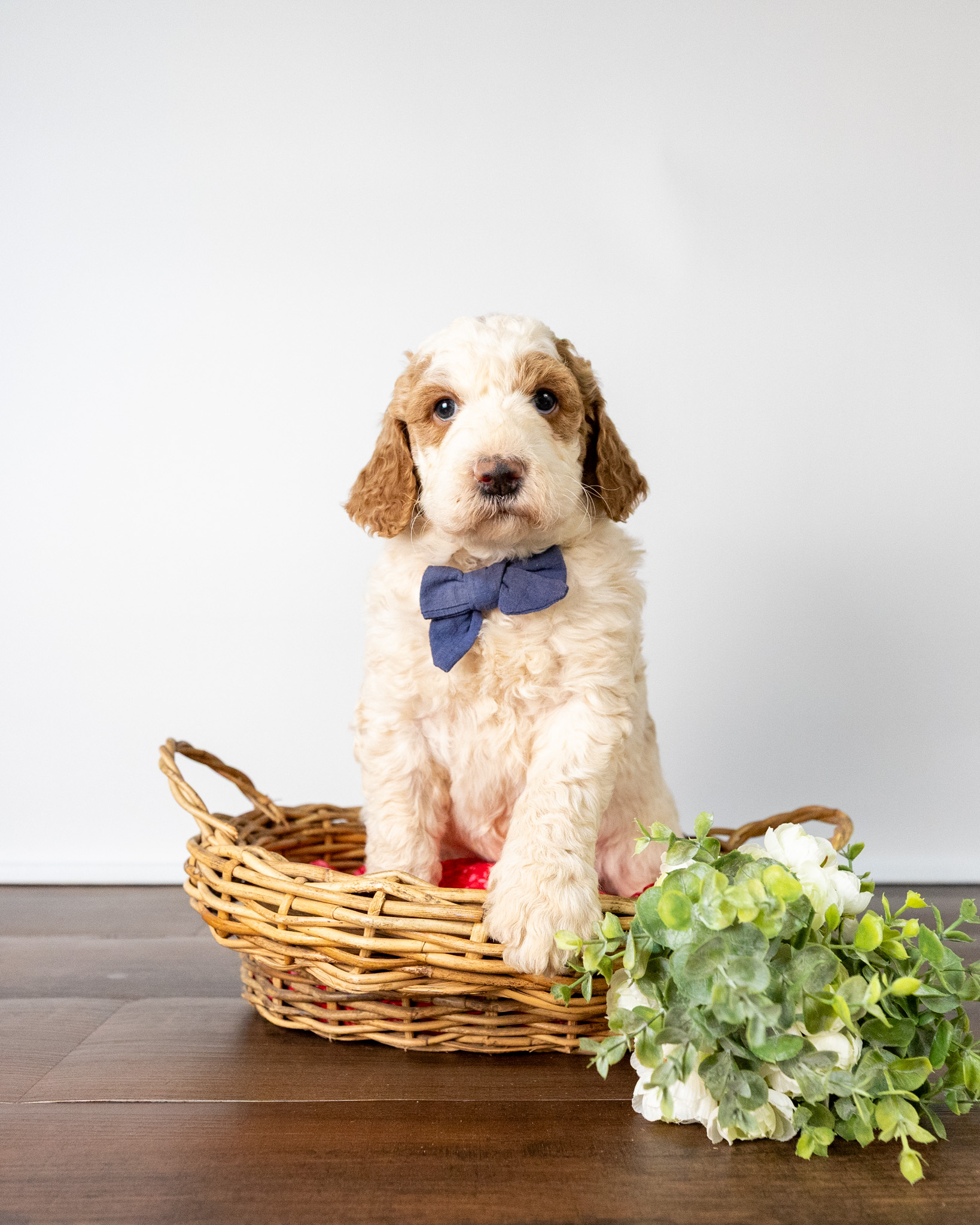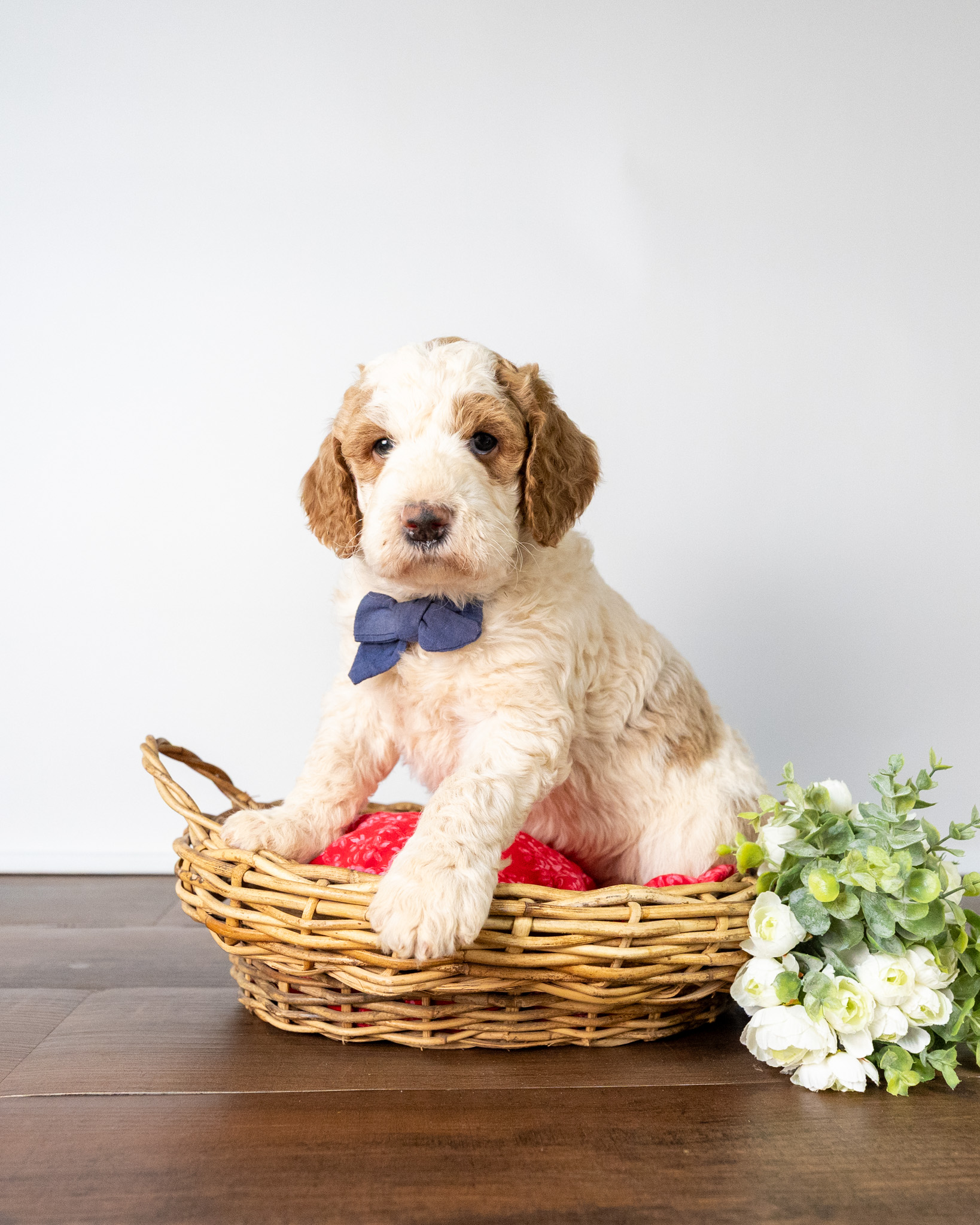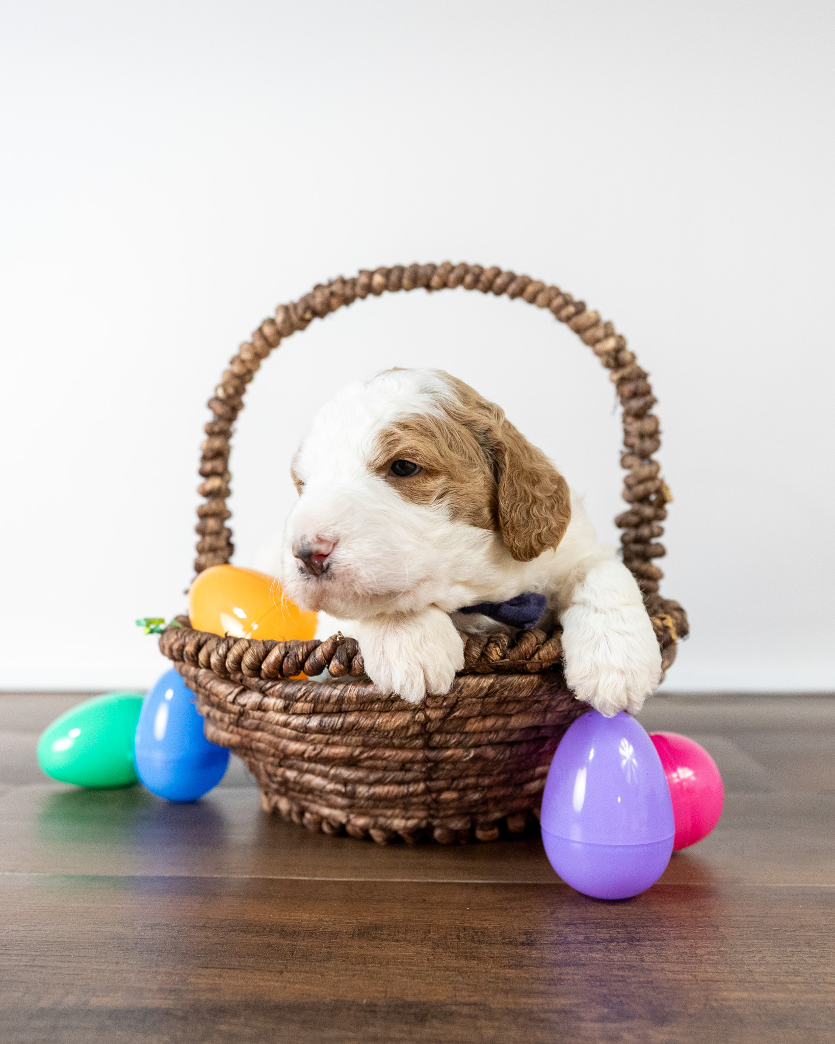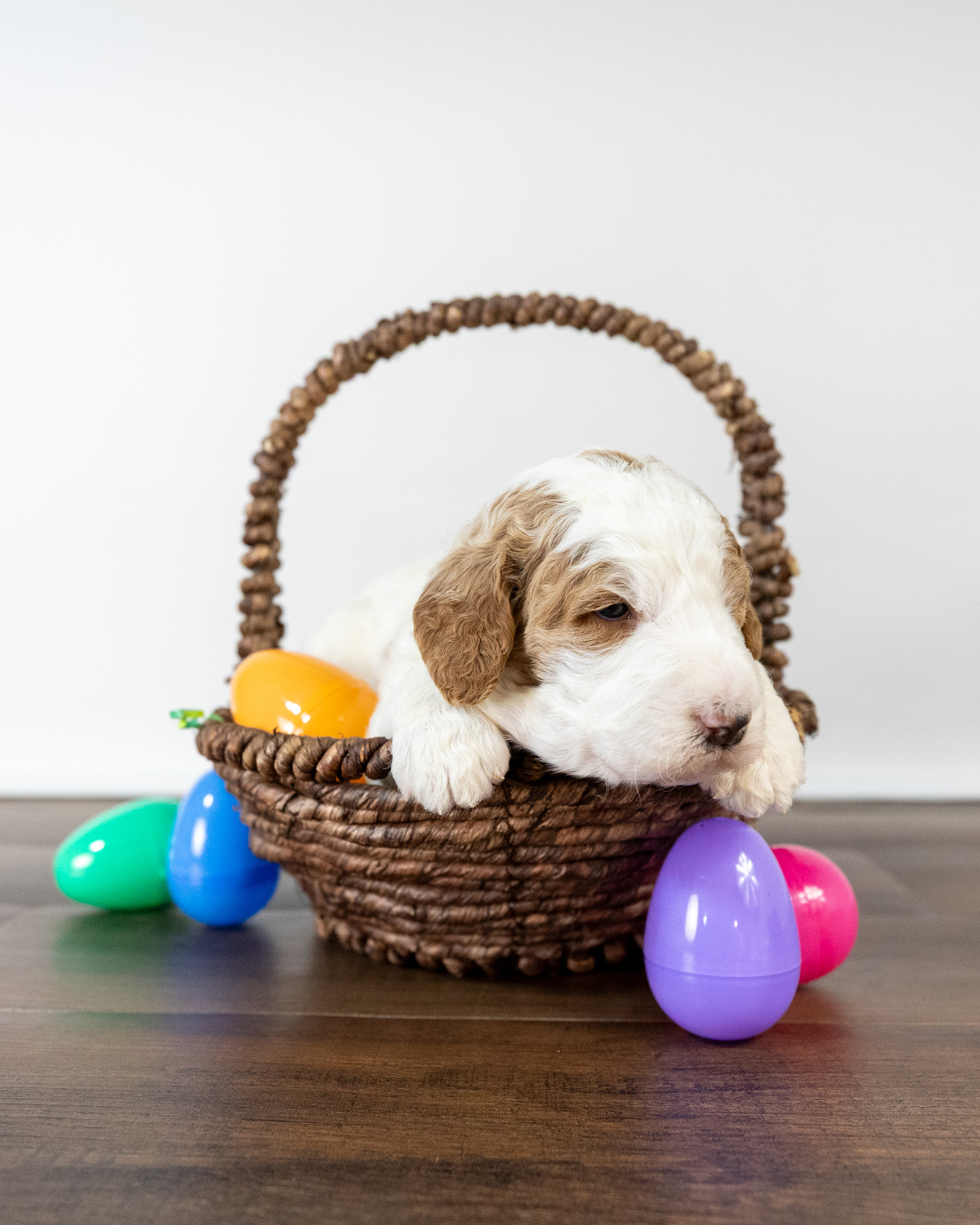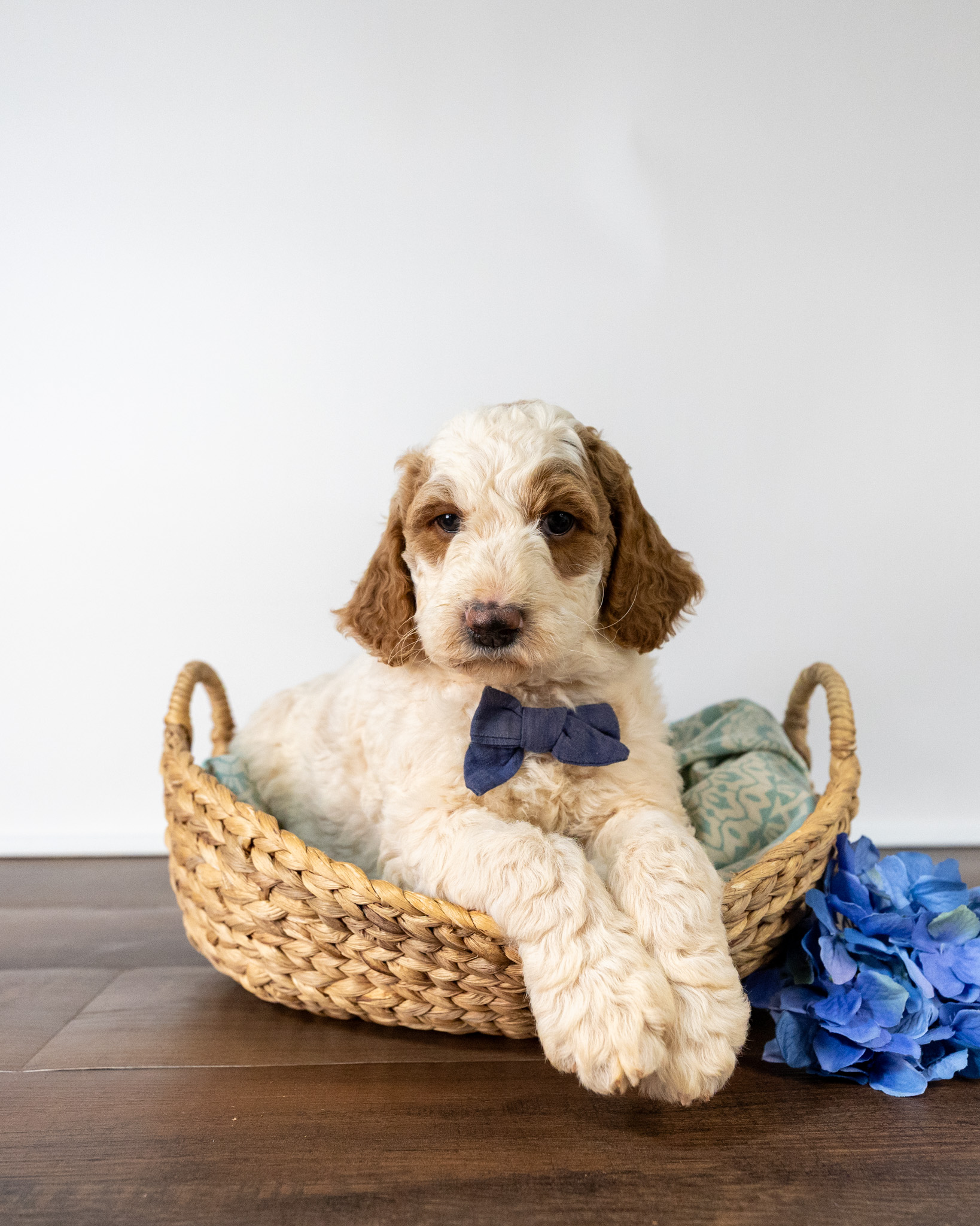 Swiss is a standard multigen Goldendoodle puppy with a stunning red & white coat – parti. He will be ready for his forever home April 28th! His soft, fluffy coat is hypoallergenic and non-shedding, ensuring endless snuggles without fear of allergic reactions.