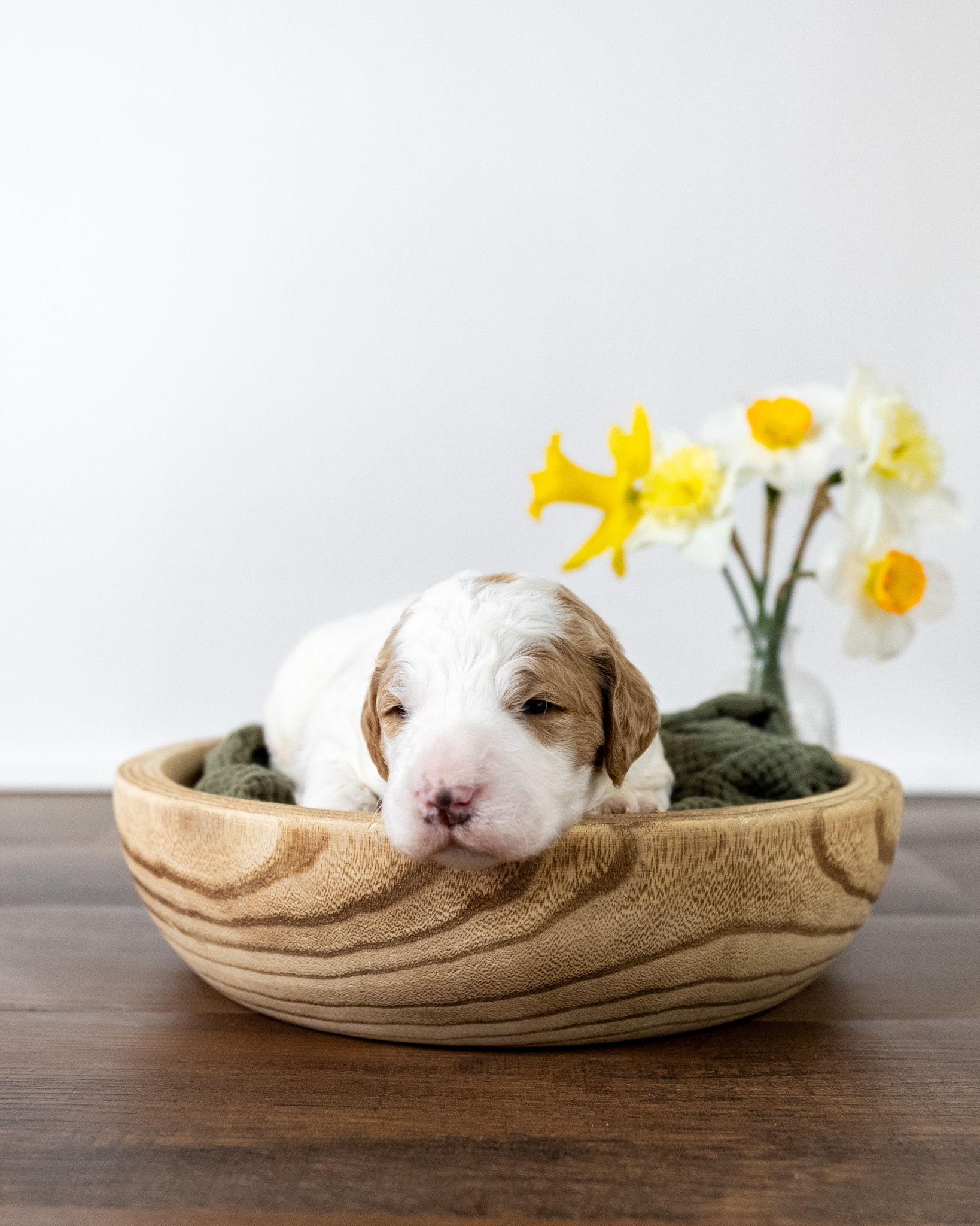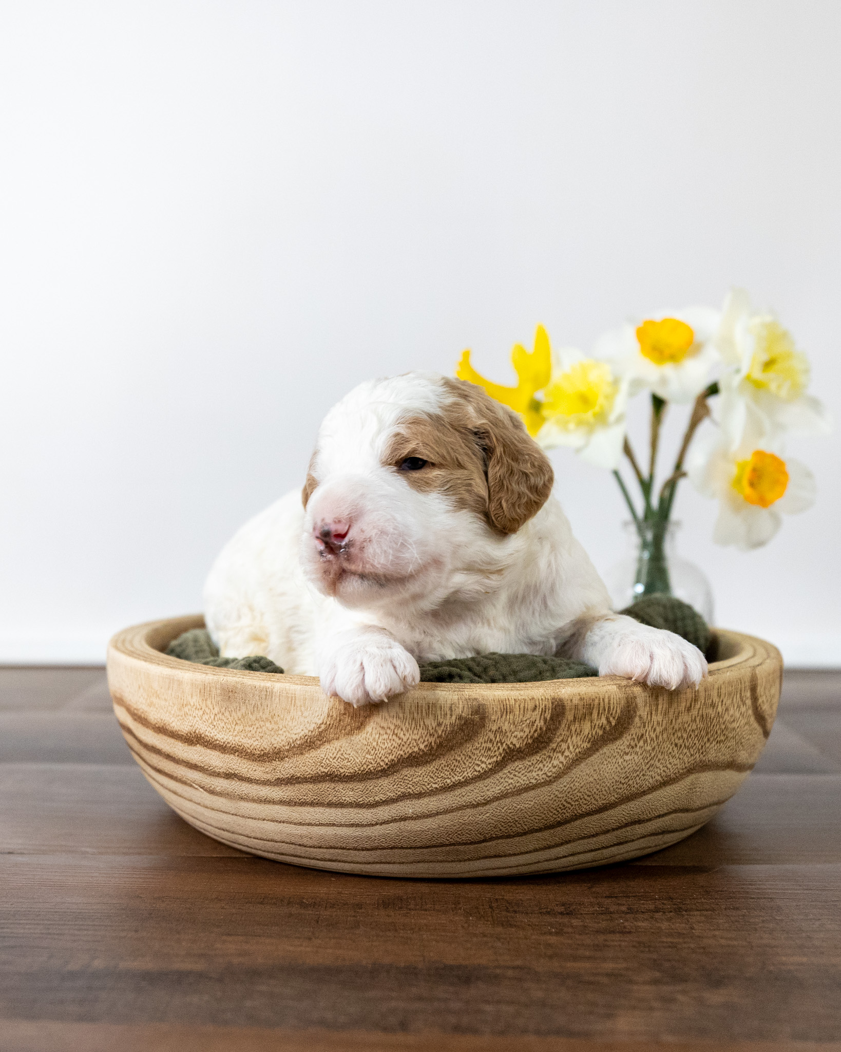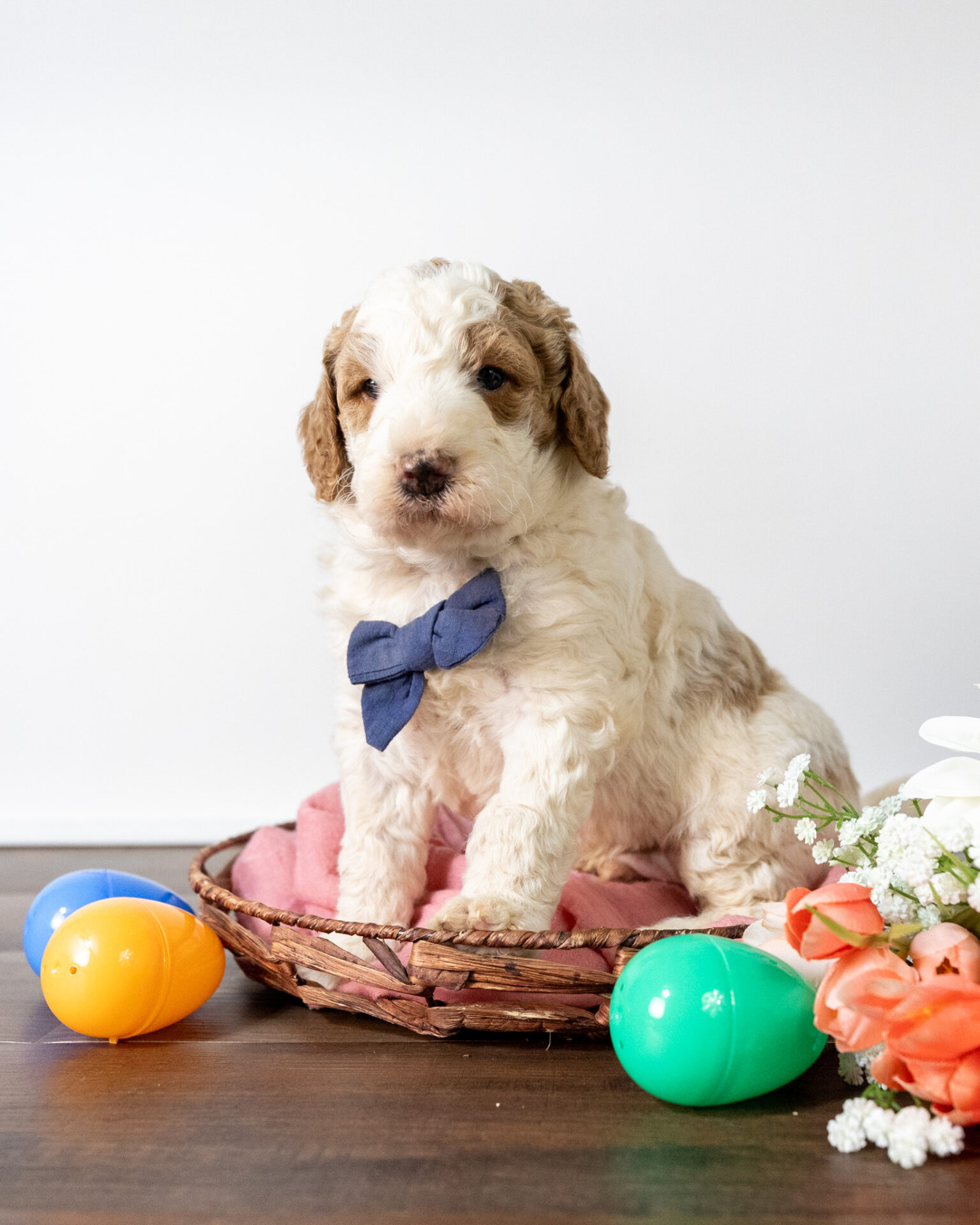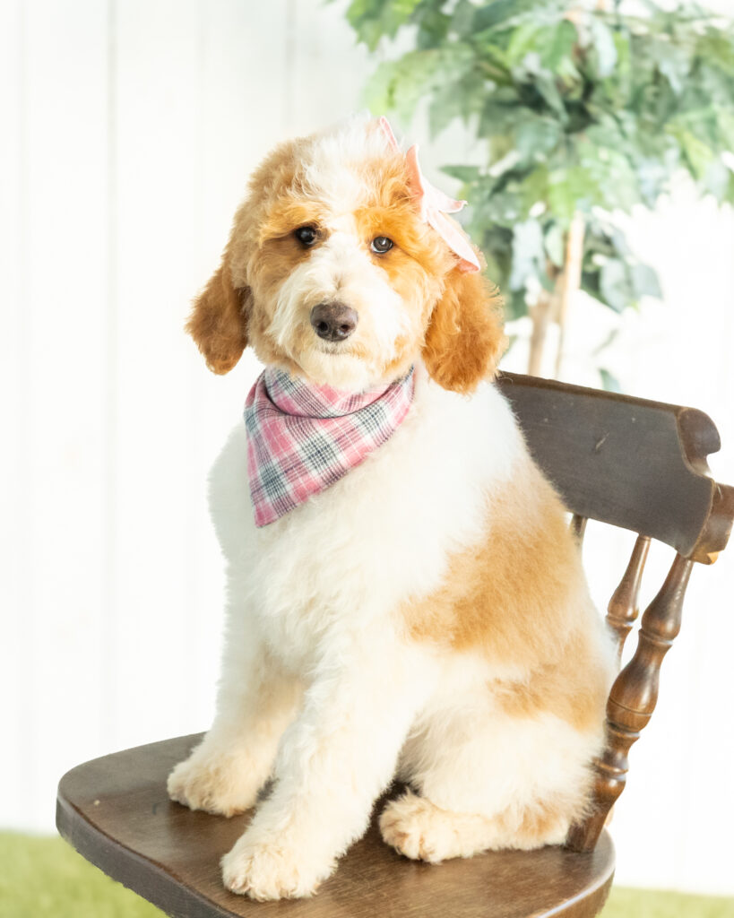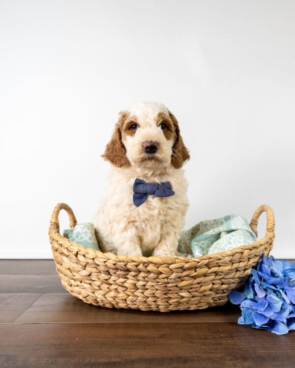 Swiss is a standard multigen Goldendoodle puppy with a stunning red & white coat – parti. He will be ready for his forever home April 28th! His soft, fluffy coat is hypoallergenic and non-shedding, ensuring endless snuggles without fear of allergic reactions.