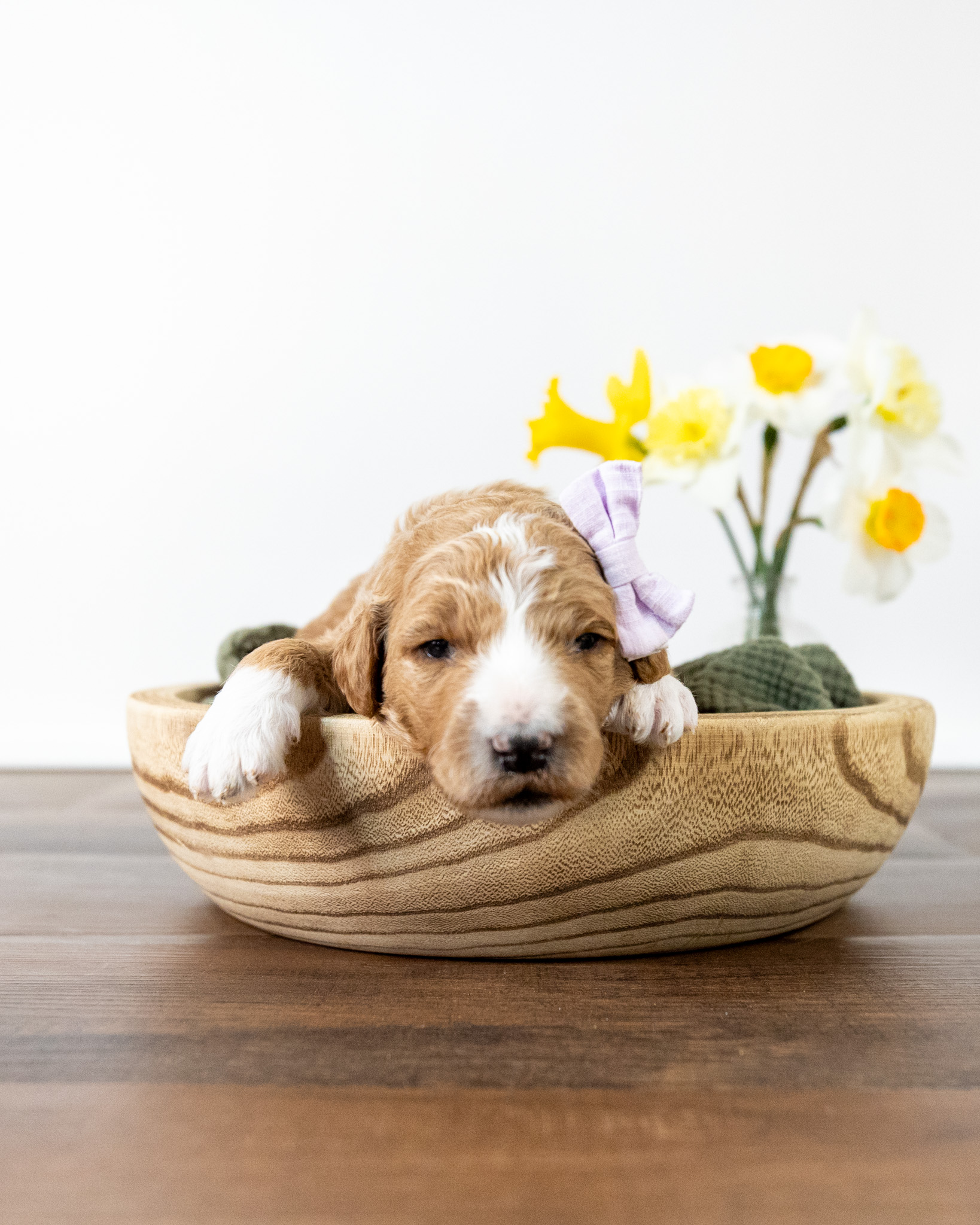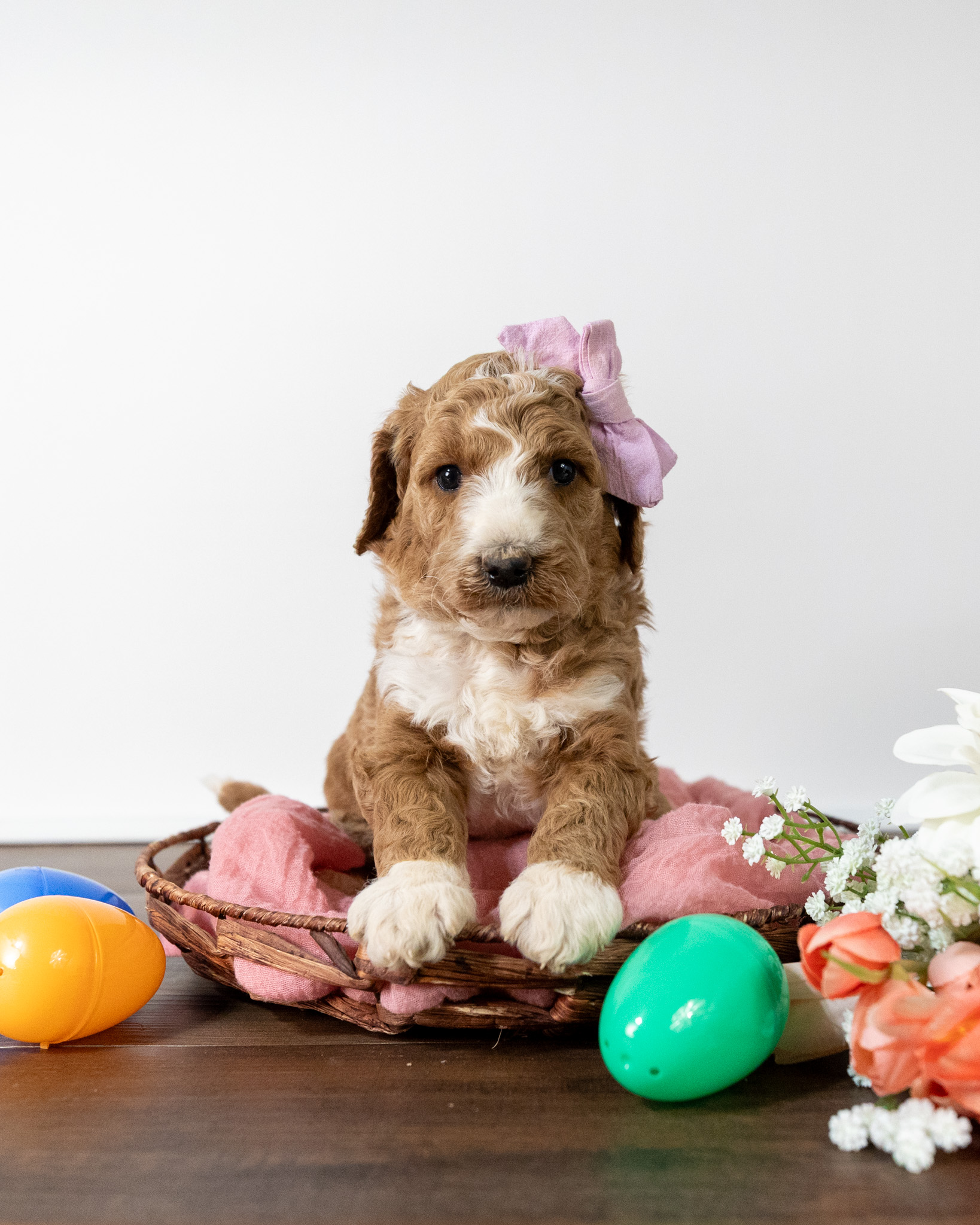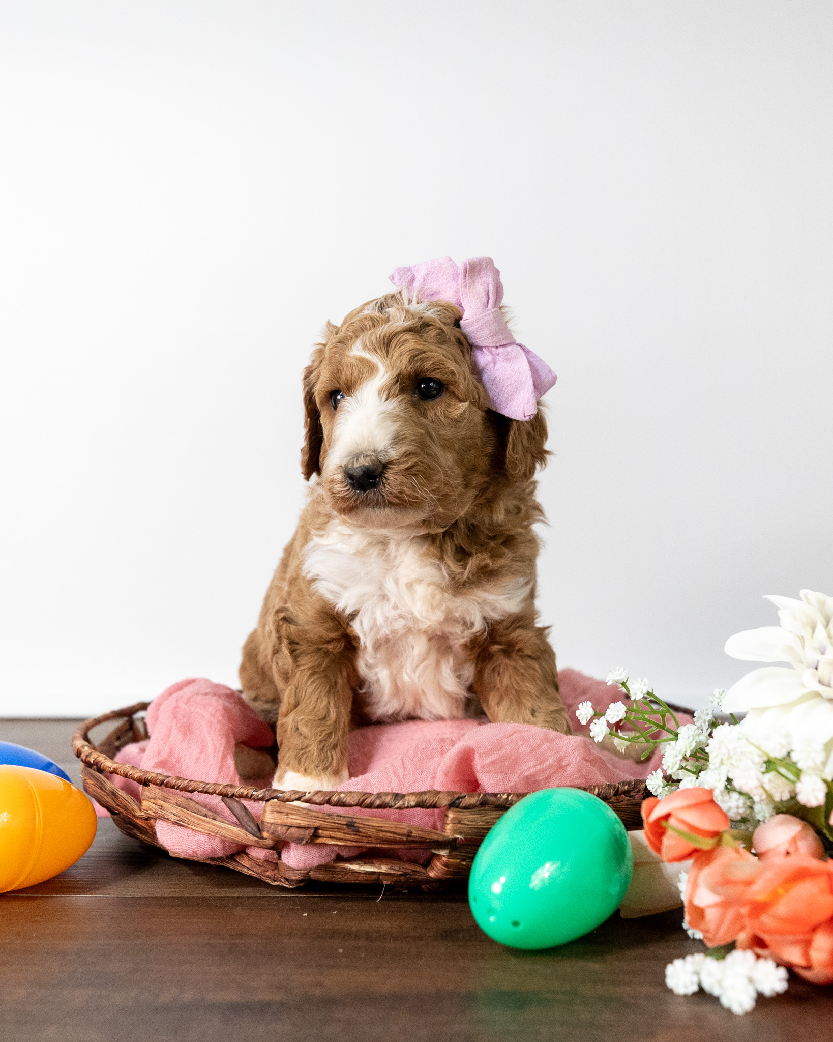 Connie is a standard multigen Goldendoodle puppy with a stunning red coat with forehead, chest, throat, toes, and tail tip markings. She will be ready for her forever home April 25th! Her soft, fluffy coat is hypoallergenic and non-shedding, ensuring endless snuggles without fear of allergic reactions.