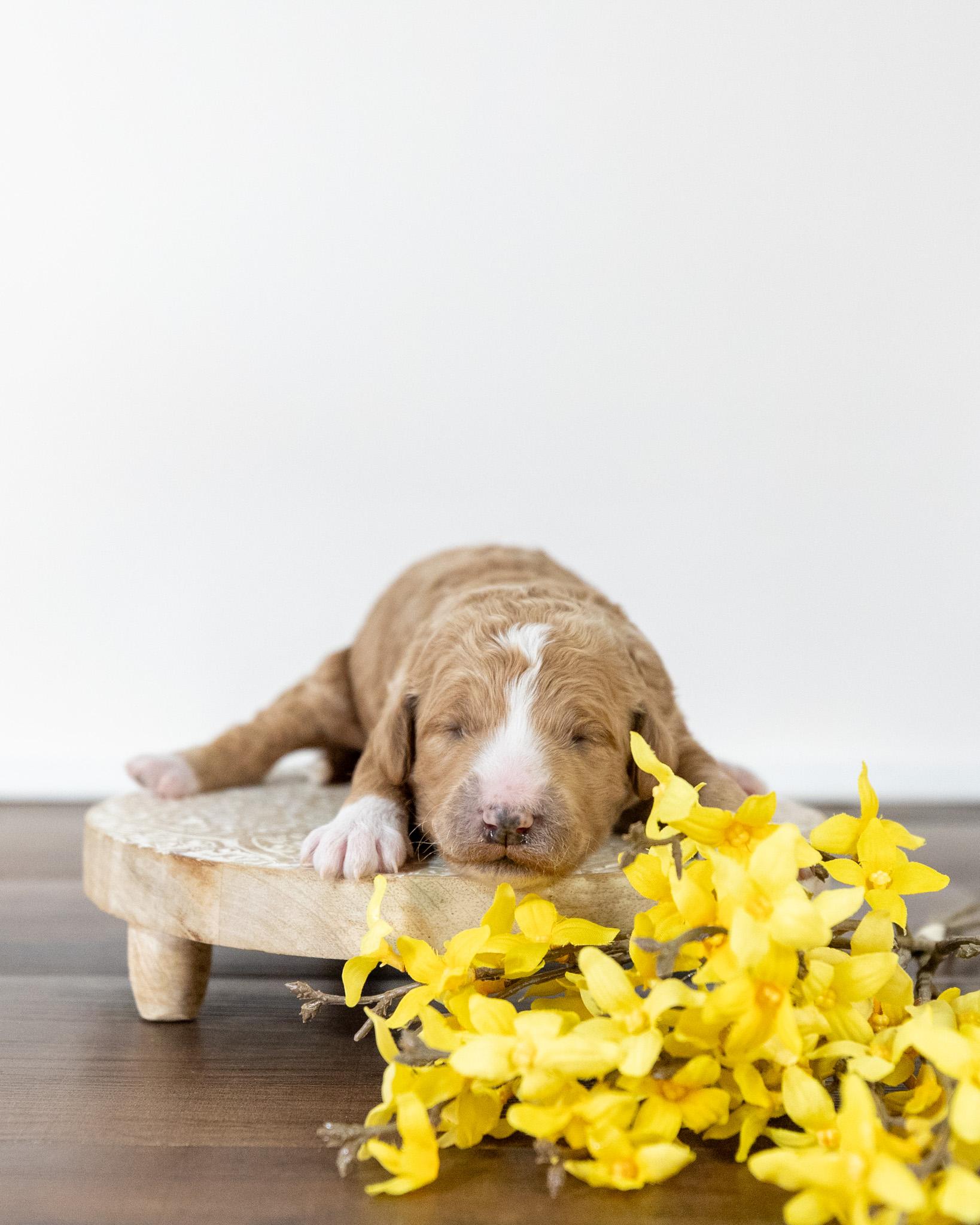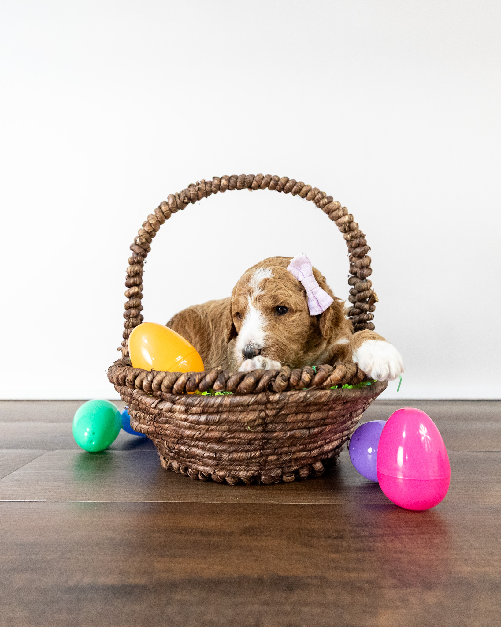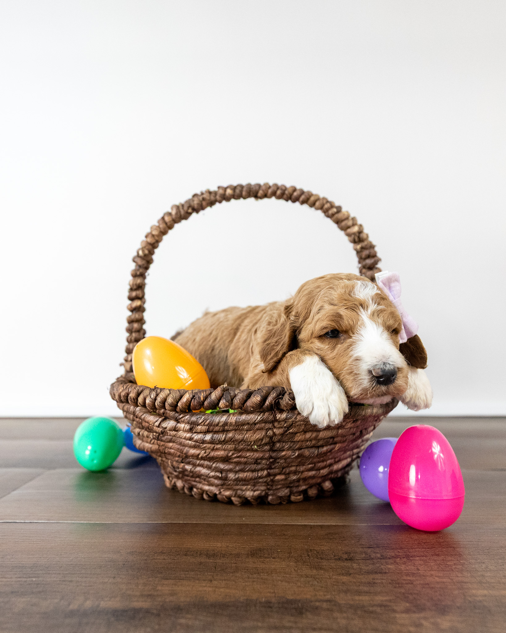 Connie is a standard multigen Goldendoodle puppy with a stunning red coat with forehead, chest, throat, toes, and tail tip markings. She will be ready for her forever home April 25th! Her soft, fluffy coat is hypoallergenic and non-shedding, ensuring endless snuggles without fear of allergic reactions.