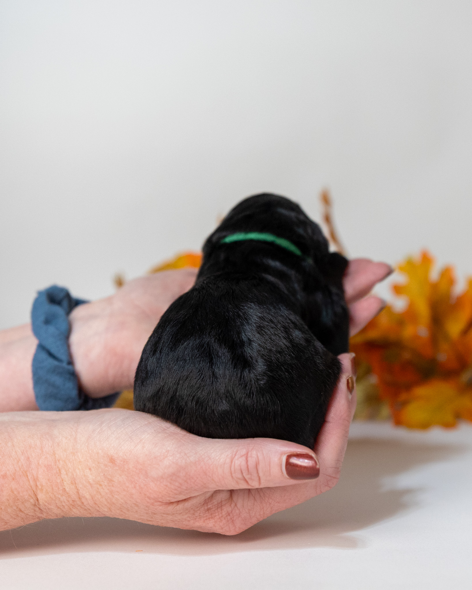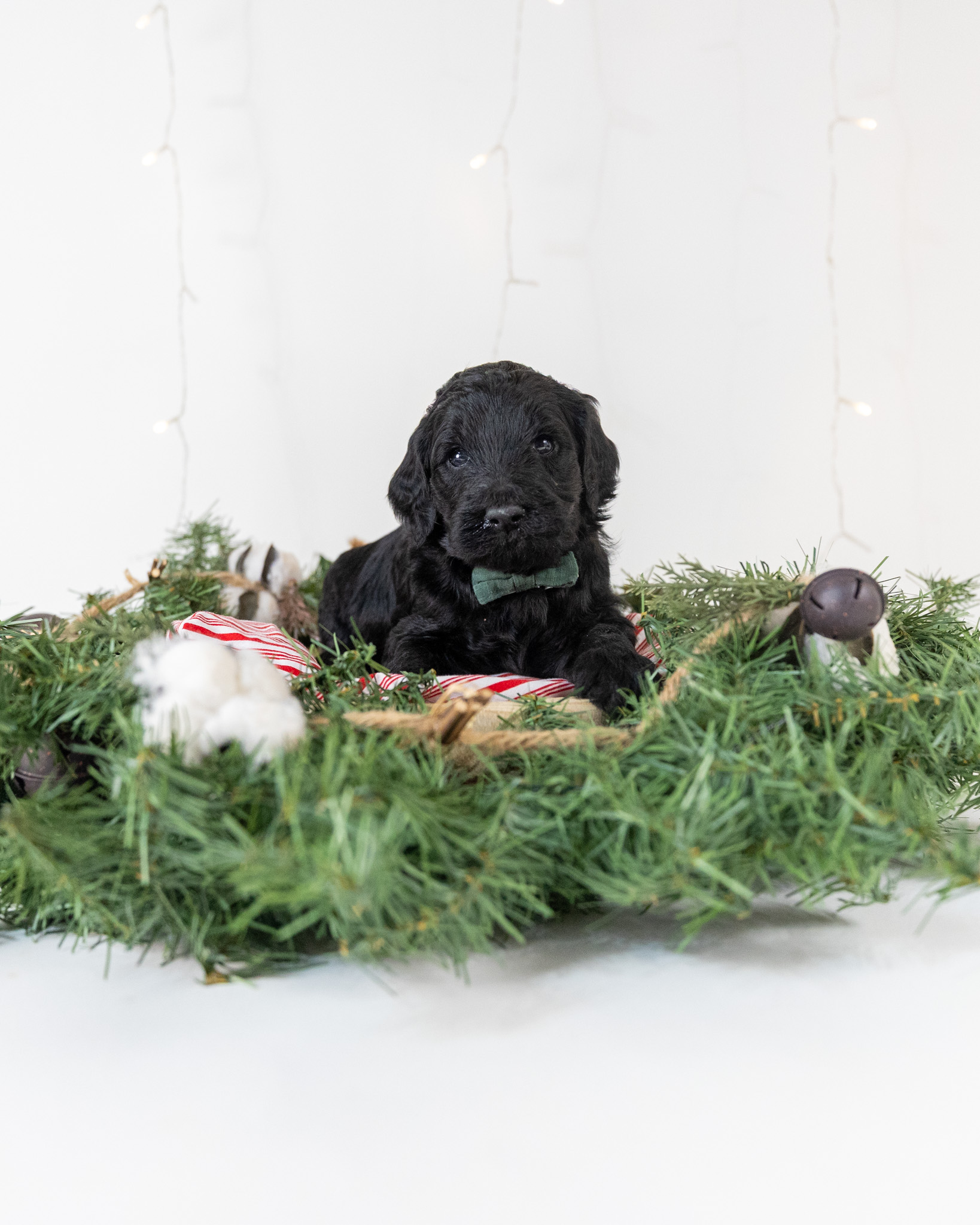 Evergreen is a standard multigen Goldendoodle puppy who will be ready for his forever home January 7th! His soft, fluffy coat is hypoallergenic and non-shedding, ensuring endless snuggles without fear of allergic reactions.