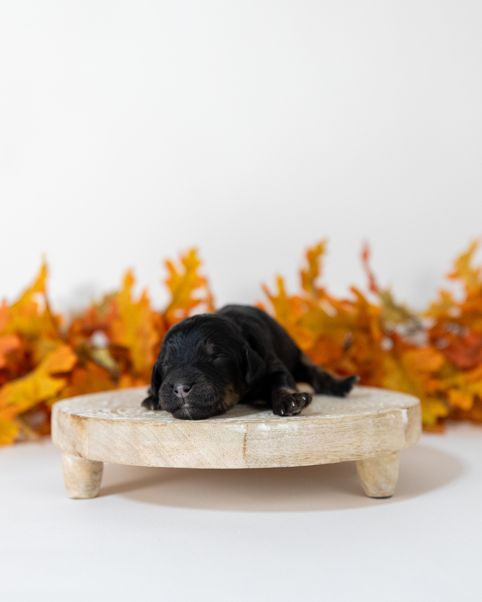 Viola is a black phantom female Goldendoodle puppy who will be ready for her forever home around August 12th.