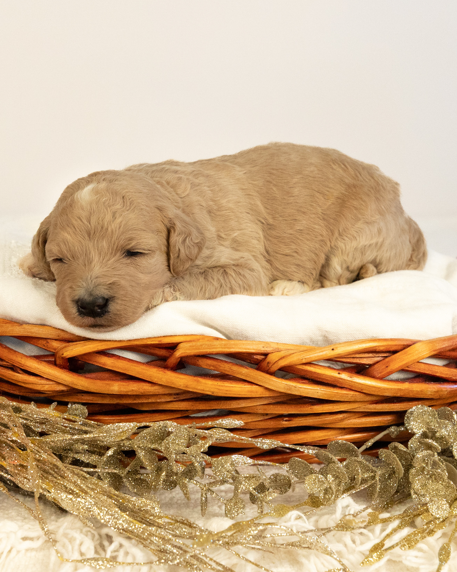 Snowflake is a multigen standard Goldendoodle puppy who will be ready for her fur-ever home around December 19th! Her soft, fluffy coat is hypoallergenic and non-shedding, ensuring endless snuggles without fear of allergic reactions. With a loyal and affectionate temperament, she is the perfect forever friend!