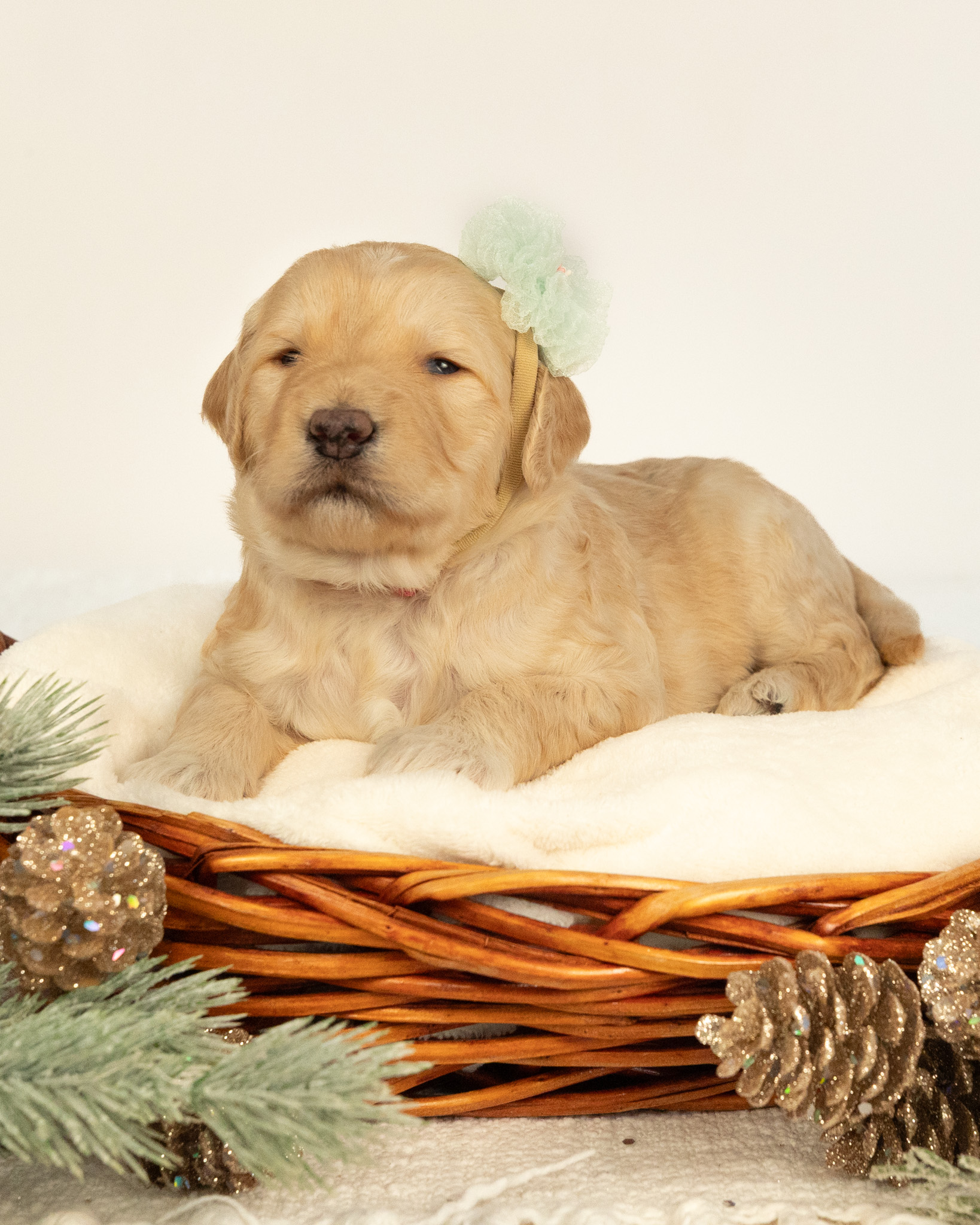 Mistletoe is a multigen medium Goldendoodle puppy who will be ready for her fur-ever home around January 14th! Her soft, fluffy coat is hypoallergenic and non-shedding, ensuring endless snuggles without fear of allergic reactions. With a loyal and affectionate temperament, she is the perfect forever friend!