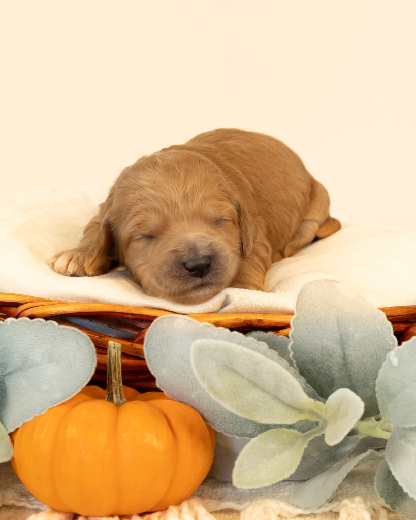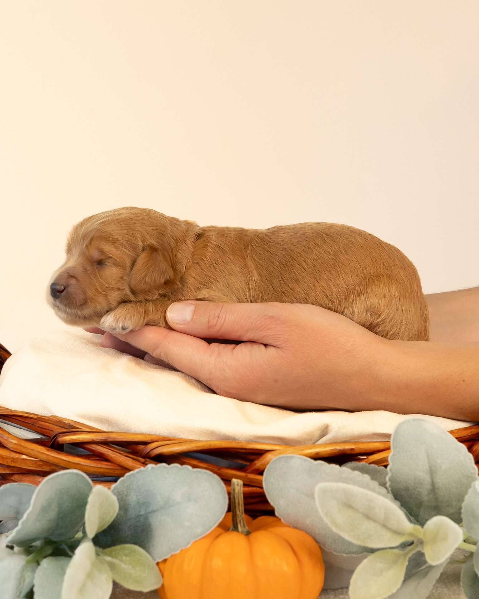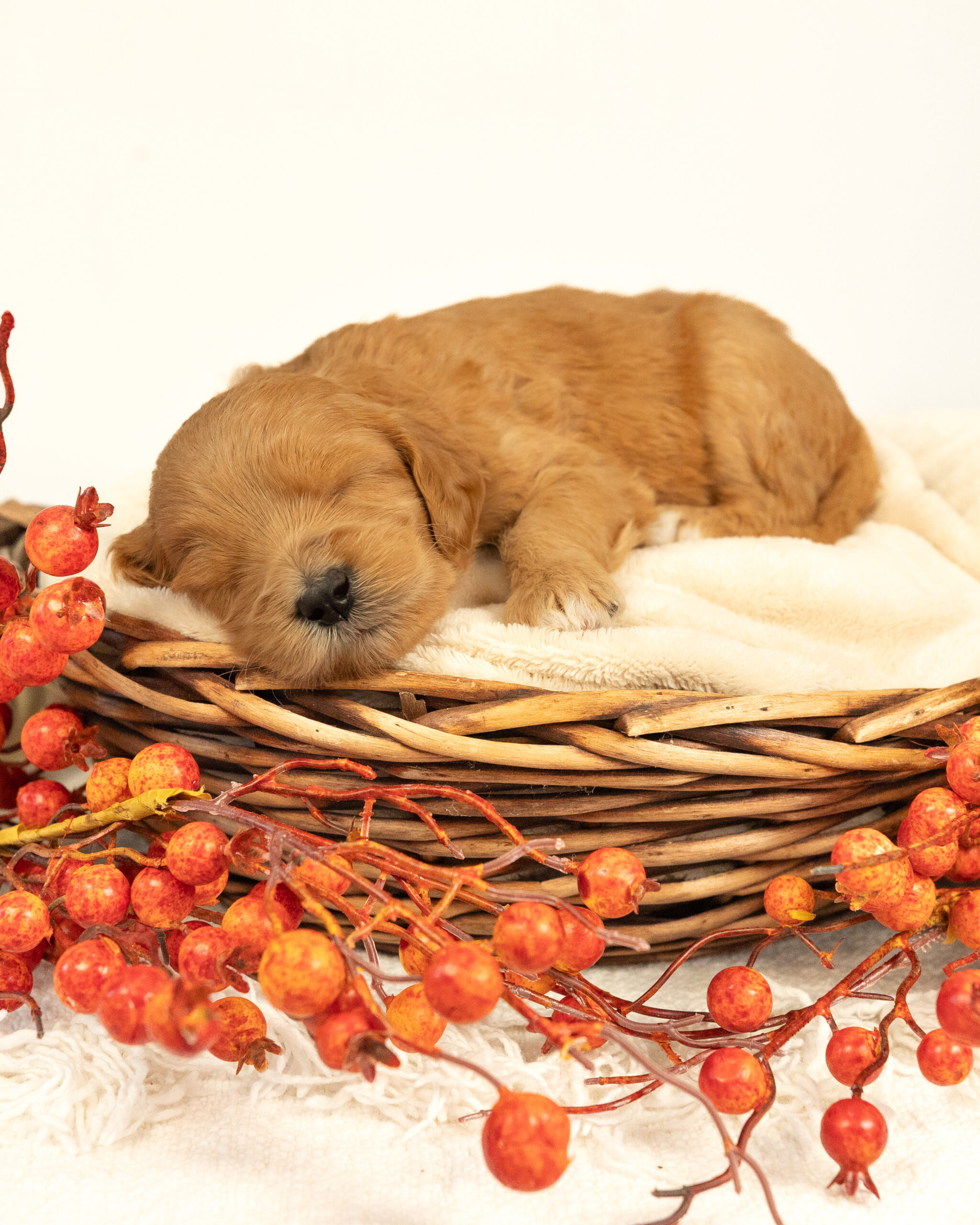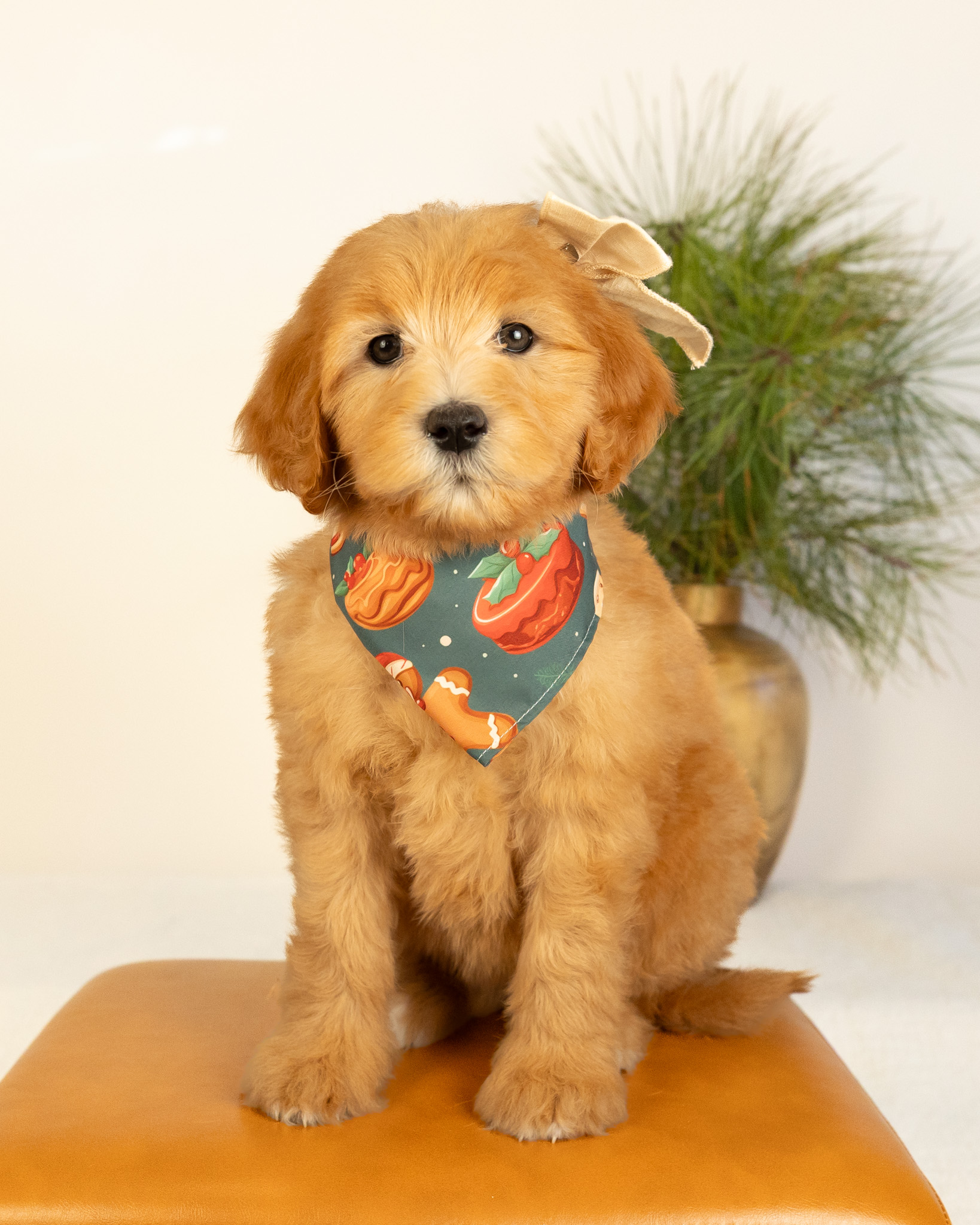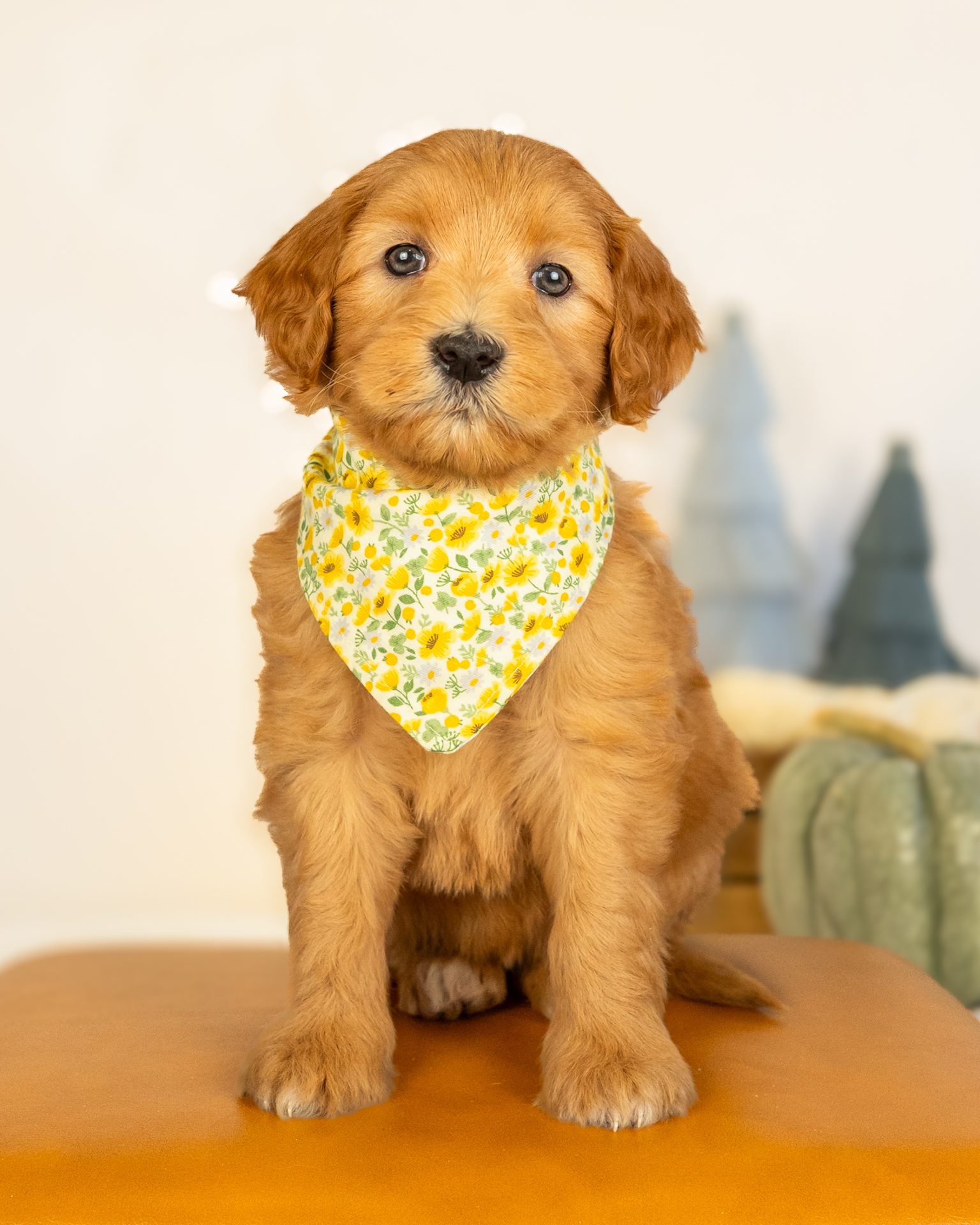 Lucy is a multigen Goldendoodle puppy who will be ready for her fur-ever home around December 1st! Her soft, fluffy coat is hypoallergenic and non-shedding, ensuring endless snuggles without fear of allergic reactions. With a loyal and affectionate temperament, she is the perfect forever friend!