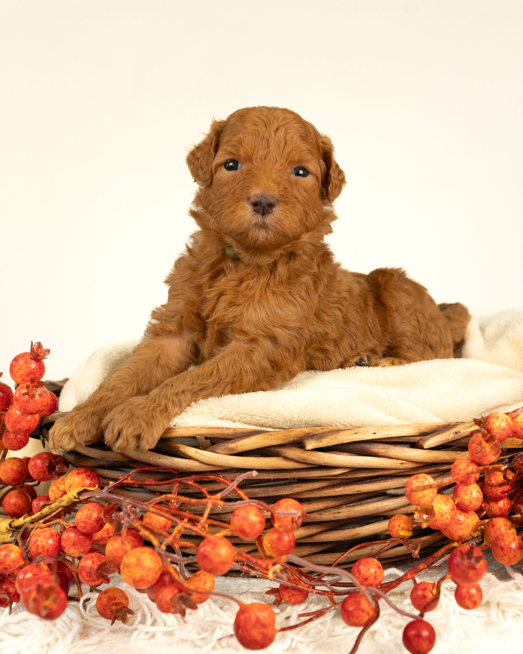 Schroeder is a multigen Goldendoodle puppy who will be ready for his fur-ever home around December 1st! His soft, fluffy coat is hypoallergenic and non-shedding, ensuring endless snuggles without fear of allergic reactions. With a loyal and affectionate temperament, he is the perfect forever friend!