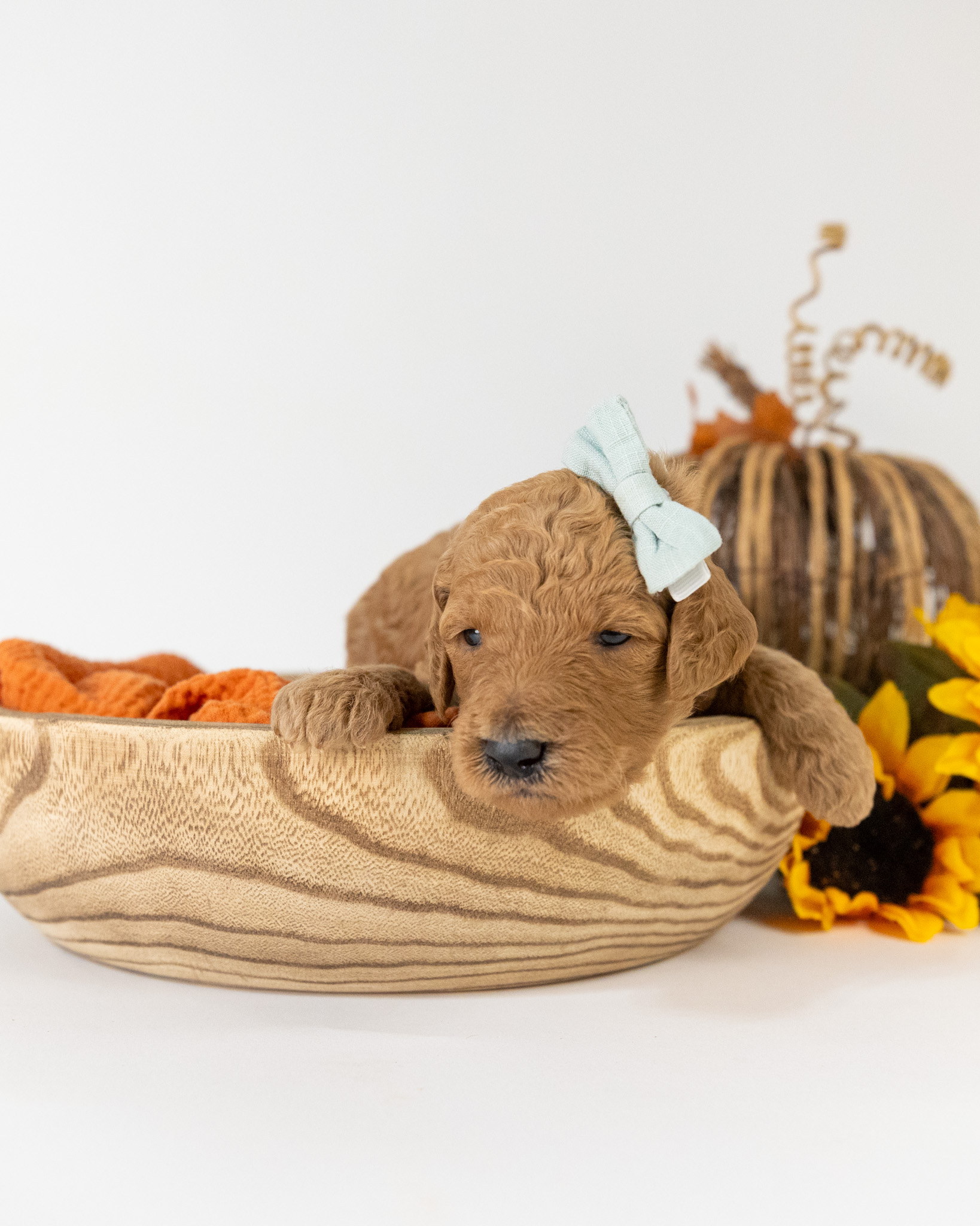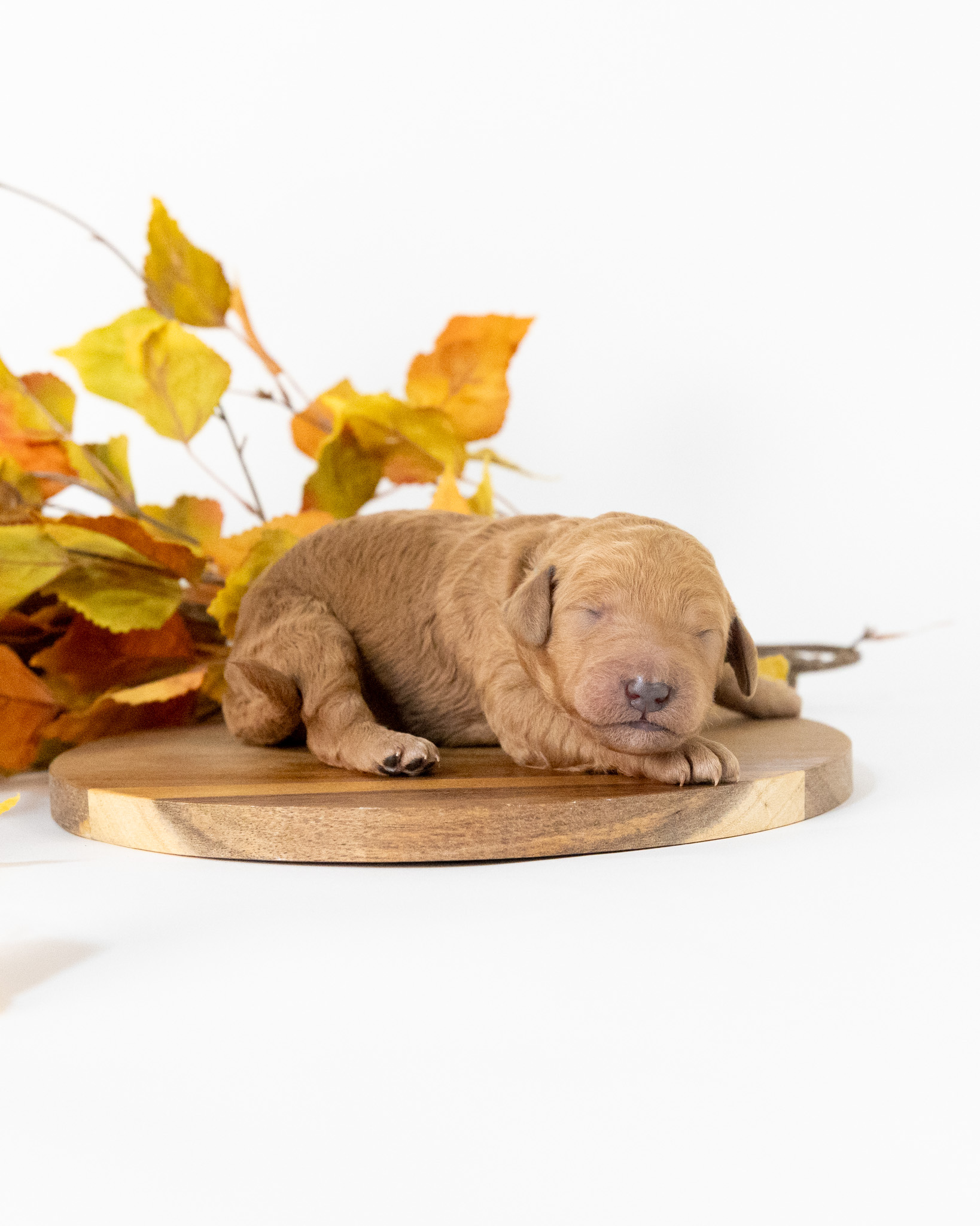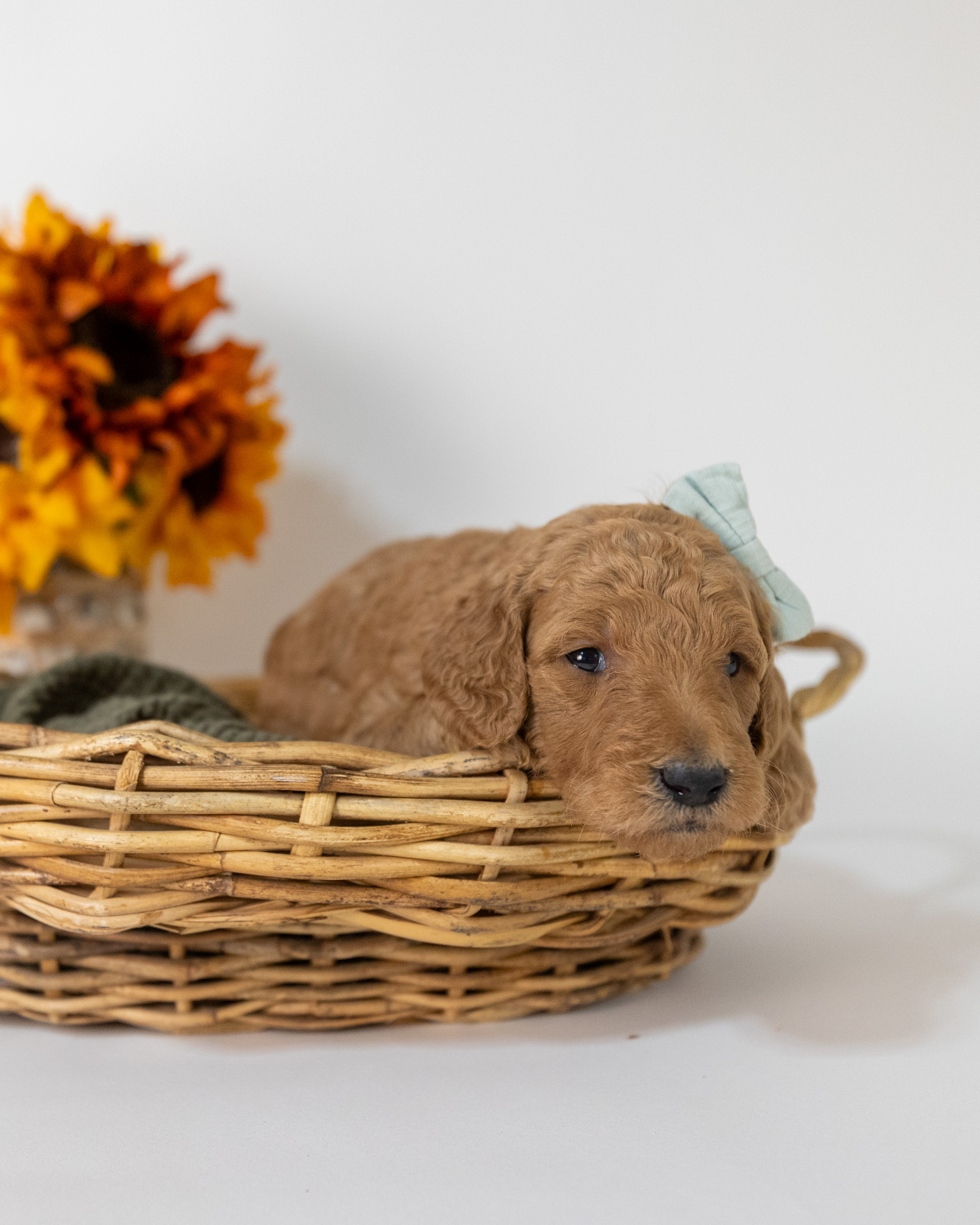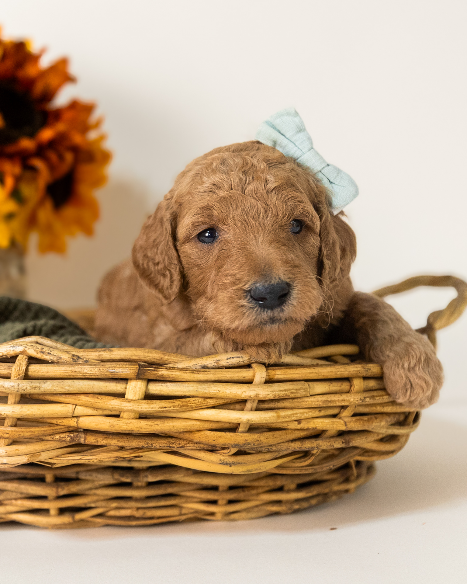 Aspen is a red multigen Goldendoodle puppy who will be ready for her fur-ever home around December 16th! Her soft, fluffy coat is hypoallergenic and non-shedding, ensuring endless snuggles without fear of allergic reactions. With a loyal and affectionate temperament, she is the perfect forever friend!