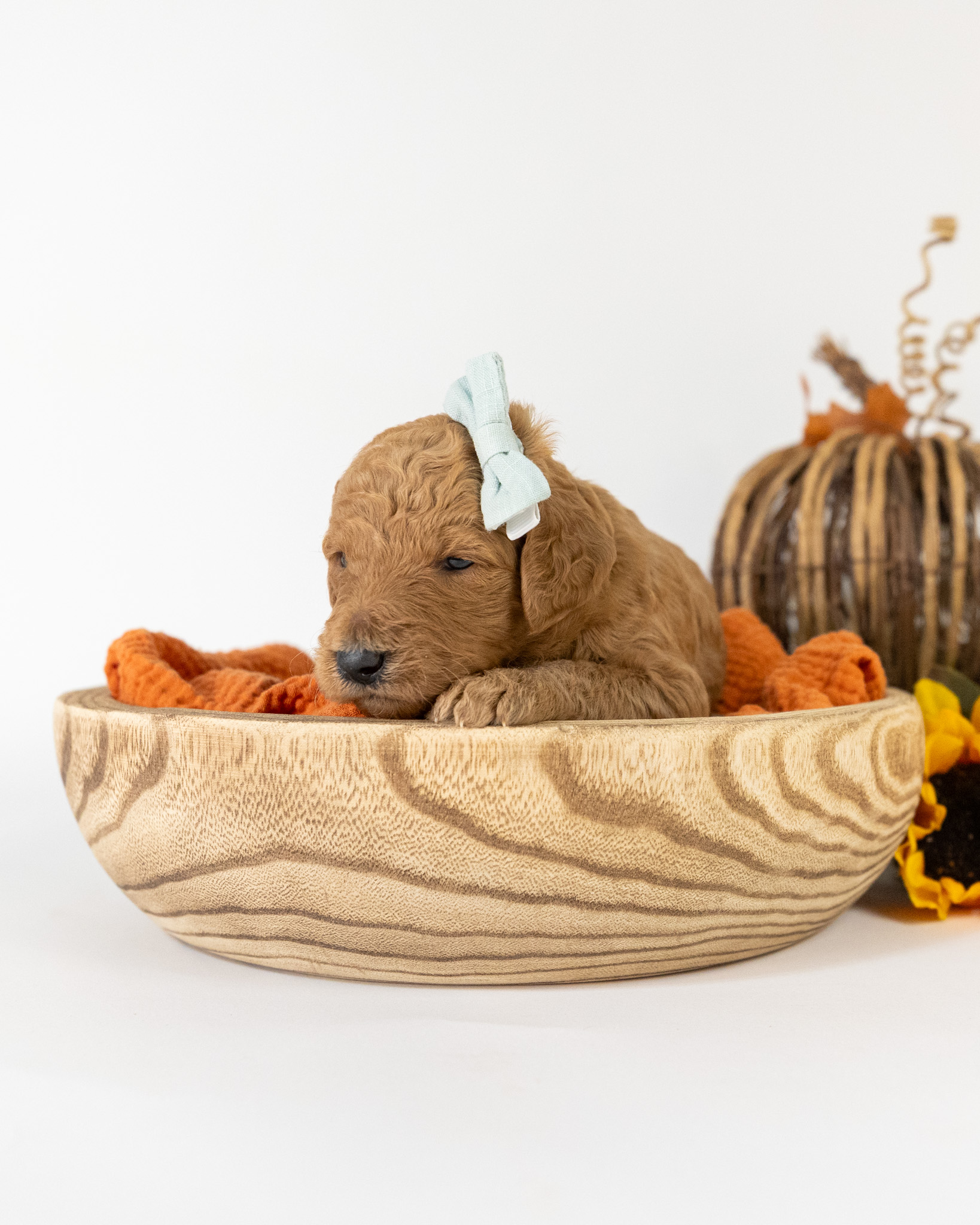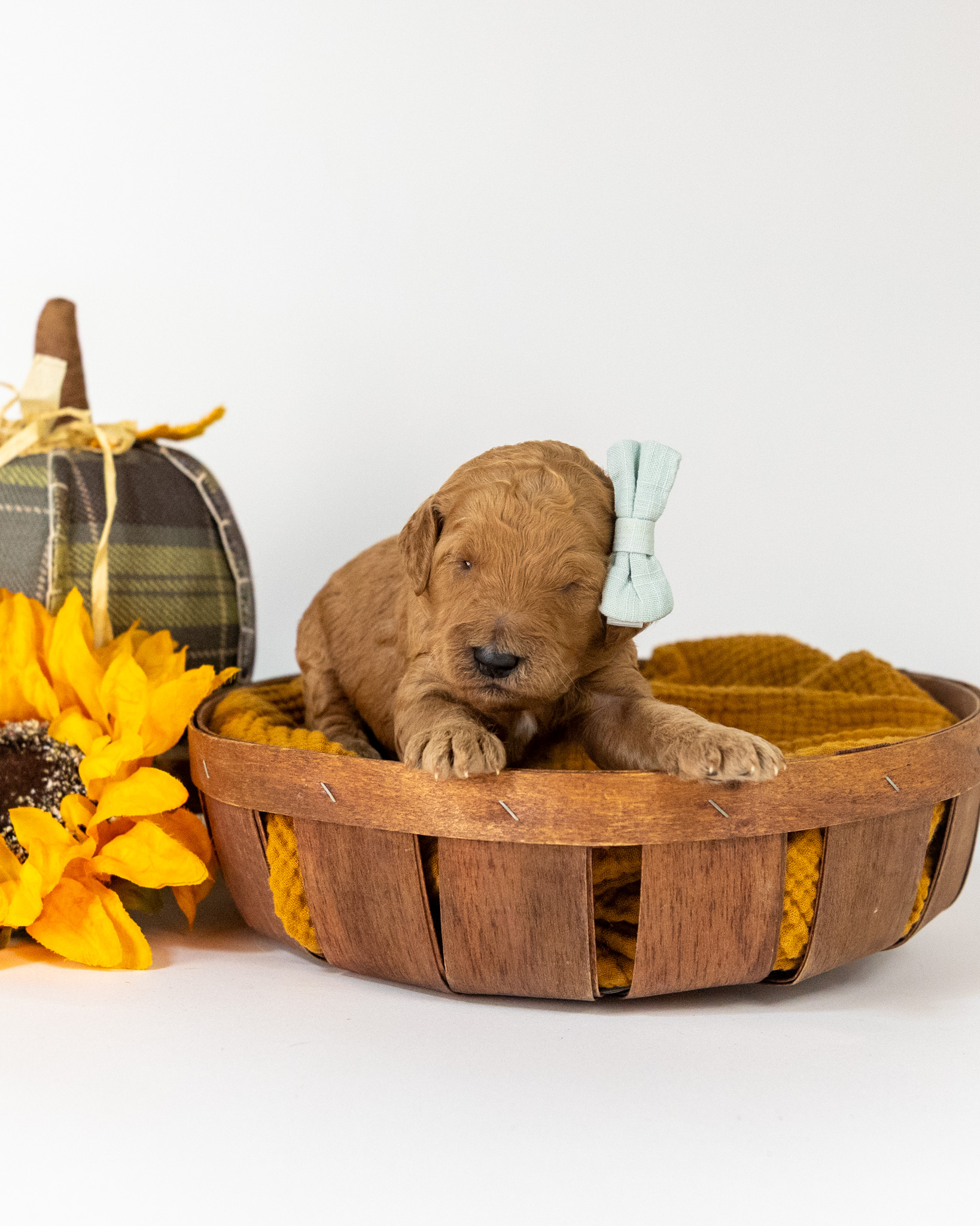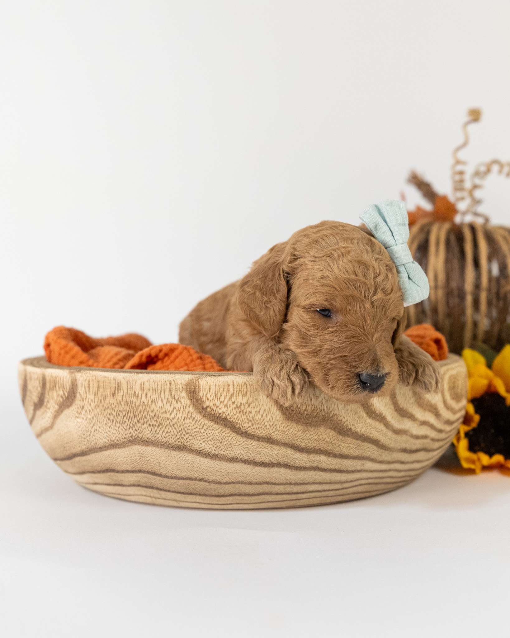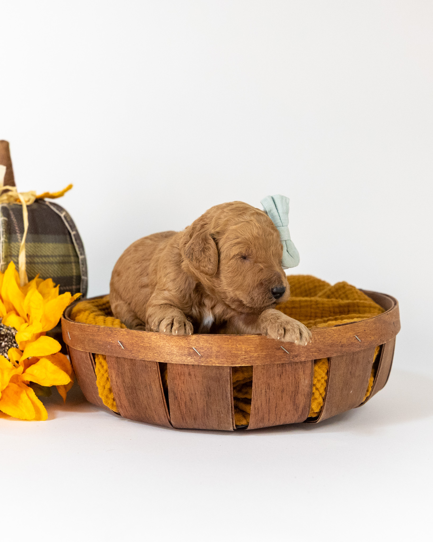 Aspen is a red multigen Goldendoodle puppy who will be ready for her fur-ever home around December 16th! Her soft, fluffy coat is hypoallergenic and non-shedding, ensuring endless snuggles without fear of allergic reactions. With a loyal and affectionate temperament, she is the perfect forever friend!