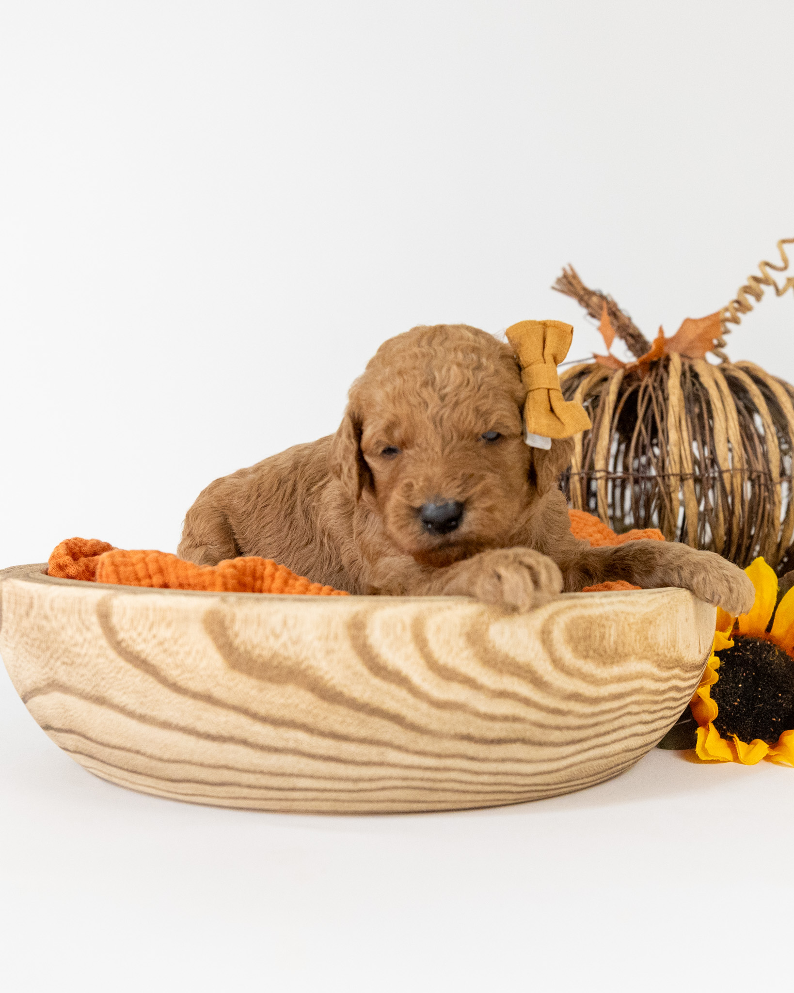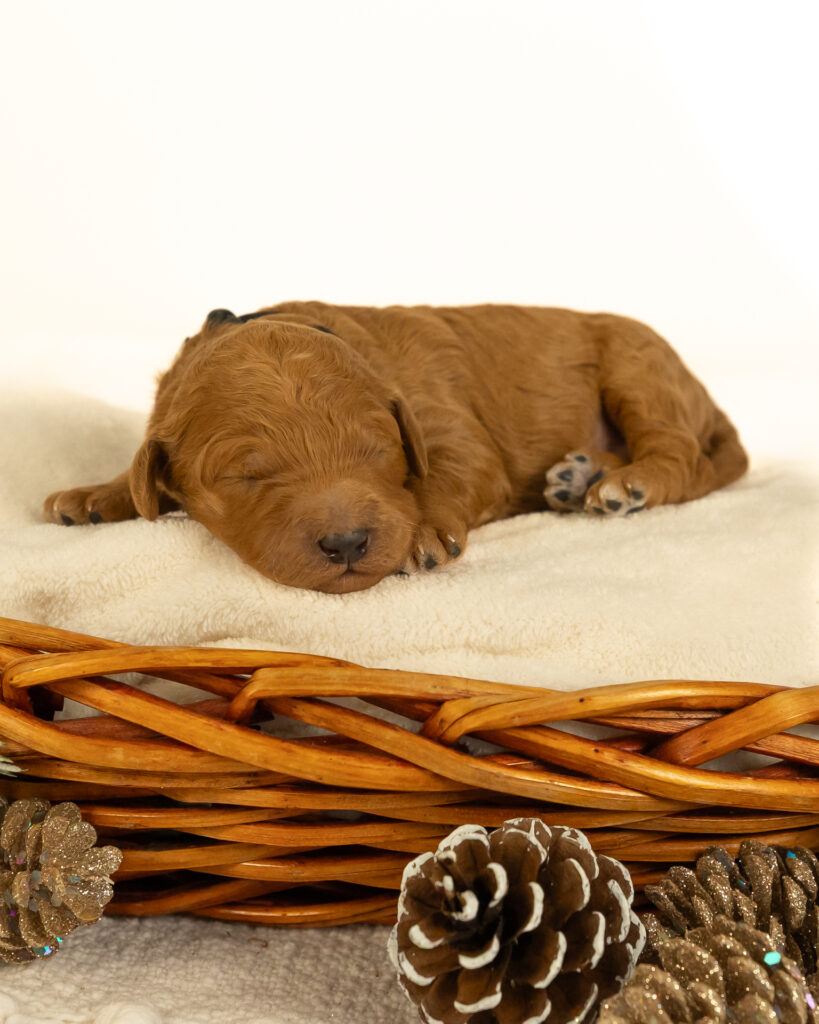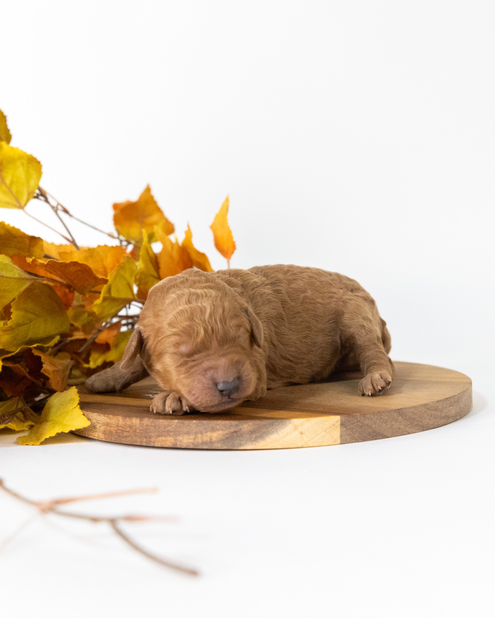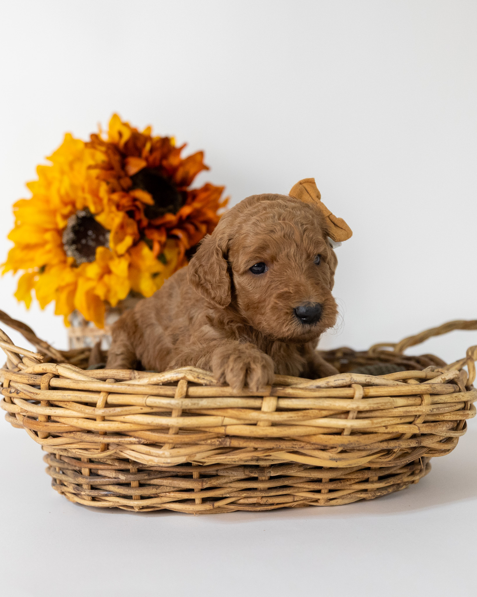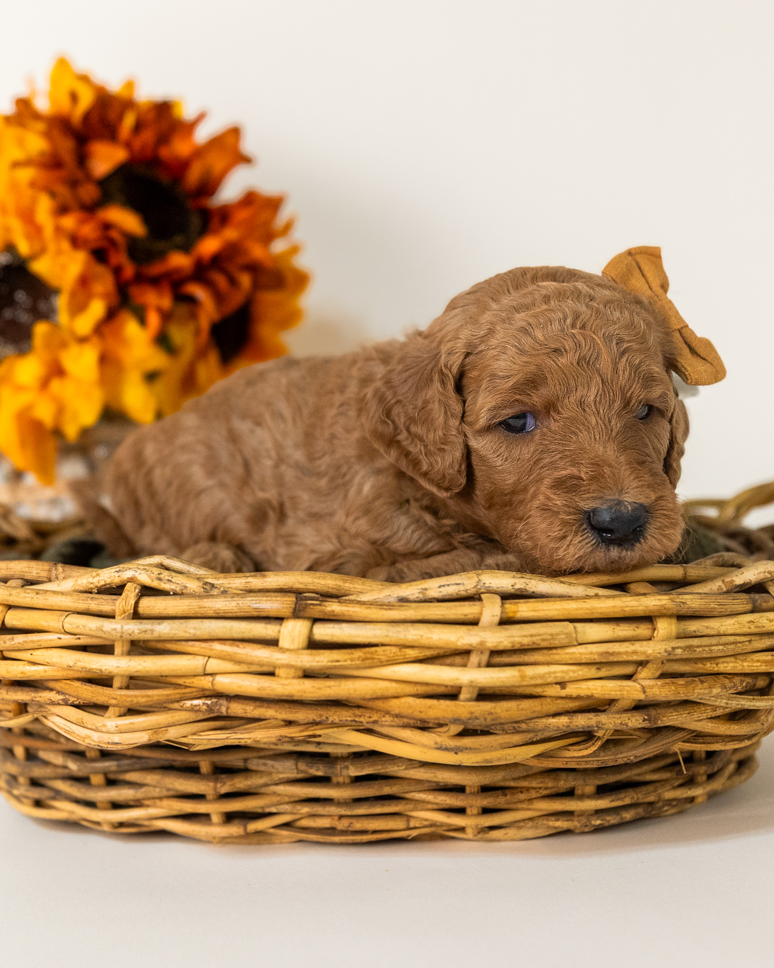 Cindy Lou is a red multigen Goldendoodle puppy who will be ready for her fur-ever home around December 16th! Her soft, fluffy coat is hypoallergenic and non-shedding, ensuring endless snuggles without fear of allergic reactions. With a loyal and affectionate temperament, she is the perfect forever friend!