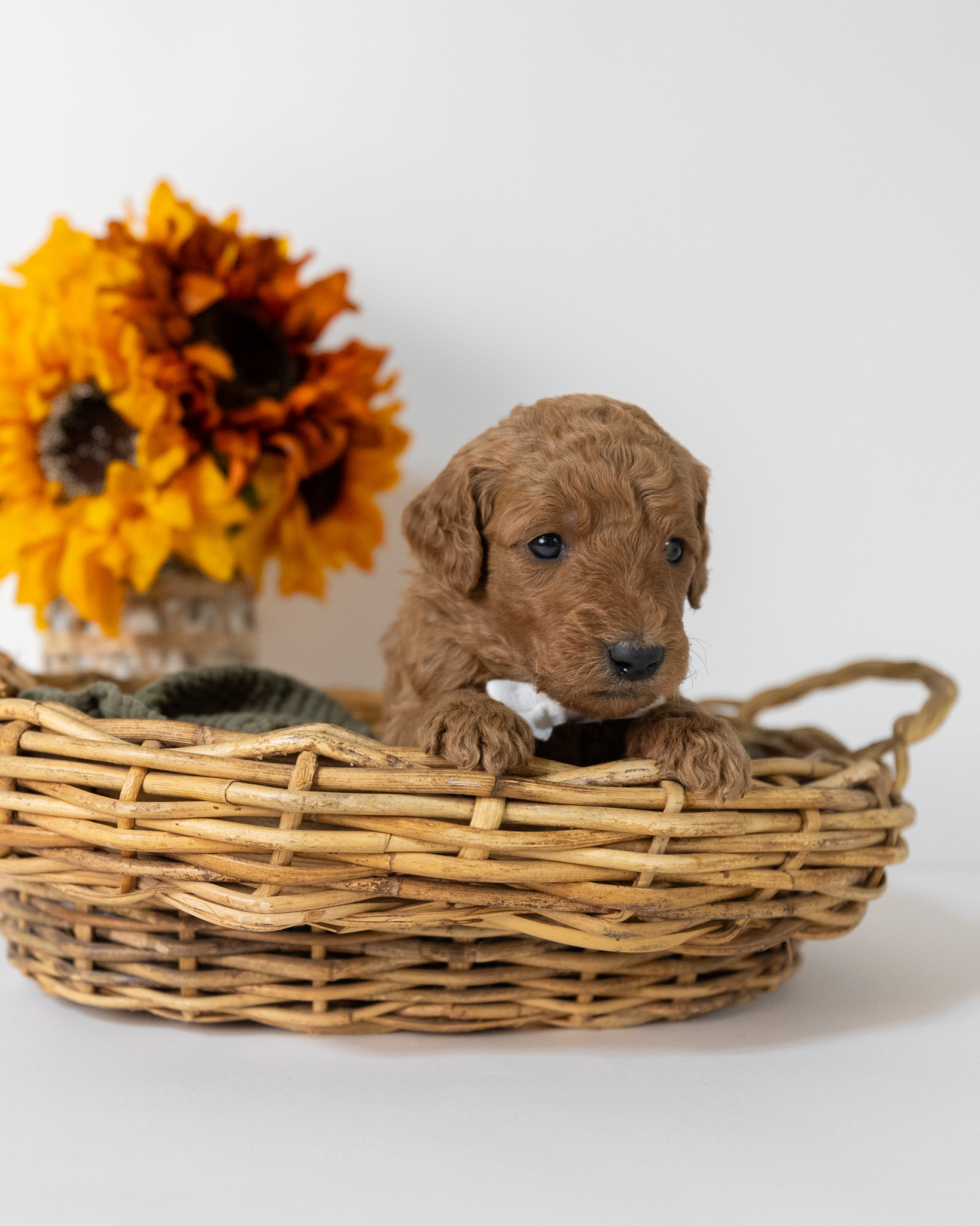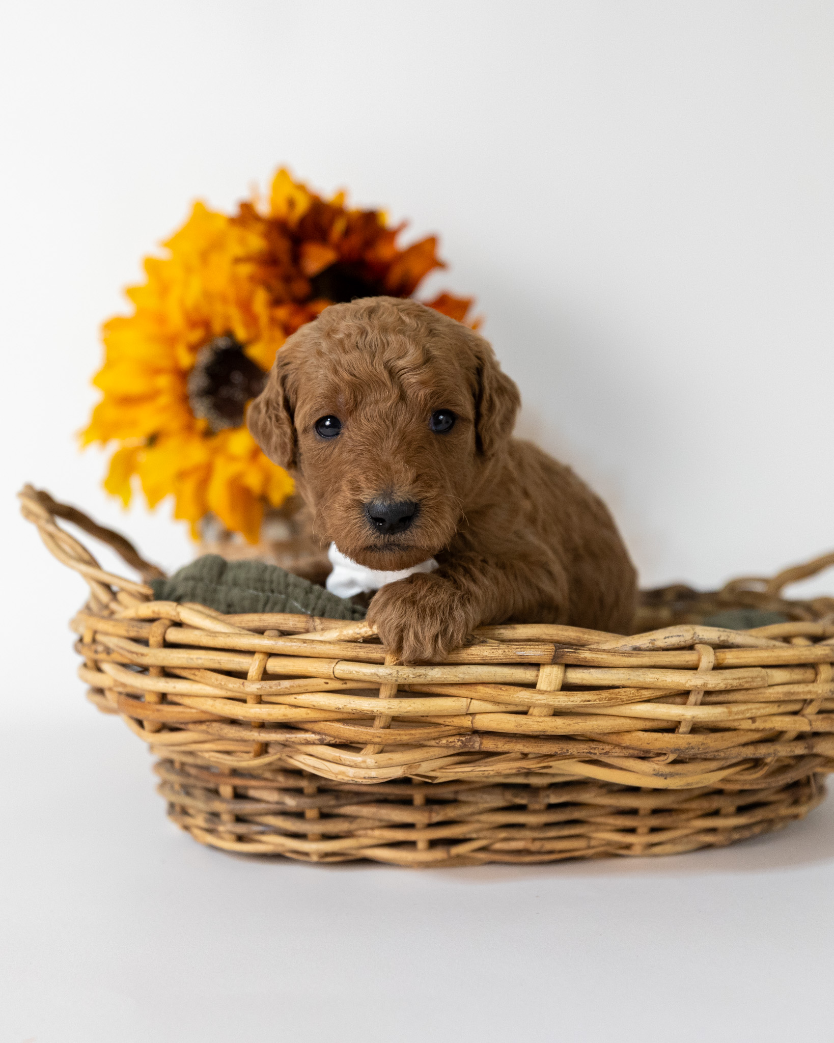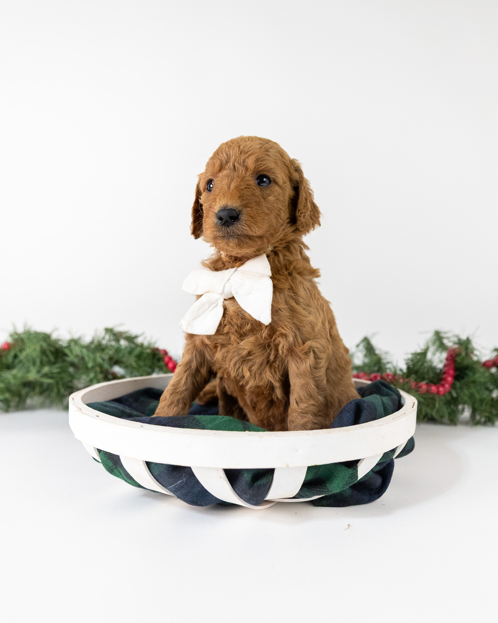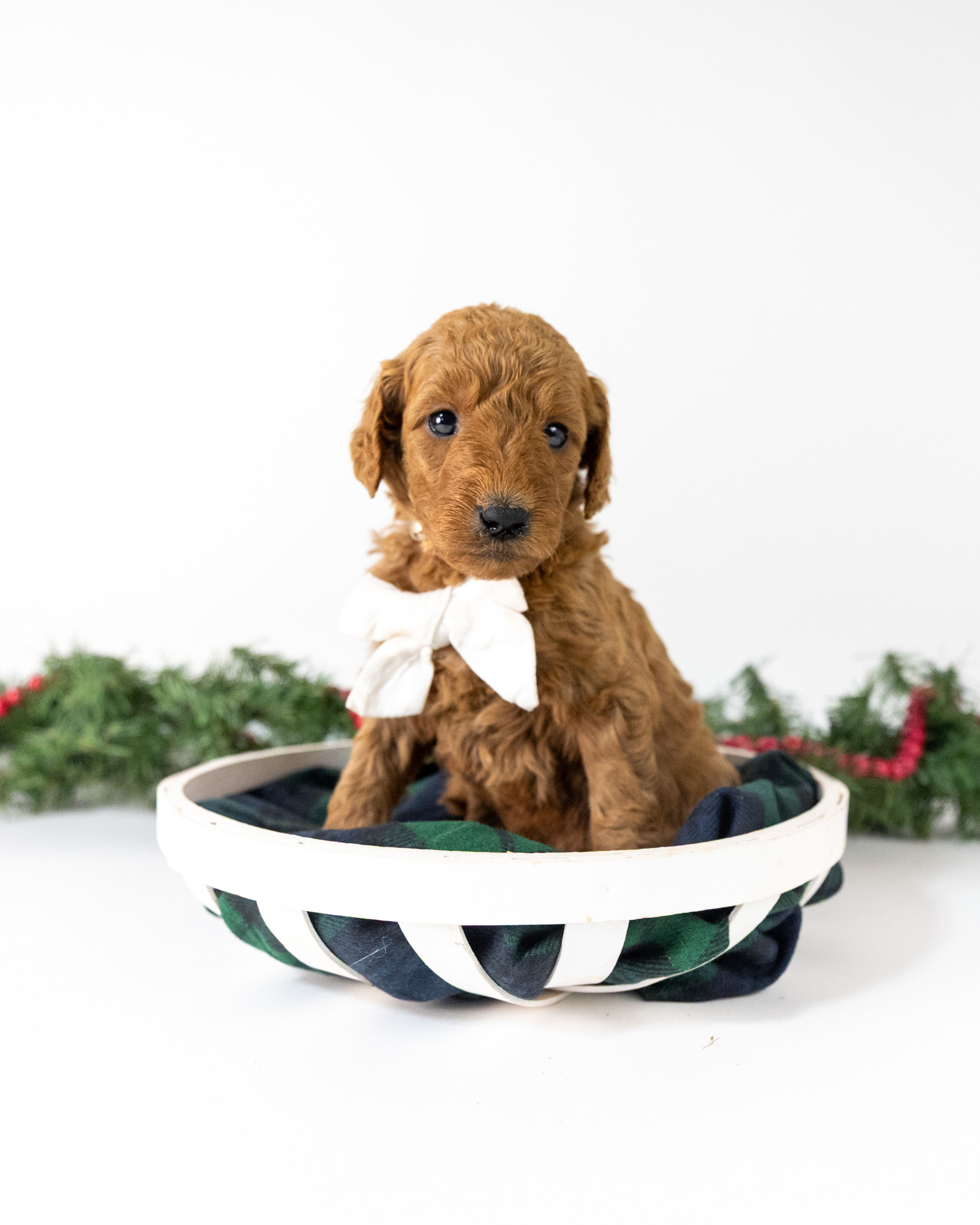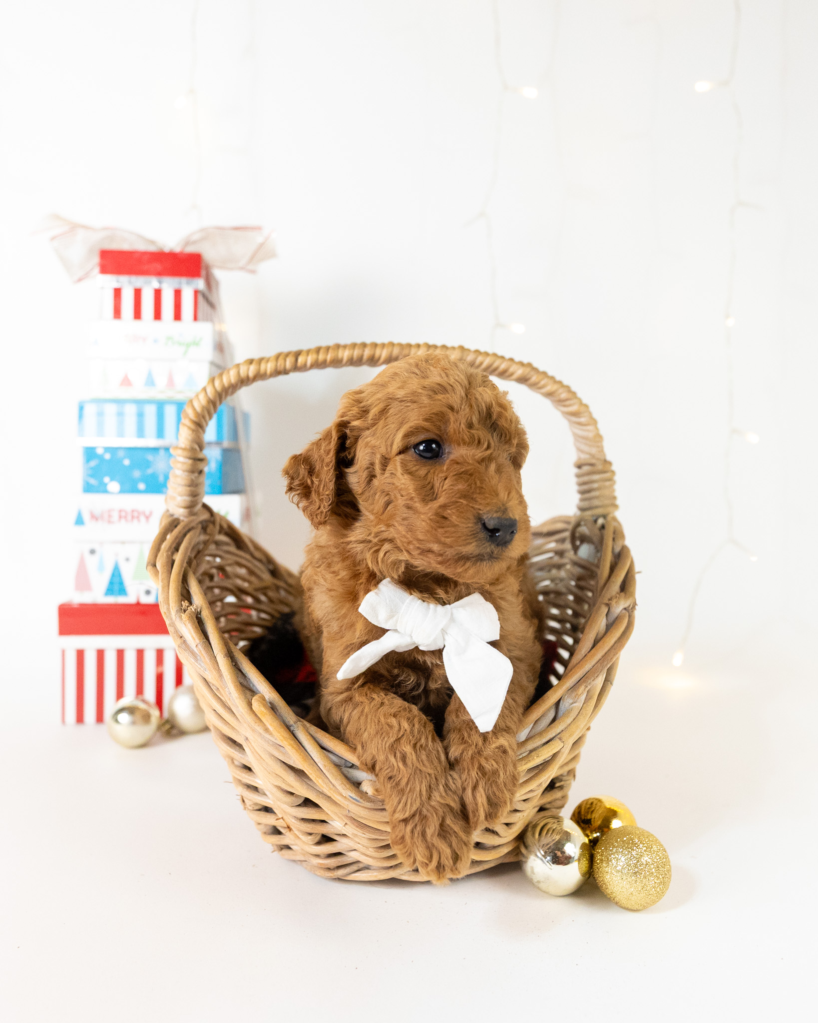 Icicle is a red multigen Goldendoodle puppy who will be ready for his fur-ever home around December 16th! His soft, fluffy coat is hypoallergenic and non-shedding, ensuring endless snuggles without fear of allergic reactions. With a loyal and affectionate temperament, he is the perfect forever friend!