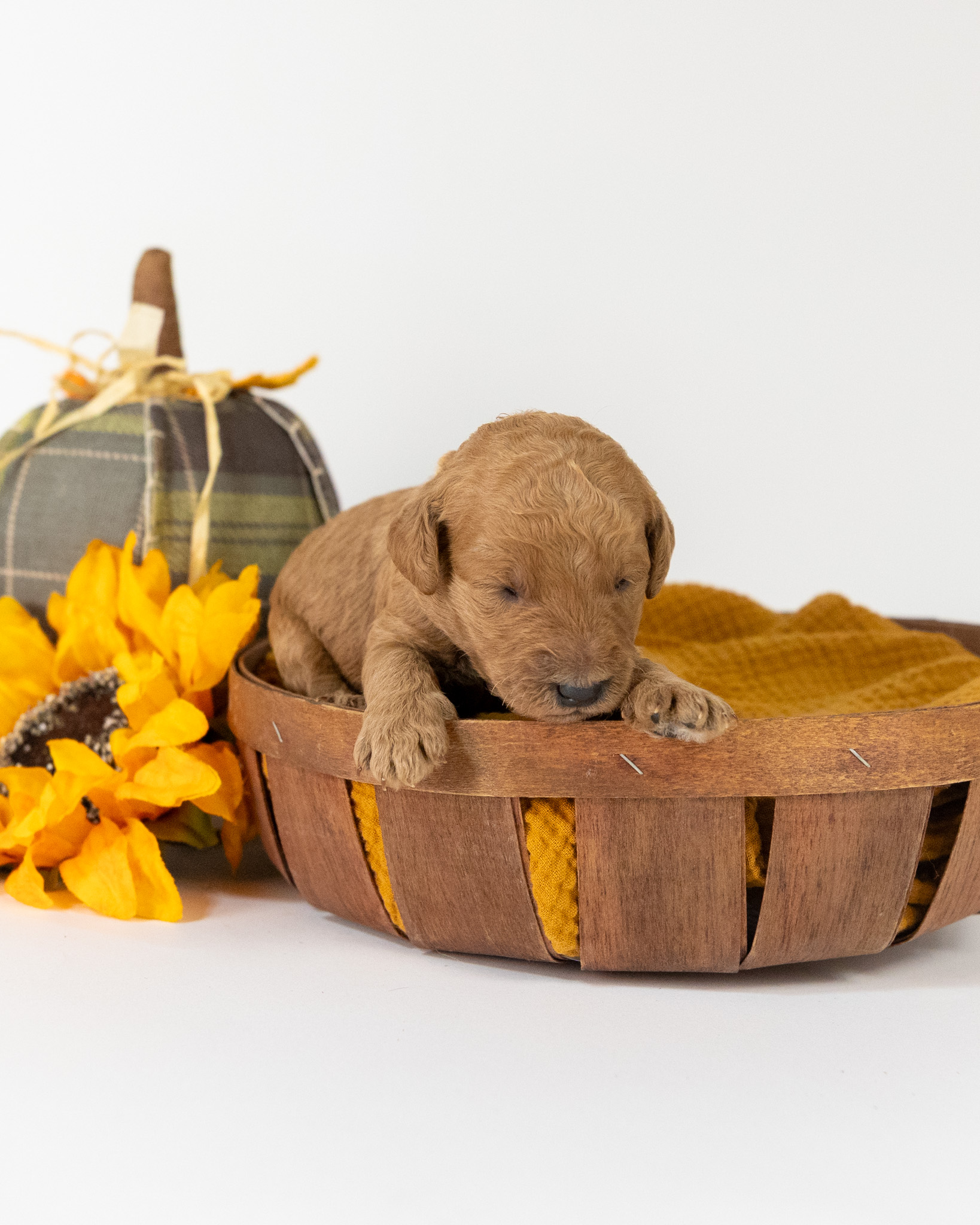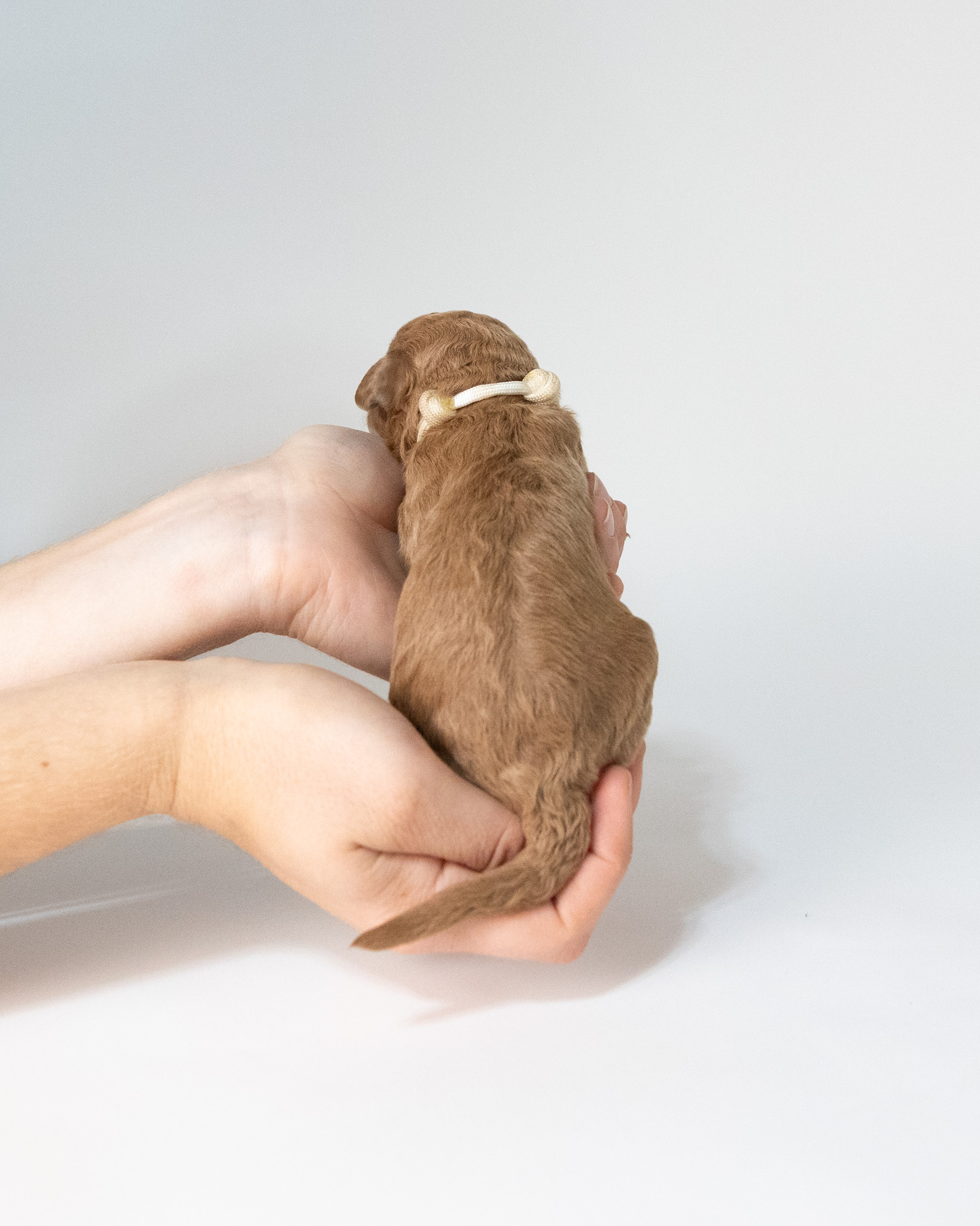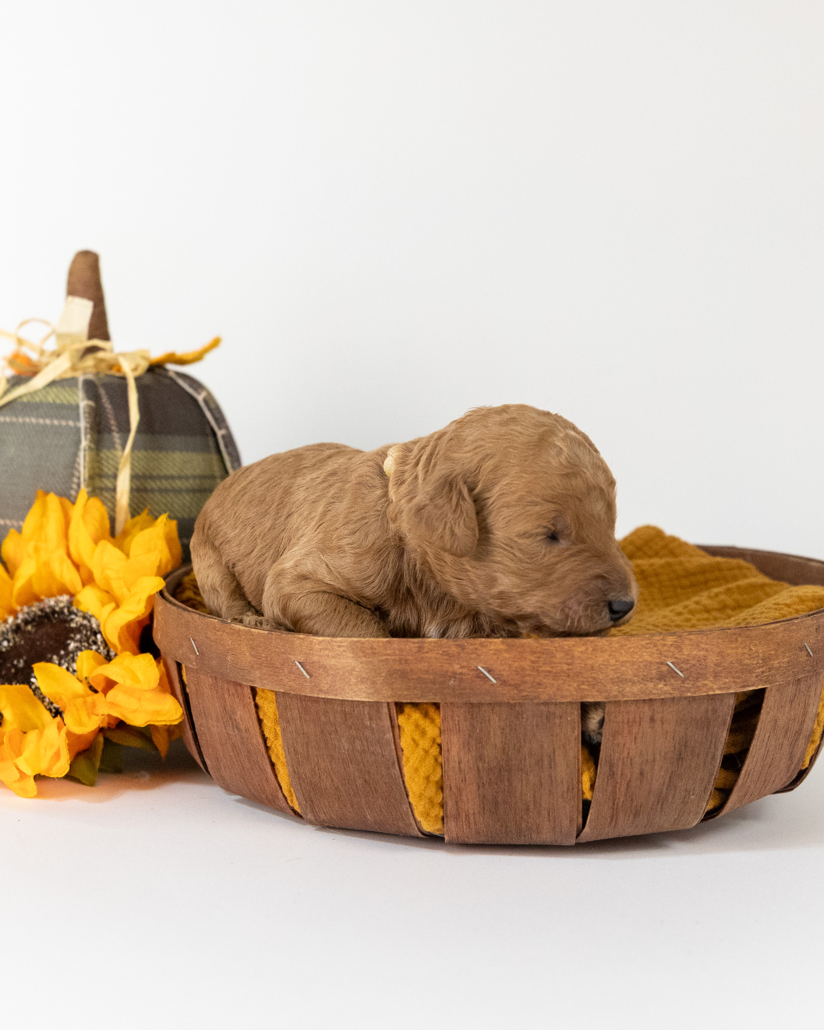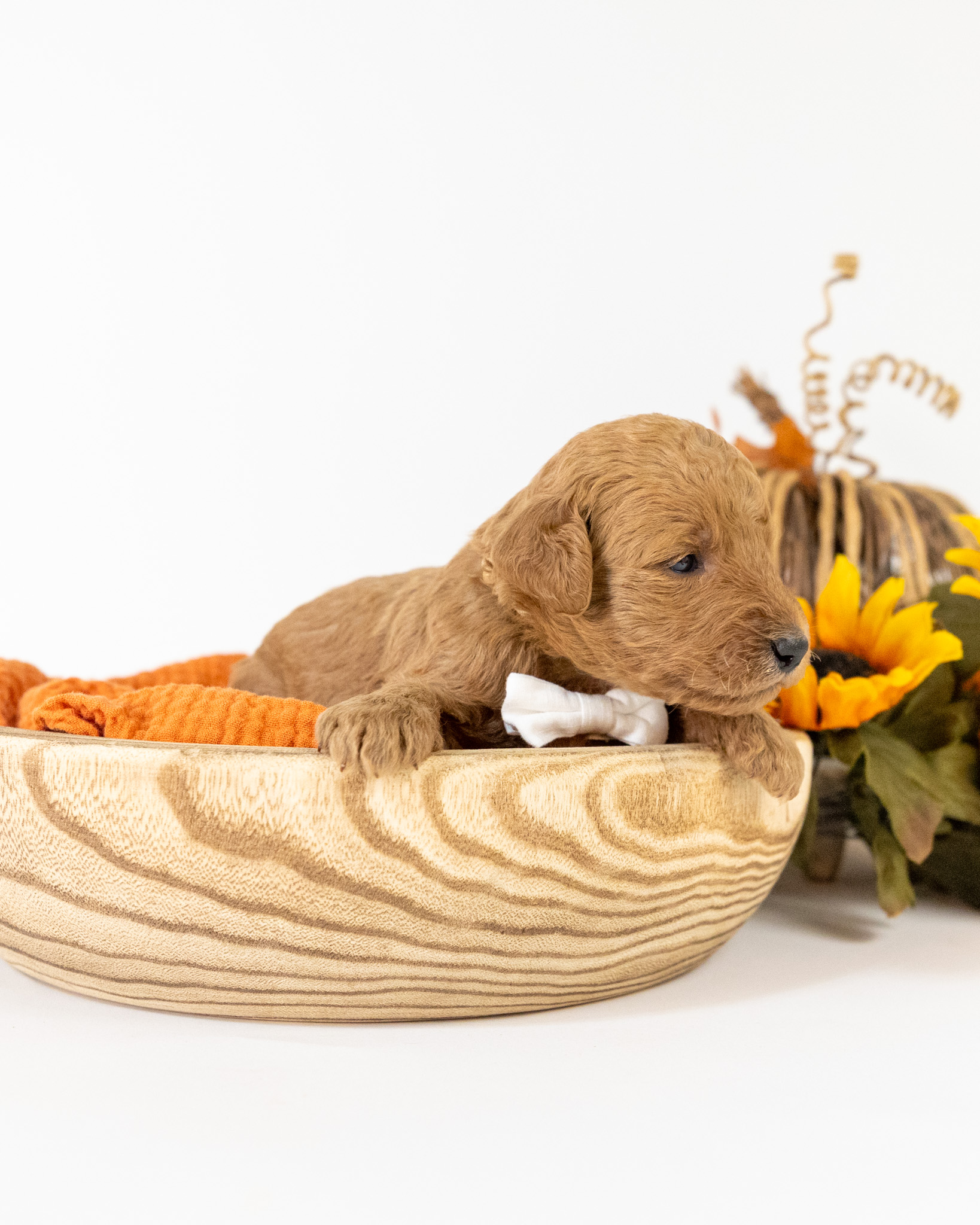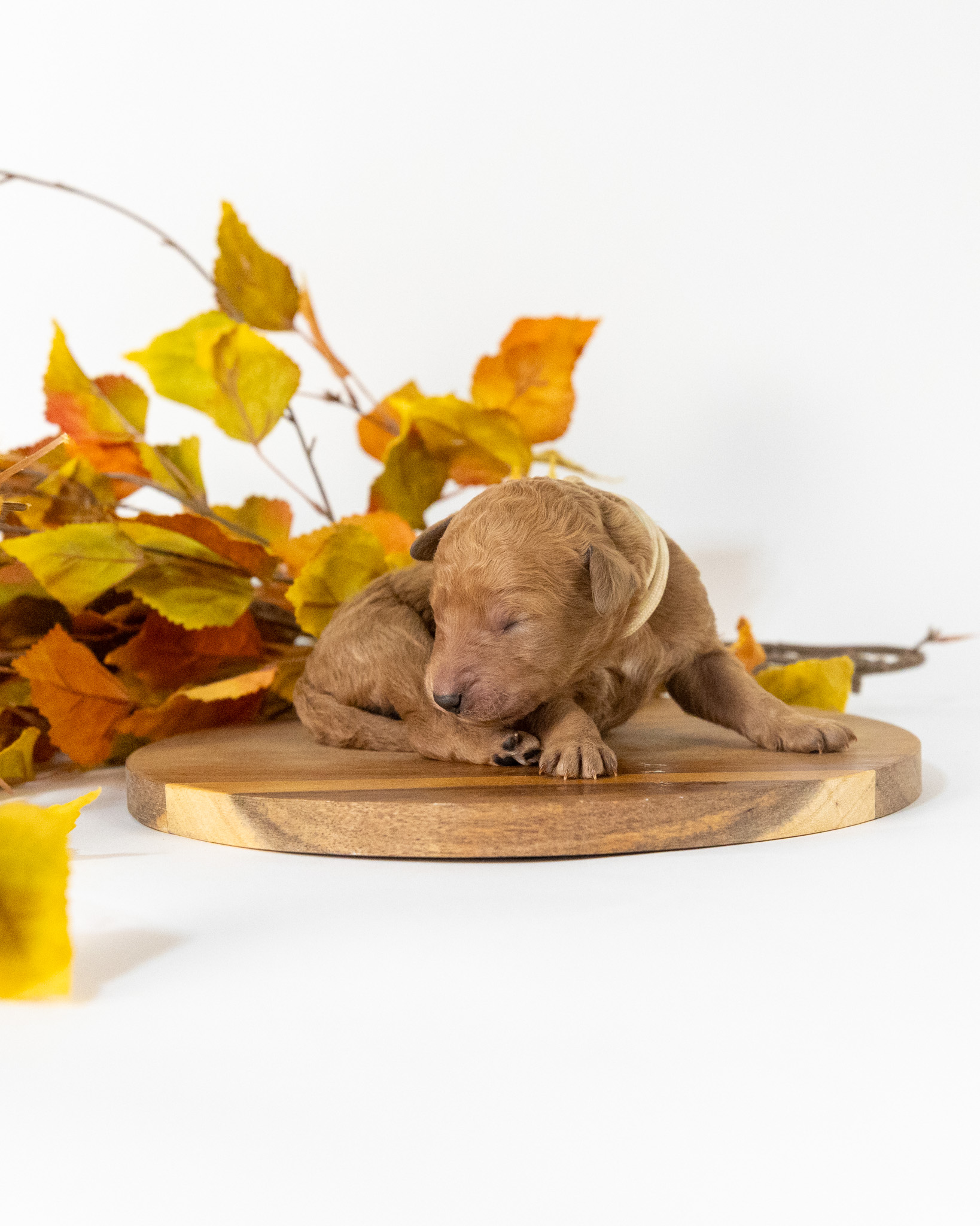Icicle is a red multigen Goldendoodle puppy who will be ready for his fur-ever home around December 16th! His soft, fluffy coat is hypoallergenic and non-shedding, ensuring endless snuggles without fear of allergic reactions. With a loyal and affectionate temperament, he is the perfect forever friend!