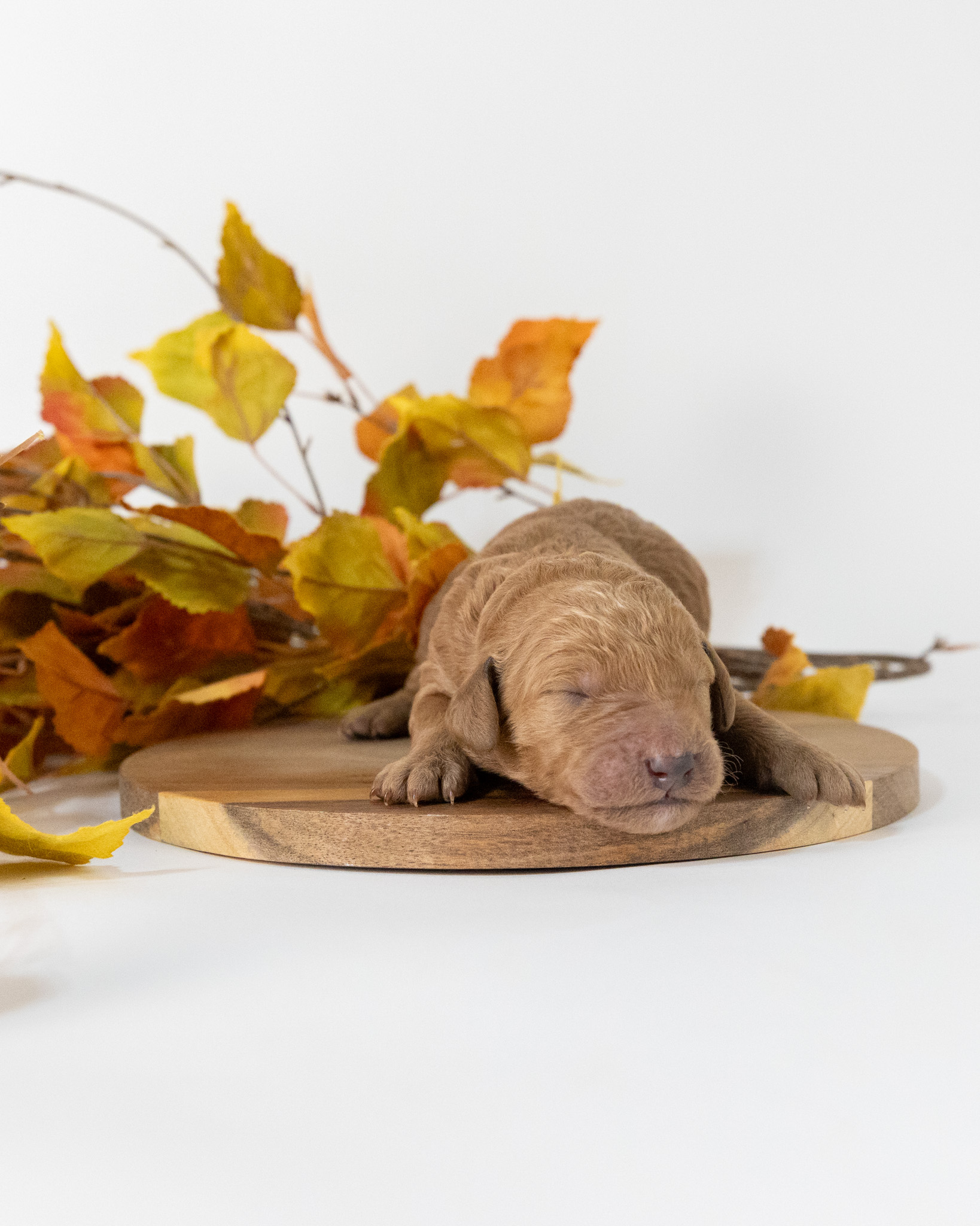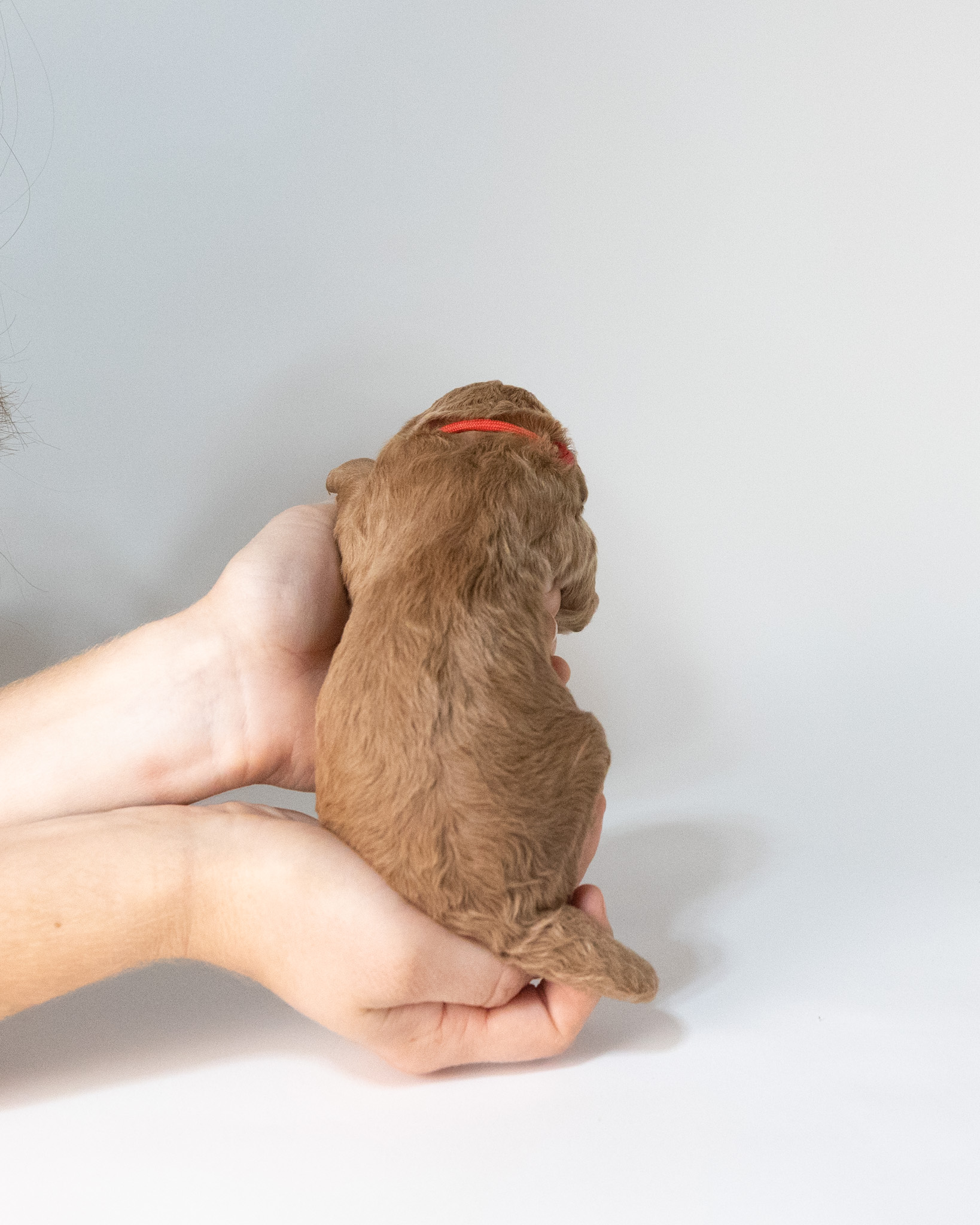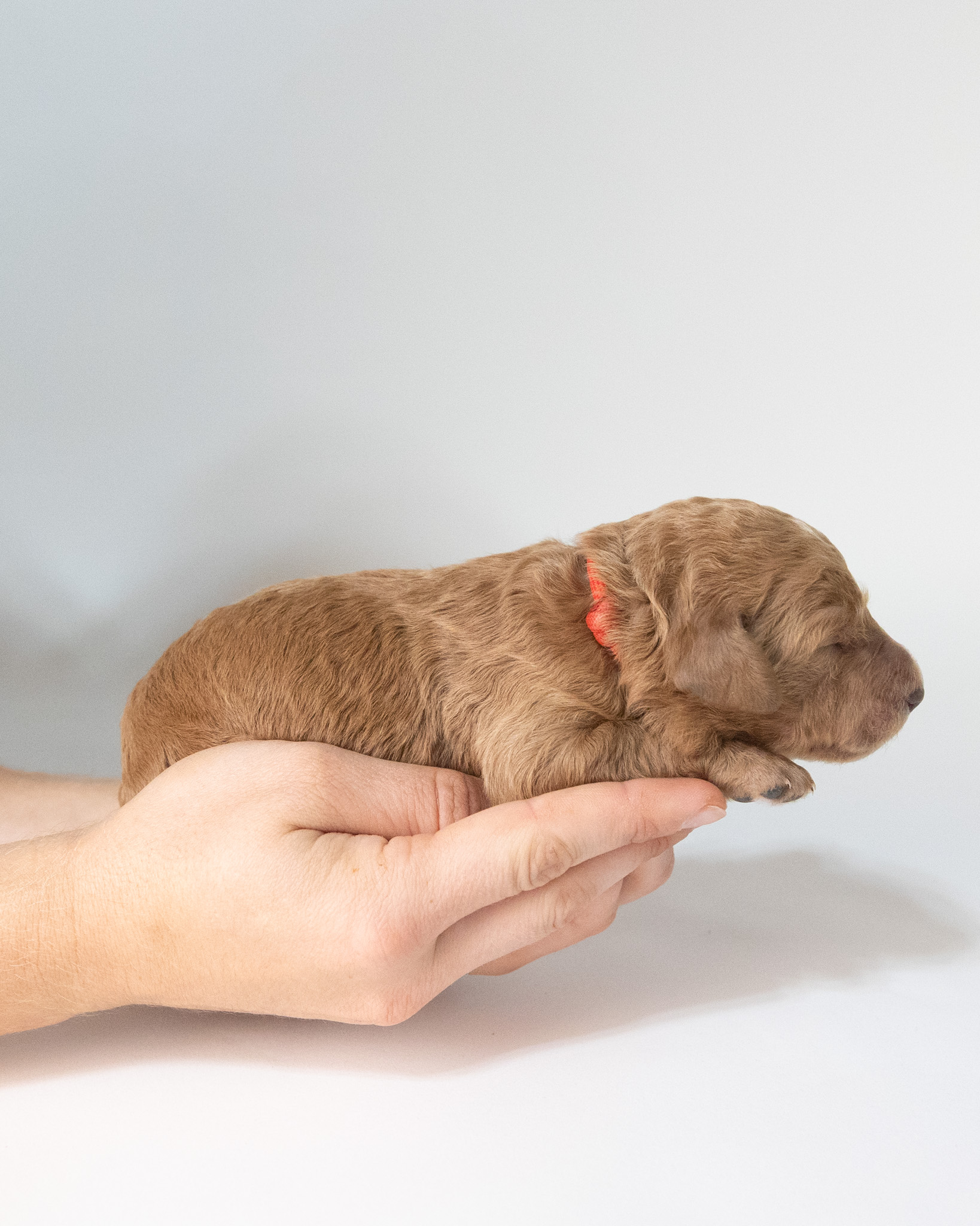 Rosy is a red multigen Goldendoodle puppy who will be ready for her fur-ever home around December 16th! Her soft, fluffy coat is hypoallergenic and non-shedding, ensuring endless snuggles without fear of allergic reactions. With a loyal and affectionate temperament, she is the perfect forever friend!