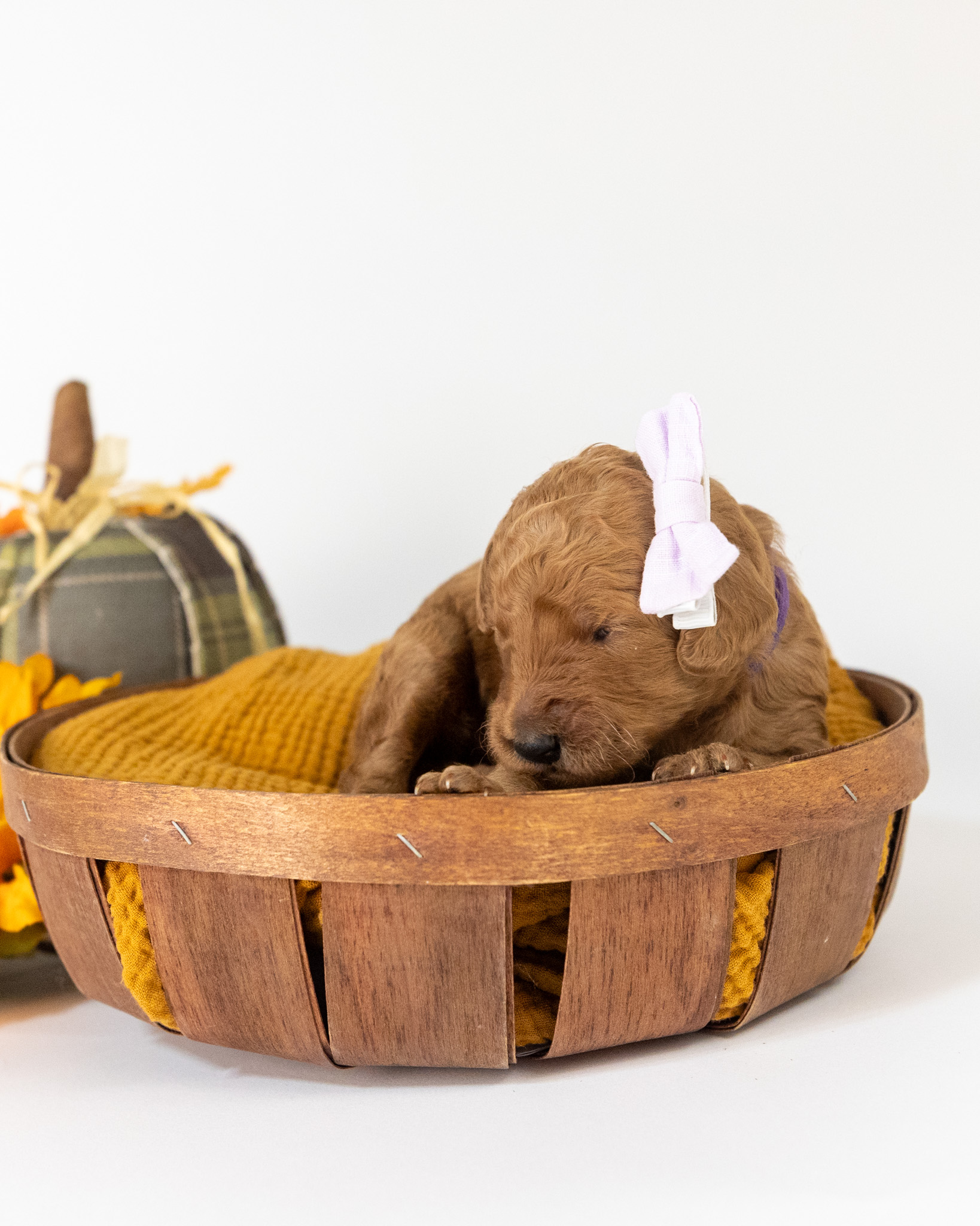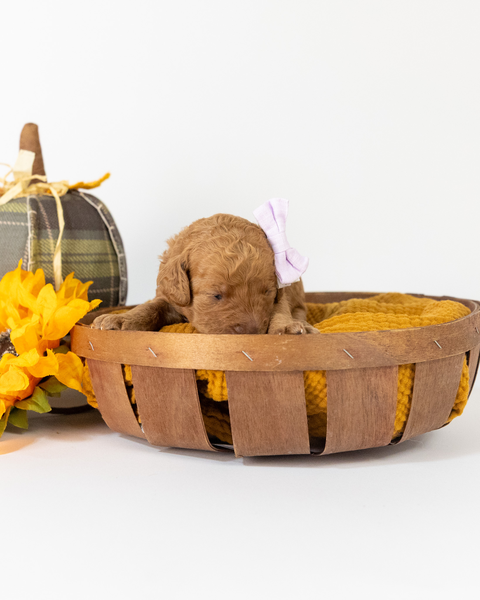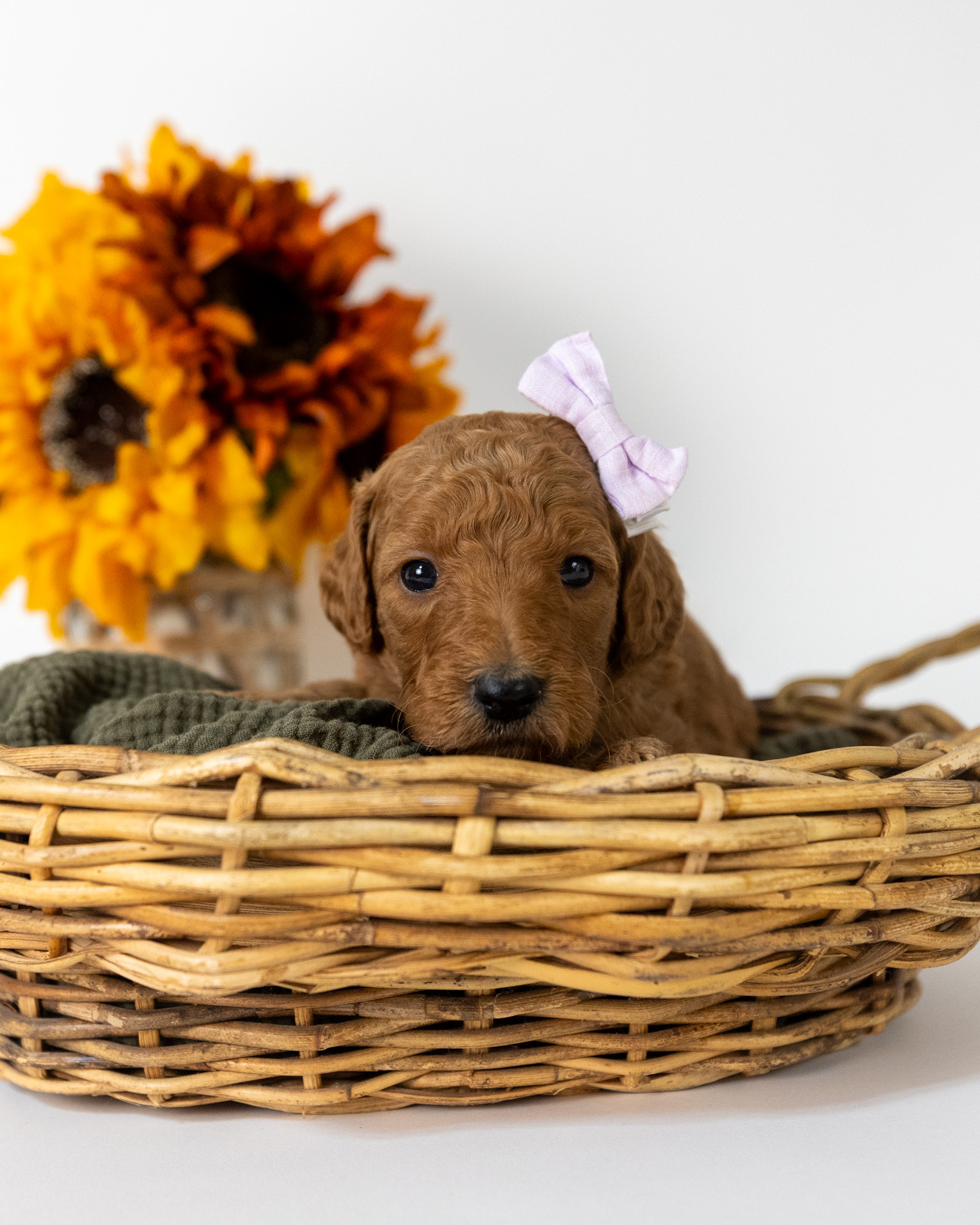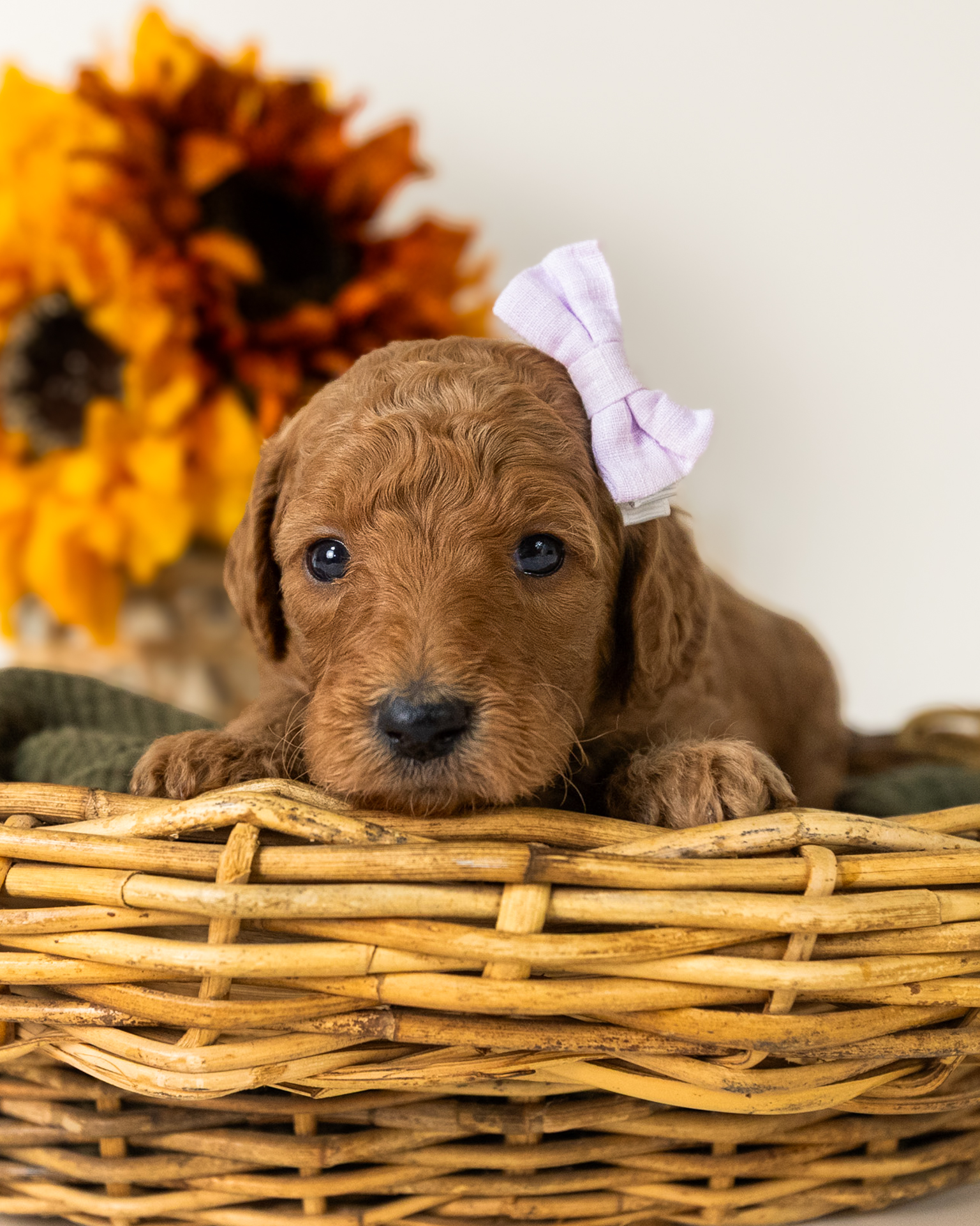 Peppermint is a red standard Goldendoodle puppy who will be ready for her forever home around December 19th.