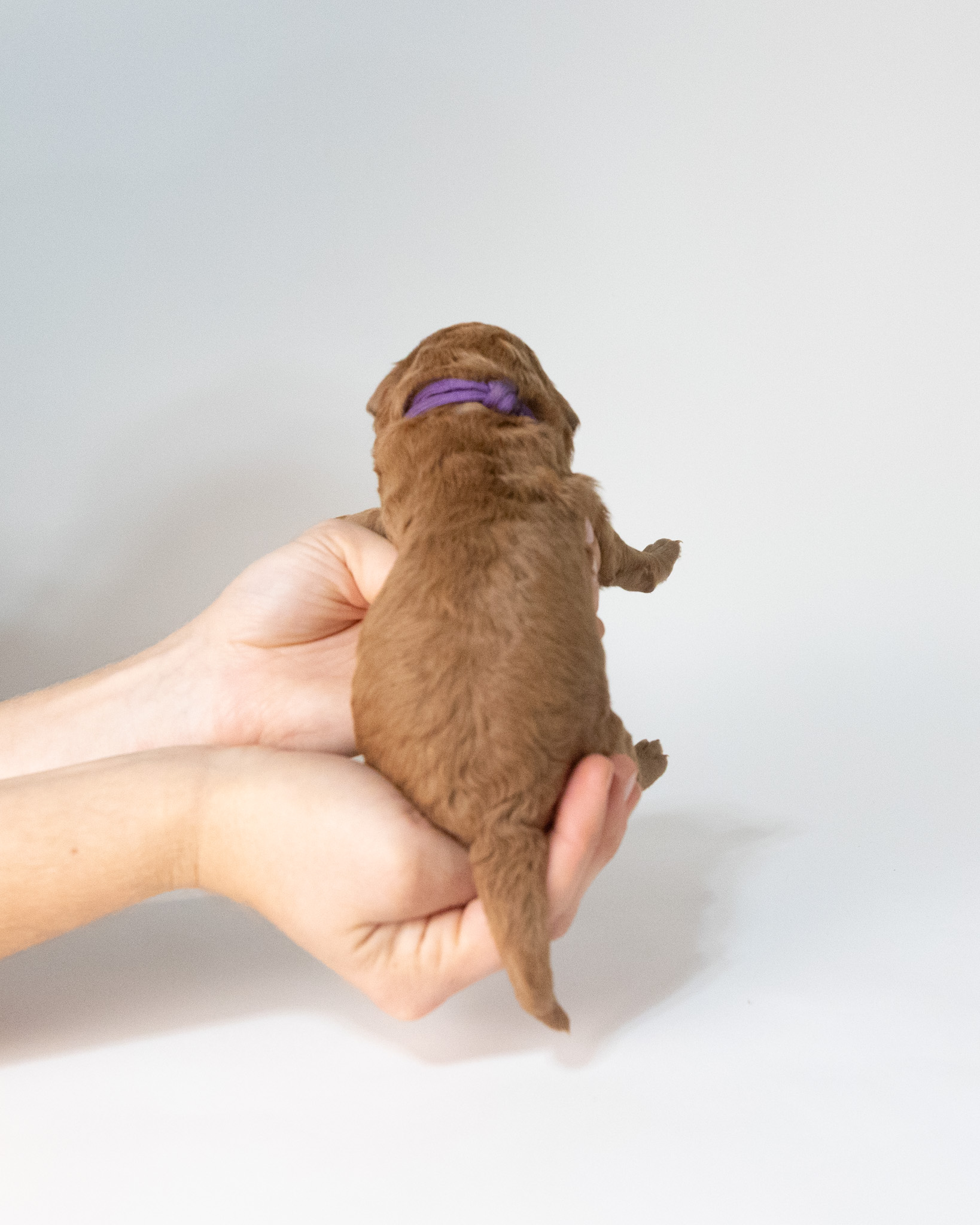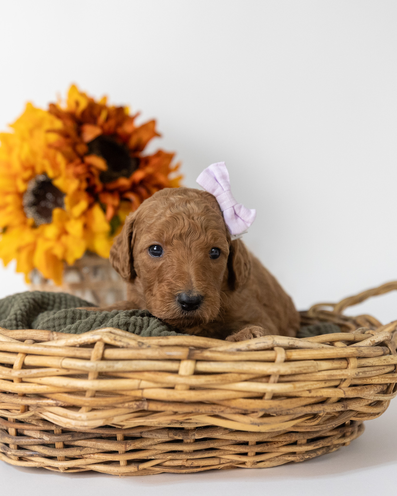 Winter is a red  multigen Goldendoodle puppy who will be ready for her fur-ever home around December 16th! Her soft, fluffy coat is hypoallergenic and non-shedding, ensuring endless snuggles without fear of allergic reactions. With a loyal and affectionate temperament, she is the perfect forever friend!