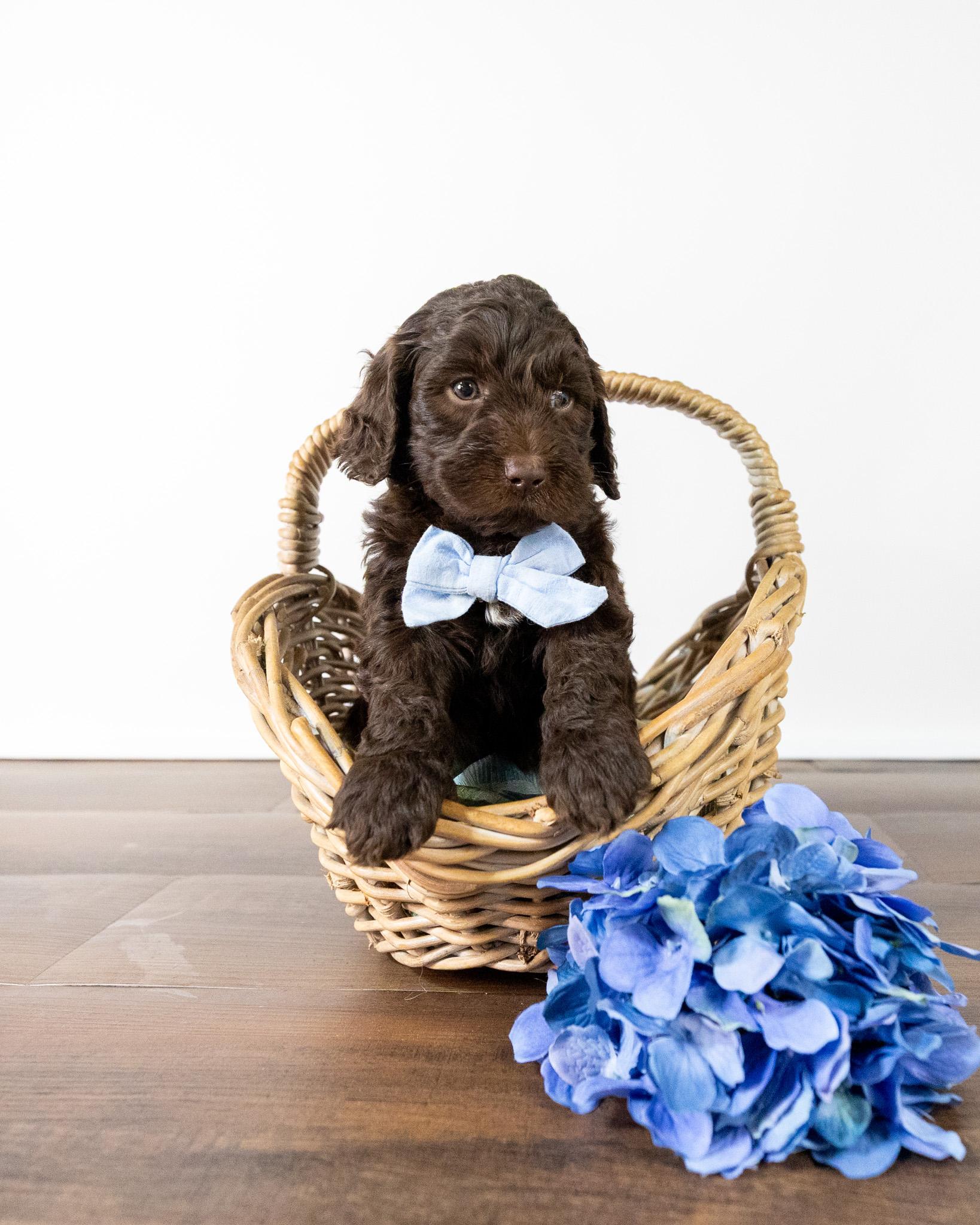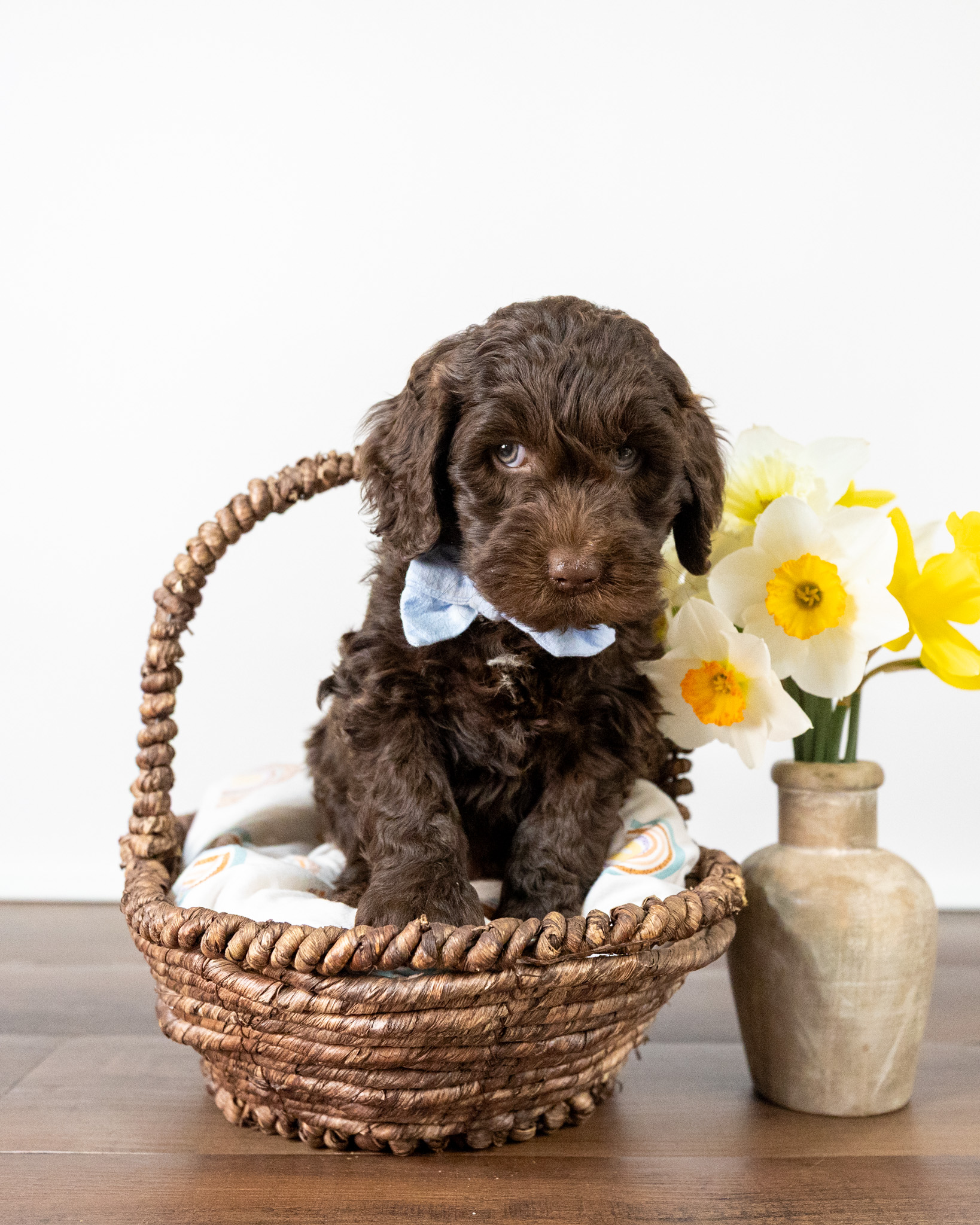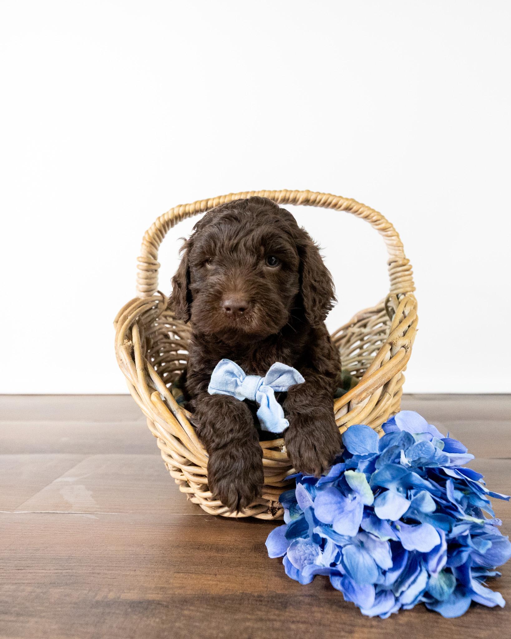 Aragorn is a chocolate colored medium multigen Labradoodle puppy who will be ready for his forever home March 25th! His soft, fluffy coat is hypoallergenic and non-shedding, ensuring endless snuggles without fear of allergic reactions.