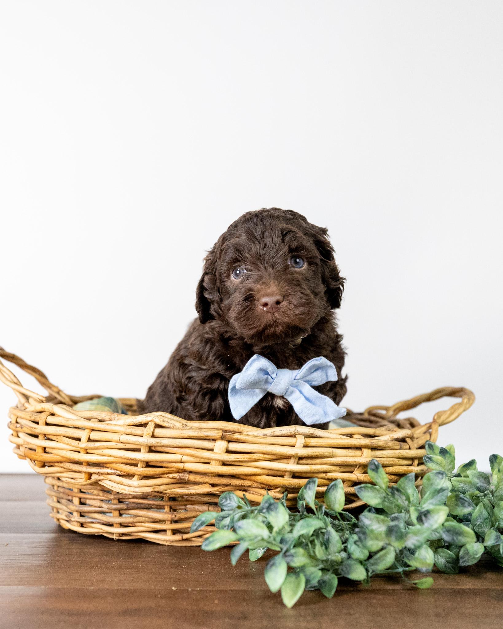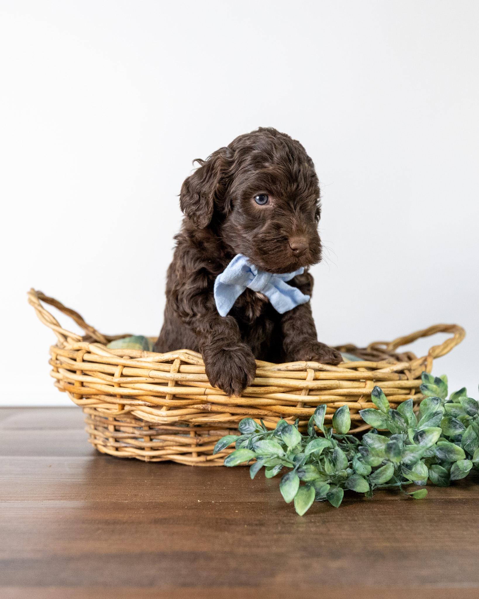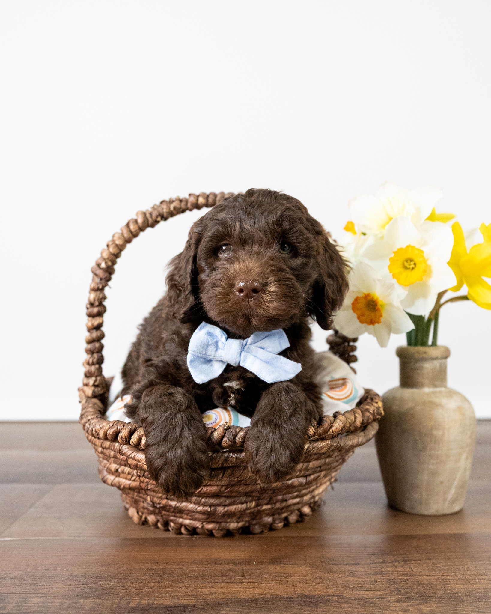 Aragorn is a chocolate colored medium multigen Labradoodle puppy who will be ready for his forever home March 25th! His soft, fluffy coat is hypoallergenic and non-shedding, ensuring endless snuggles without fear of allergic reactions.