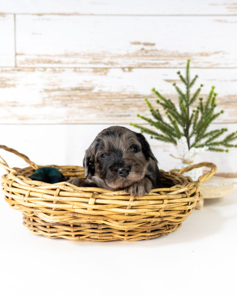Rumcake is a blue merle female standard Goldendoodle puppy who will be ready for her forever home around January 7th.