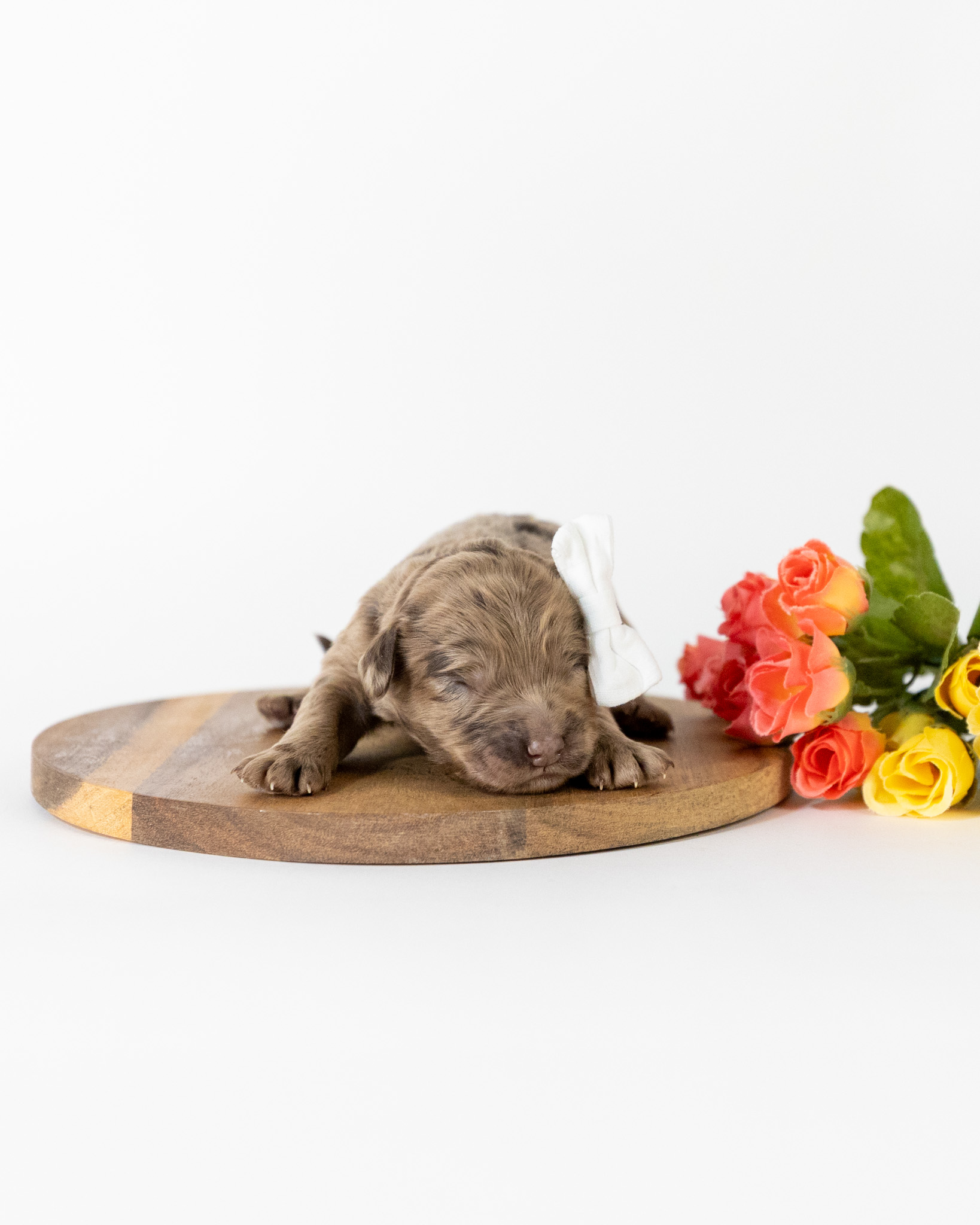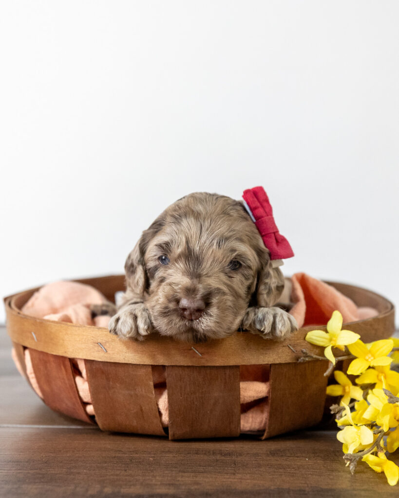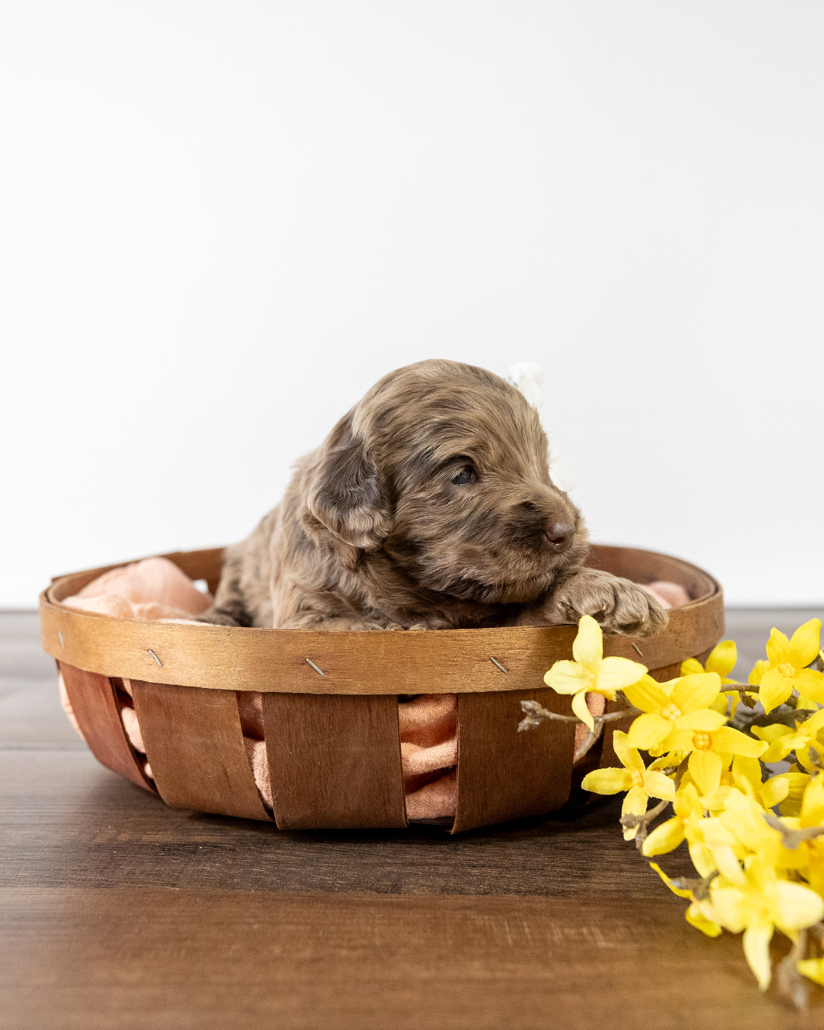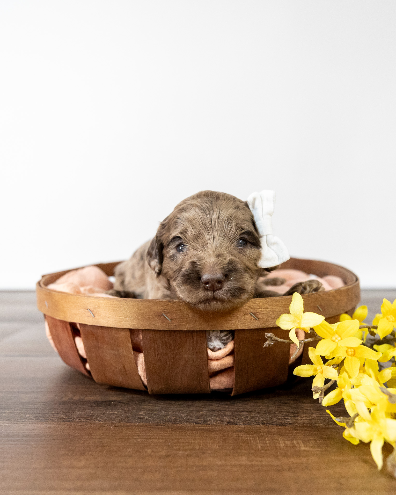 Izzy is a medium multigen Labradoodle puppy who will be ready for her forever home March 17th! Her soft, fluffy coat is hypoallergenic and non-shedding, ensuring endless snuggles without fear of allergic reactions.