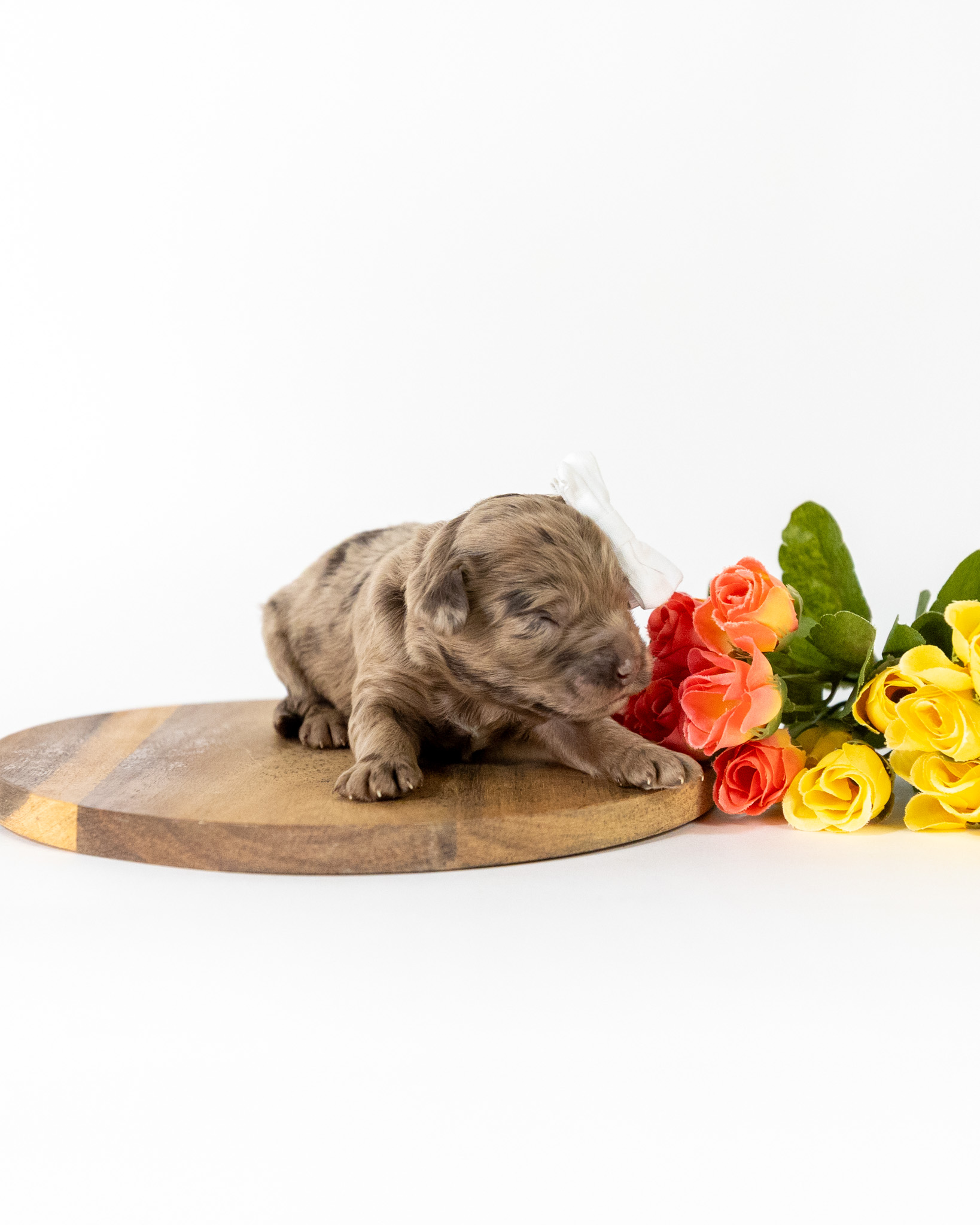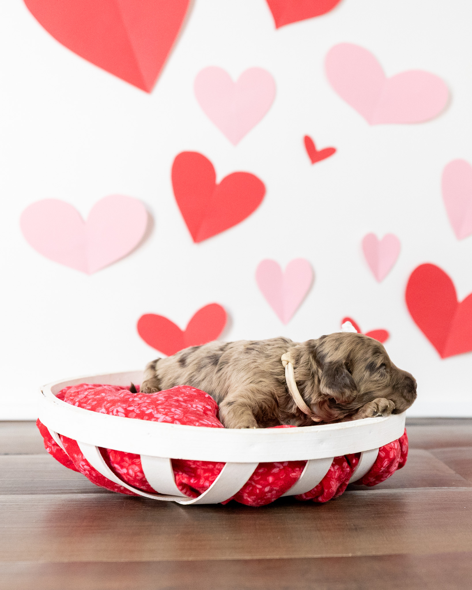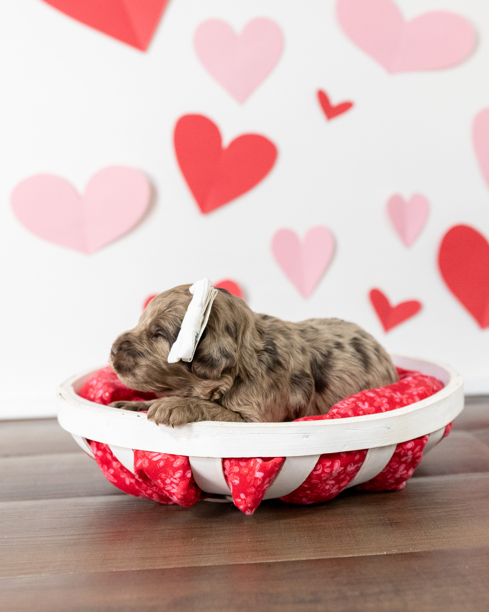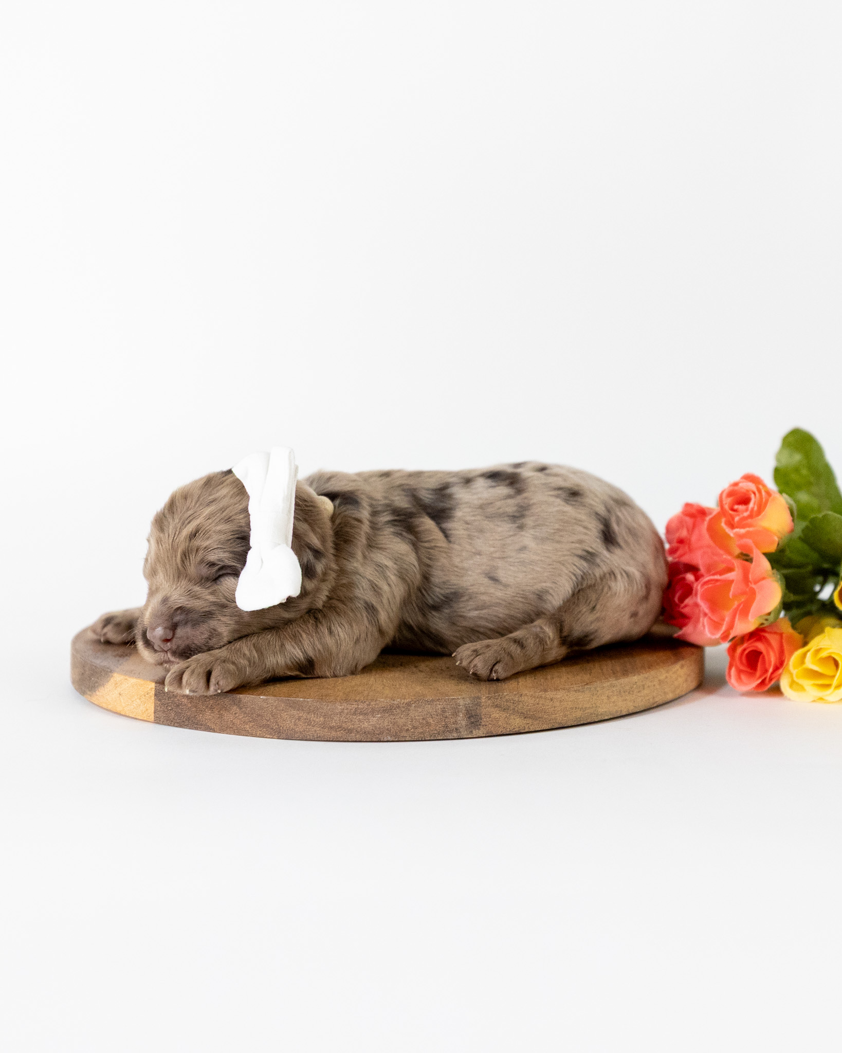 Izzy is a medium multigen Labradoodle puppy who will be ready for her forever home March 17th! Her soft, fluffy coat is hypoallergenic and non-shedding, ensuring endless snuggles without fear of allergic reactions.